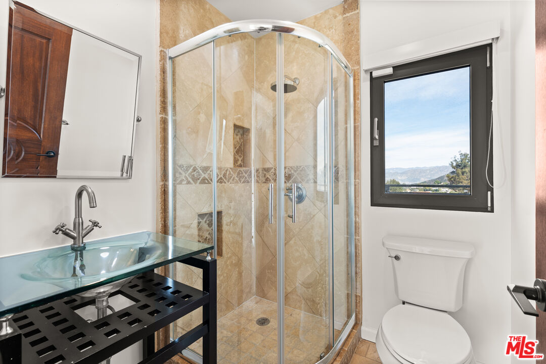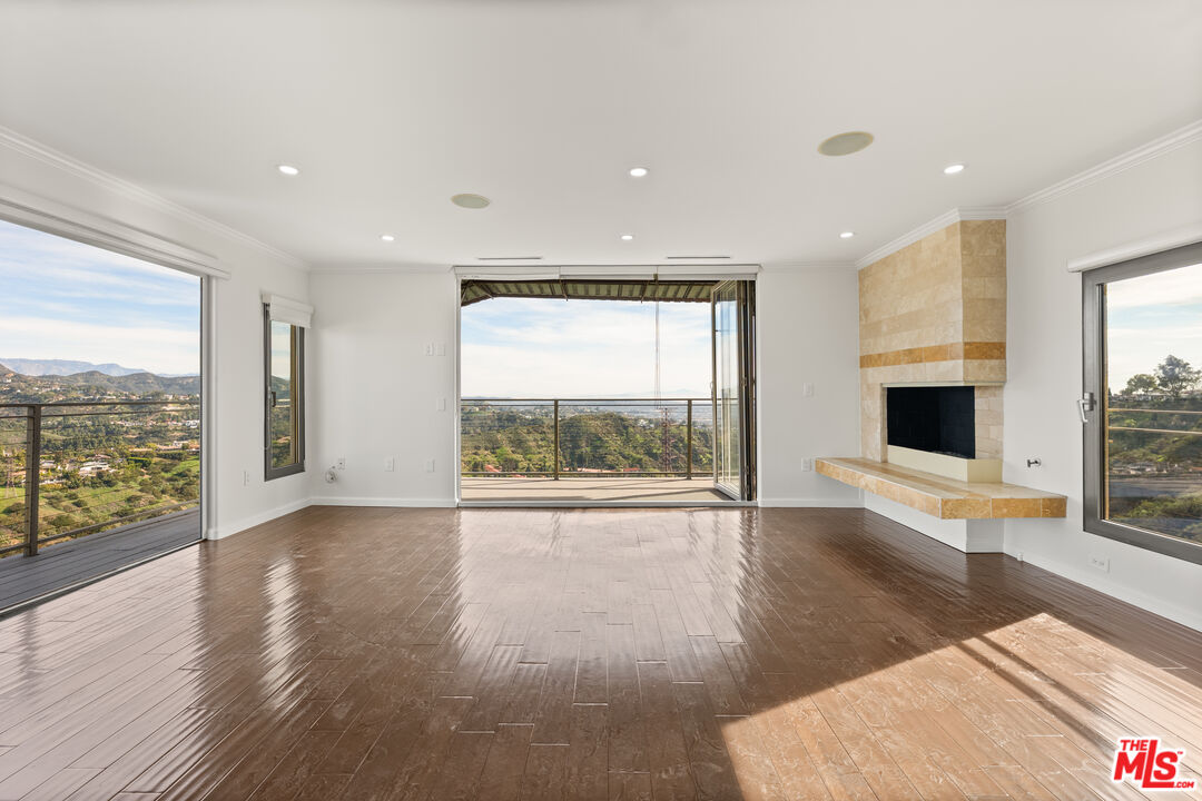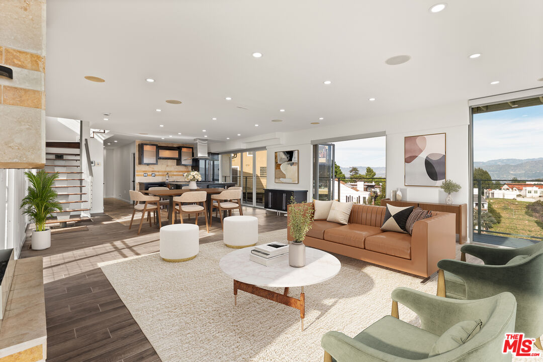 High above the city lights, with the Hollywood Sign and Downtown sharing the same cinematic frame, this renovated hillside residence delivers peak Los Angeles living. Walls of glass, sweeping terraces, and seamless indoor outdoor flow create a private sanctuary that feels both glamorous and effortless.The open concept living, dining, and kitchen space is wrapped in floor to ceiling glass, framing the Hollywood Sign on one side and the glittering Downtown skyline on the other. Accordion doors dissolve the line between inside and out, leading to a generous terrace designed for sunset cocktails, al fresco dinners, and intimate gatherings against a dramatic city backdrop.Thoughtfully renovated, the finishes balance modern sophistication with inviting warmth, while a main level bedroom and full bath offer flexibility for guests, office, or creative studio use. Upstairs, the primary suite becomes a true retreat with straight on cinematic views, a private terrace framed by accordion doors, a fireplace for cozy evenings, and an ensuite bath.Two additional upstairs bedrooms and a second bath provide space for family, guests, or a luxurious work from home setup, all oriented to capture light and views. A rare two car garage in the hills adds ease and practicality to this romantic perch above the city, making this more than a residence; it is a front row seat to the skyline and the quintessential Hollywood Hills lifestyle.