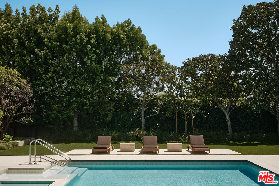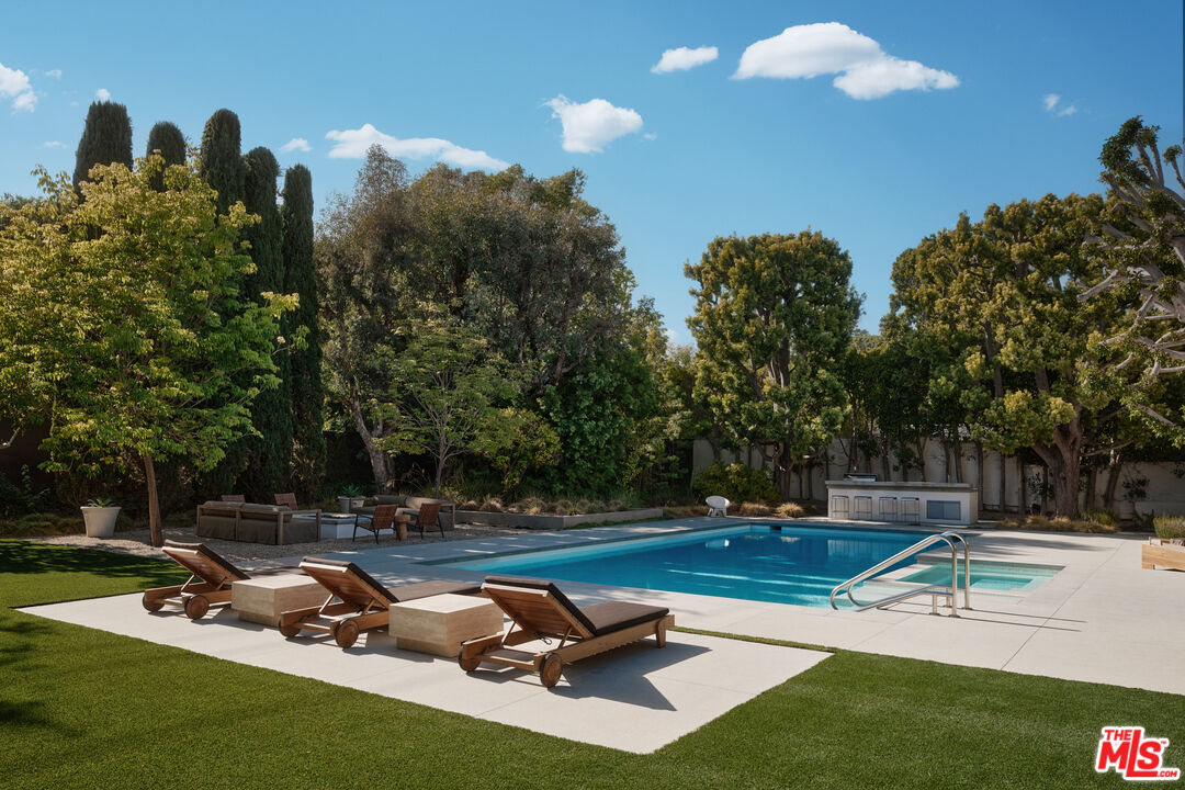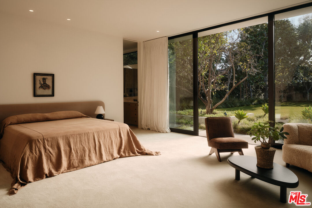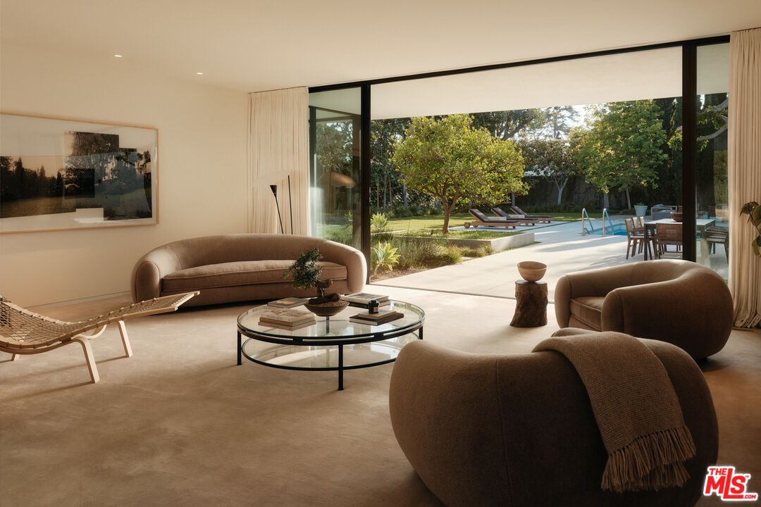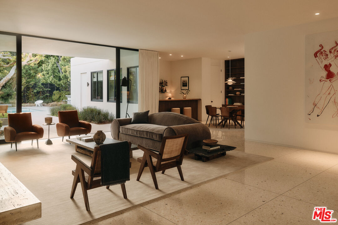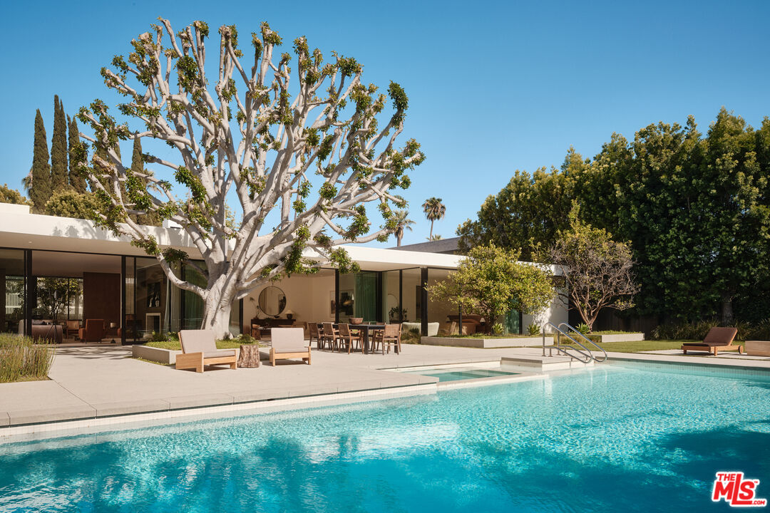 Discreetly nestled behind gates sits this light and bright iconic one-story mid-century home situated on a spectacular 27,800 sf lot. Designed in 1961 by Daniel Dworsky, the man behind Bradley's International Terminal at LAX, UCLA's Drake Stadium and the Federal Reserve Bank in Los Angeles. This flawless floor plan with high ceilings throughout was gutted and reimagined by Waldo Fernandez and has all the finishes appropriate for today's lifestyle. A double-door entry welcomes you into this 4-bedroom, 5-bath home, plus an attached gym/guest room. Floor-to-ceiling glass flanks the formal dining area, and the original double-sided fireplace anchors the living room and family room. Great walls for art, open floor plan, and terrazzo and hardwood floors compliment this extremely rare offering. A separate full bar and gourmet kitchen are perfect for large scale entertaining. Walls of glass overlook a park-like backyard, stunning pool, and outdoor kitchen.