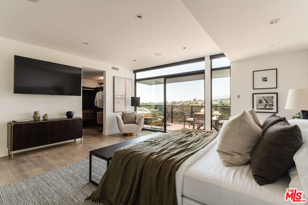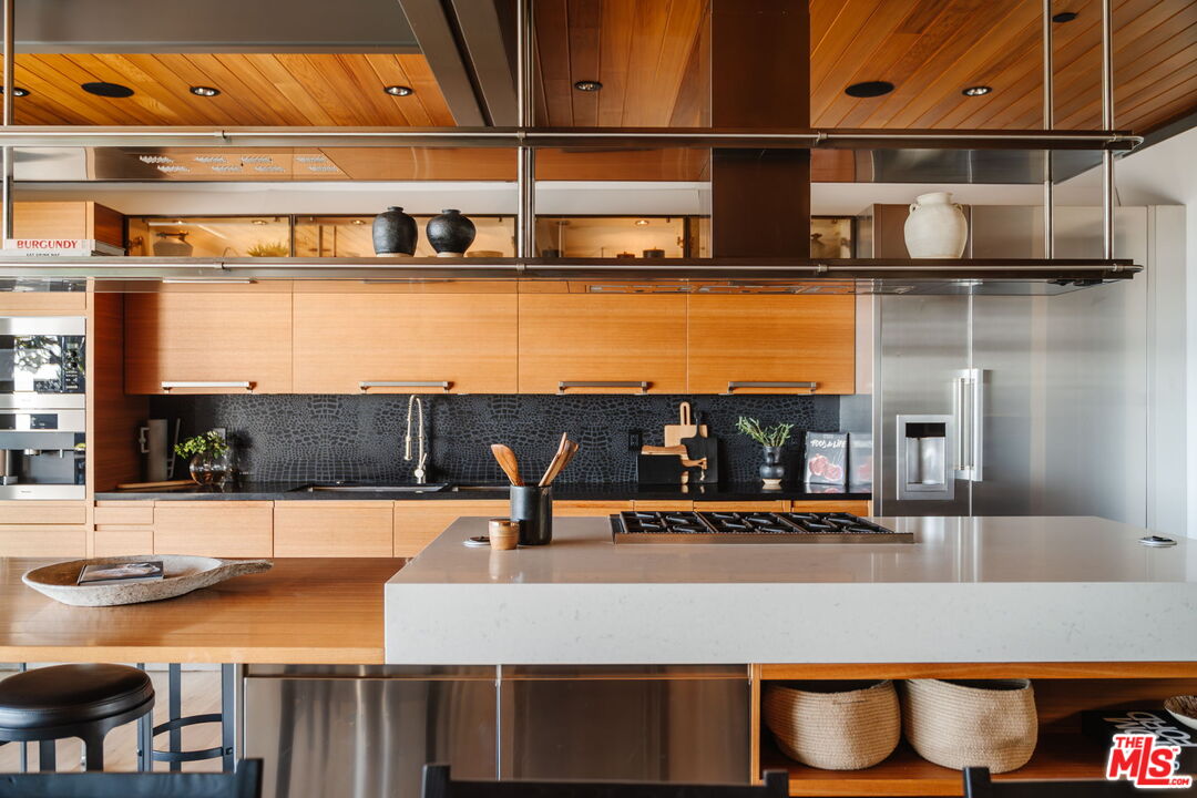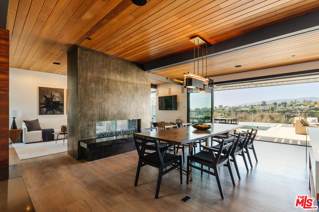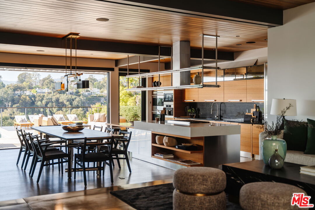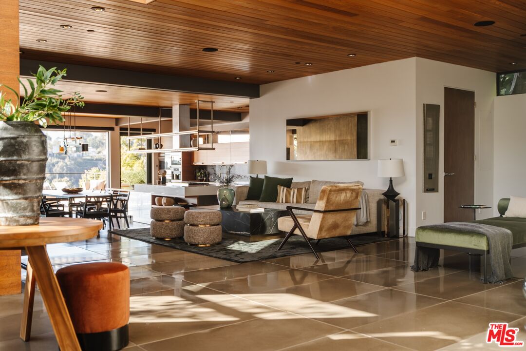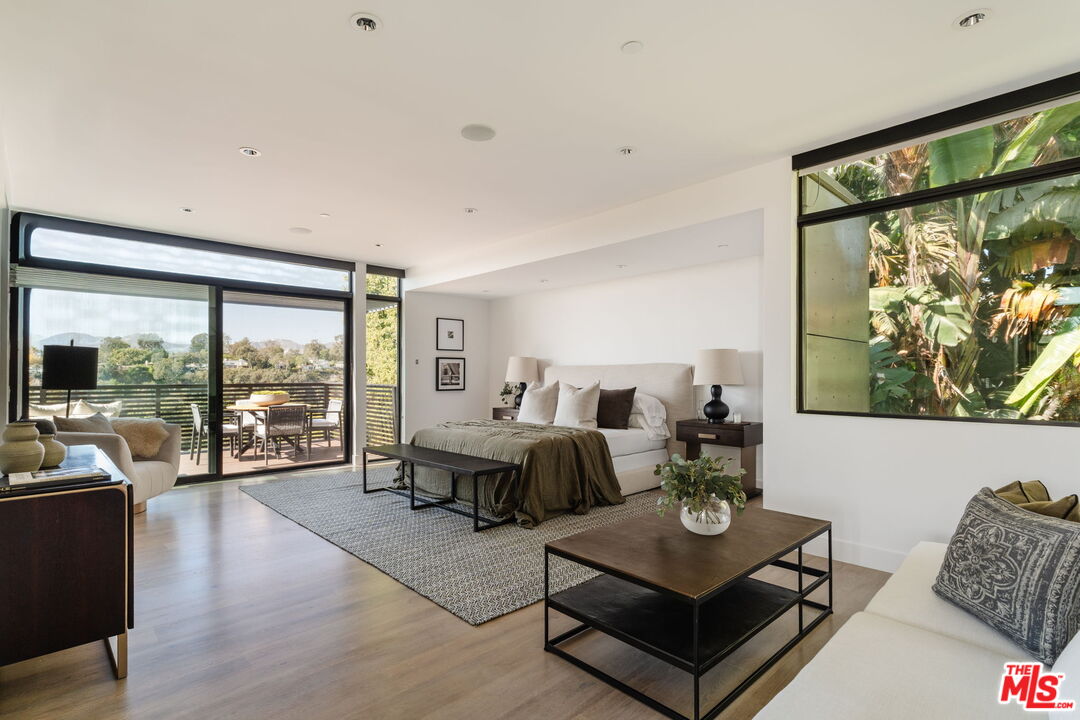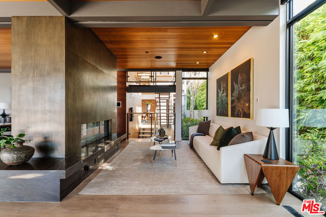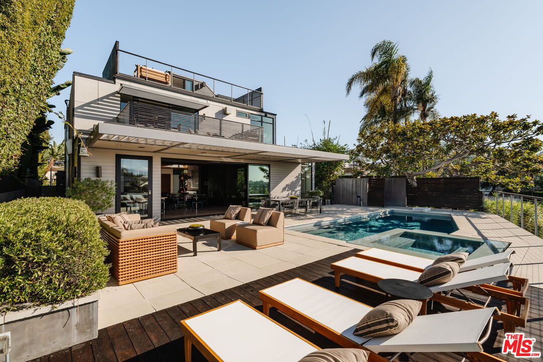 A modern architectural icon nestled in the coveted Santa Monica Canyon, 721 Adelaide Place exemplifies the visionary design of Ray Kappe, FAIA, whose renowned work defines the "apotheosis of the California House." This LEED Gold Certified residence seamlessly blends sculptural form, environmental sensitivity, and a profound connection to nature. Spanning nearly 5,000 square feet, the home is intentionally designed to celebrate volume, light, and awe-inspiring ocean, coastline, and mountain views. Upon entering, a dramatic two-story foyer sets an impressive tone. Here, a sleek floating staircase serves as a sculptural centerpiece, floor-to-ceiling glass walls allow radiant natural light to fill the space, and artisan craftsmanship is on full display with the use of wood, steel, and stone. Open-concept living and dining areas are positioned around a two-way Corten steel fireplace with a marble hearth, creating a sophisticated and inviting ambiance. The Arc Linea chef's kitchen is a showpiece of modern design and functionality, featuring a Crocodile Caesarstone backsplash, a butler's pantry, and professional-grade Wolf and Miele appliances. Retractable glass walls open the living areas to an outdoor sanctuary complete with covered and uncovered patios, a sparkling pool, an infinity-edged spa, an outdoor shower, and panoramic ocean and mountain views that elevate entertaining. Upstairs, the primary suite offers a retreat of exceptional comfort and style. Here, a private deck captures breathtaking views, while the custom-designed walk-in closet and luxurious ensuite--featuring dual vanities and an ocean-view shower--enhance daily living. Three additional bedrooms, including one on the main level, each open to private terraces, complemented by a versatile office and lower level media room. An expansive rooftop deck with a firepit crowns the home, offering a spectacular vantage for sunsets over the Pacific. Advanced smart home tech, including Control4 home automation, integrated surround sound, a Generac generator, and solar panels, ensures convenience and efficiency. Other notable features include mature landscaping that envelops the property in serenity and seclusion, a two-car garage, and automatic driveway and pedestrian gates. Supremely situated in one of Santa Monica's most desirable enclaves, this home captures the essence of California coastal living--mere moments from the beach, world-class dining and shopping along Ocean and Montana Avenues, and just minutes from the Riviera Country Club. 721 Adelaide Place stands as a testament to timeless modernism and coastal refinement, a rare architectural achievement where design and lifestyle converge.