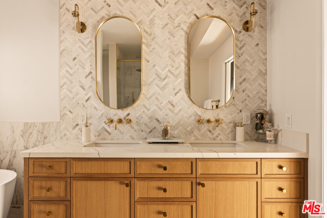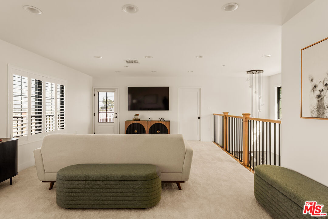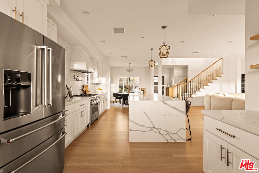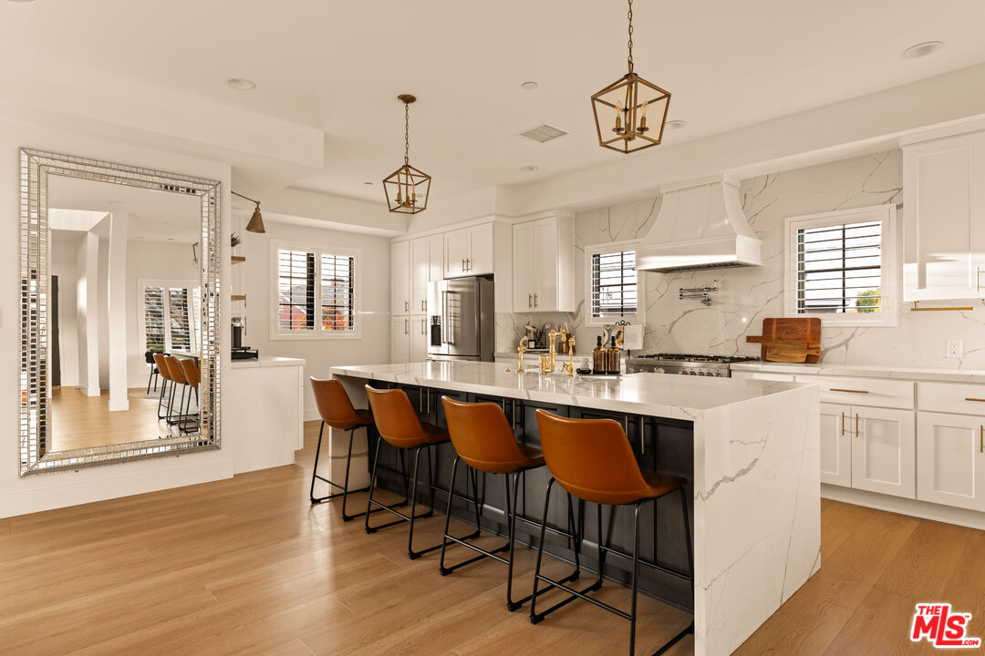 Perched on a premier corner lot in North Kentwood, this extensively rebuilt 2025 residence captures sweeping city, mountain, and peek-a-boo ocean views while offering the effortless indoor-outdoor lifestyle Southern California buyers seek. Originally built in 1953, the home underwent a comprehensive down-to-the-studs reconstruction and expansion. The property was rebuilt with entirely new electrical, plumbing, framing, insulation, ductwork, gas lines, drywall, windows, and structural systems throughout both levels. The result is a home that lives and feels like new construction. Step inside to discover a high-end gourmet kitchen, beautifully appointed with quartz countertops and backsplash, an oversized island, Bertazzoni range and hood, KitchenAid refrigerator, and a wine refrigerator perfectly designed for effortless entertaining. The adjacent great room, bathed in natural light, features a custom Milgard four-panel stacking slider that opens seamlessly to an expansive outdoor deck. Just beyond, the formal dining area and inviting family spaces create the ideal setting for intimate dinners or lively gatherings. On the first level, the luxurious primary suite awaits, complete with a custom walk-in closet and a spa-inspired bathroom showcasing marble finishes, quartz countertops, and a custom vanity. An additional bedroom or office on this level adds versatility and convenience. Ascend the custom stairway to the upper level, where two spacious secondary bedrooms are thoughtfully positioned on opposite sides of a generous family room. A convenient upstairs laundry room and a balcony with cozy seating provide the perfect place to unwind while taking in the home's panoramic vistas. Outside, the entertainer's backyard invites you to relax and enjoy the Southern California lifestyle with a built-in fire pit, outdoor TV, and two grassy play areas. The fully permitted ADU offers remarkable flexibility ideal for guests, extended family, or generating additional rental income. During the expansion, the home was thoughtfully enhanced with a new powder bath and stairway, while the front fade was completely reimagined with hand-cut Sierra White Limestone, creating a striking architectural presence and elevated curb appeal. Recent 2025 updates include a Presidential TL triple-layer shingle roof, fully paid Tesla solar panel system, custom security and weather shutters, fiberglass Andersen and Milgard windows with security window tint, solid wood doors throughout, plantation shutters and designer window treatments in every room, and a whole-home water softener and filtration system. Premium Arizona Tile finishes, all-brass plumbing fixtures, and Lutron smart lighting with LED switches complement the home's fully integrated smart-home system allowing you to control lighting, climate, and exterior features with ease from your phone.