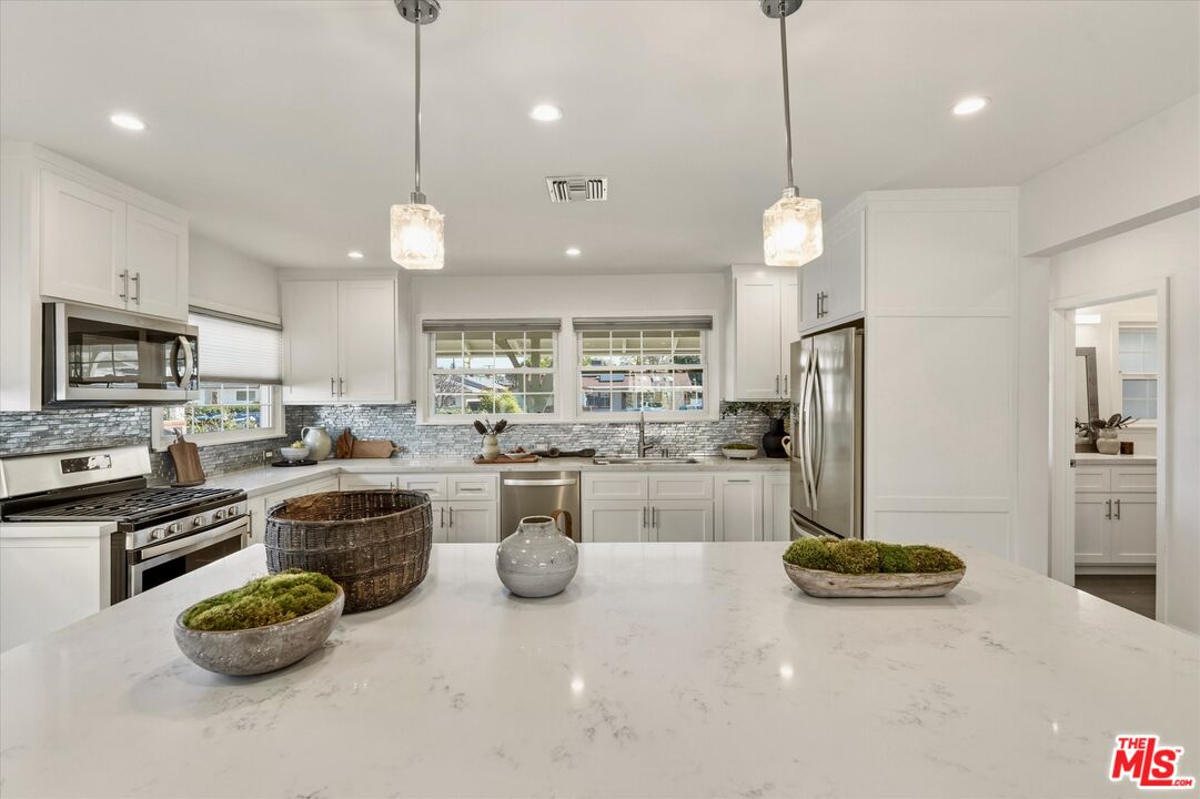 Tucked away on a quiet circular street with no through traffic, this fully updated 4-bedroom, 2-bath residence offers a rare sense of privacy , safety and neighborhood comfort. The expansive backyard, adorned with native low-water plants and trees, epitomizes the quintessential Californian lifestyle. Inside, an open-concept floor plan is filled with natural light and anchored by a large kitchen island that flows seamlessly into the dining and living areas, creating the perfect environment for entertaining.The kitchen is equipped with stainless steel appliances, ample counter space, and storage. Thoughtfully upgraded, generous storage, solar panels for energy efficiency, a landscaped backyard for indoor-outdoor enjoyment, and a 2-car garage make this home as functional as it is beautiful. Enjoy quick access to the 405 freeway for easy commuting and connectivity to the LA west side and the valley. **Exterior Photos are from the summer when trees were in full bloom**