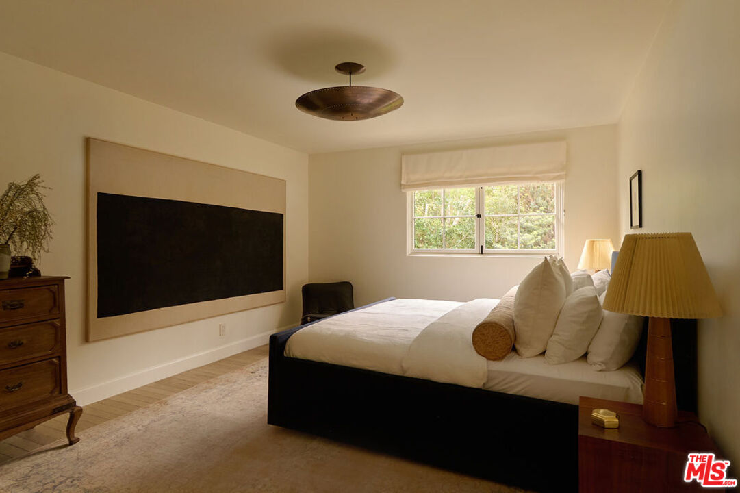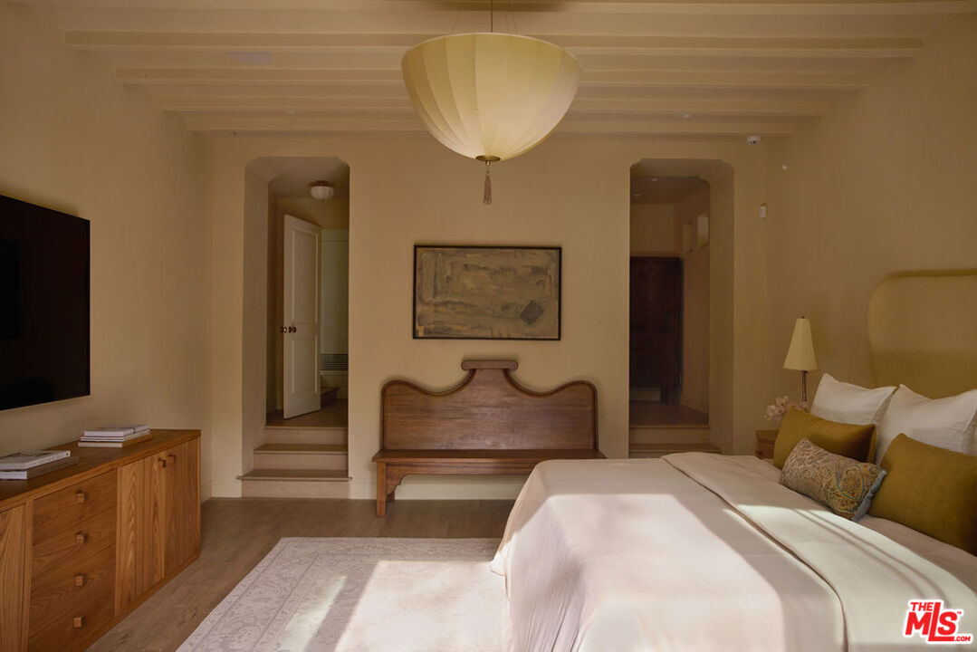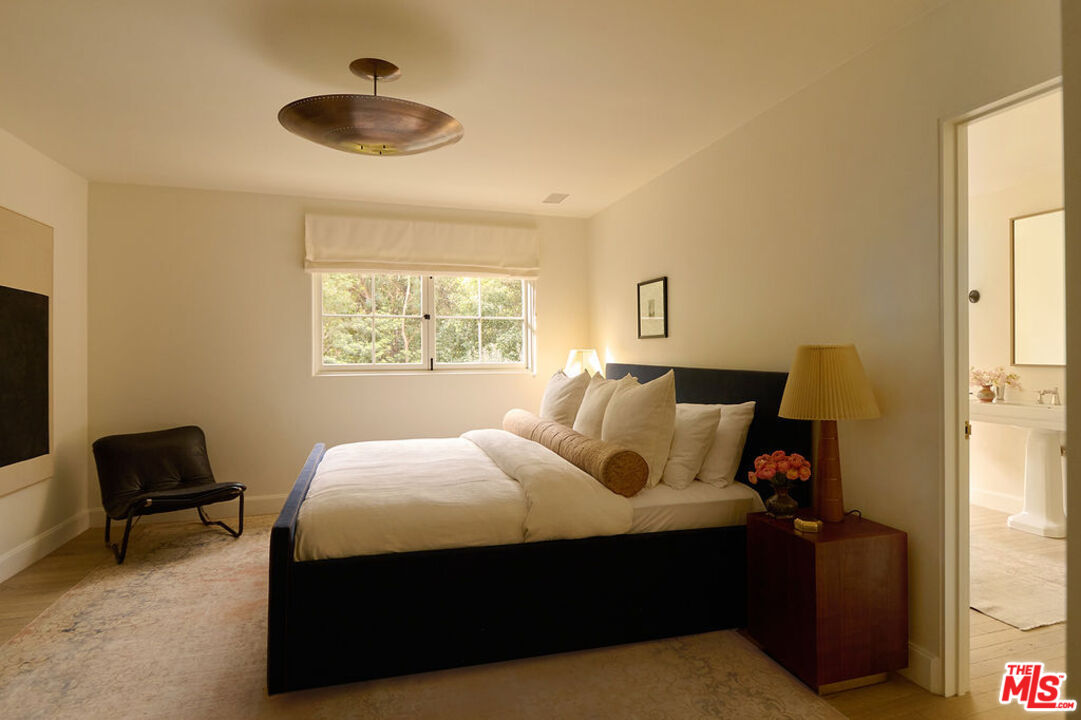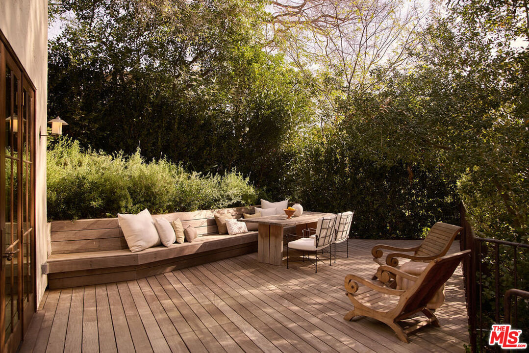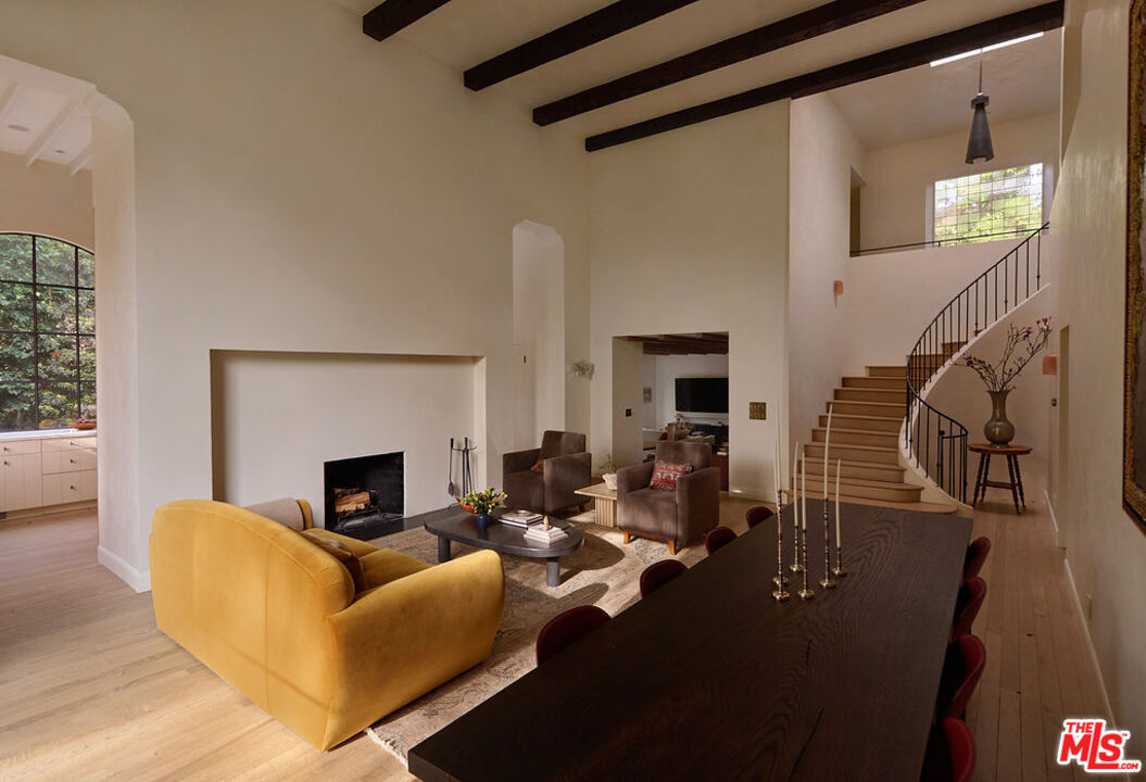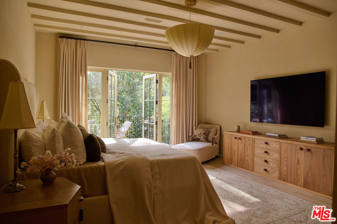 Nestled on a serene discreet street, this expansive Spanish estate embodies timeless elegance. Originally designed by architect Fred Smathers and exquisitely reimagined by Broad Project, the home seamlessly blends classical architecture with modern sophistication. Thoughtfully updated, this five-bedroom, five-bathroom residence is enveloped by lush, mature landscaping, including stately olive, citrus, and eucalyptus trees. A shimmering pool and spa, multiple outdoor living areas, and an exceptional floor plan create a truly idyllic retreat. Stepping through the foyer, you are welcomed by stunning European oak floors that set the tone for the home's refined aesthetic. The soaring living room ceilings enhance its sense of grandeur, while a large picture window bathes the space in dappled natural light. A striking fireplace, framed by Roman clay walls, serves as a focal point, complemented by bespoke built-in cabinetry and Fortuny lighting. The kitchen is a true masterpiece, featuring arched steel windows, a coveted Lacanche range, and a meticulously crafted solid oak island. Designed for both beauty and function, it flows seamlessly into the informal living room, where French bifold doors open to an expansive outdoor sanctuary ideal for effortless indoor-outdoor living. The primary suite is a private haven of impeccable design, with French doors leading to a secluded patio. Its spa-like ensuite bath is adorned with old-growth walnut built-ins, a luxurious soaking tub, a walk-in steam shower, and a generous walk-in closet. Two additional bedroom suites each offer elegantly appointed baths and spacious walk-in closets. Adjacent to the pool, a separate living space with a bar provides exceptional versatility for entertaining. Complete with a sauna and cold plunge, it serves as a refined wellness retreat, perfectly suited as a home gym, office, or guest quarters. An exceptional property of beauty, tranquility, and understated luxury, offering warmth, privacy, and an unparalleled living experience.