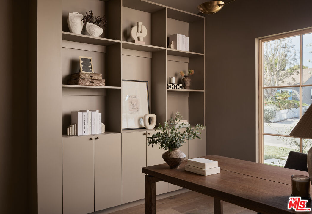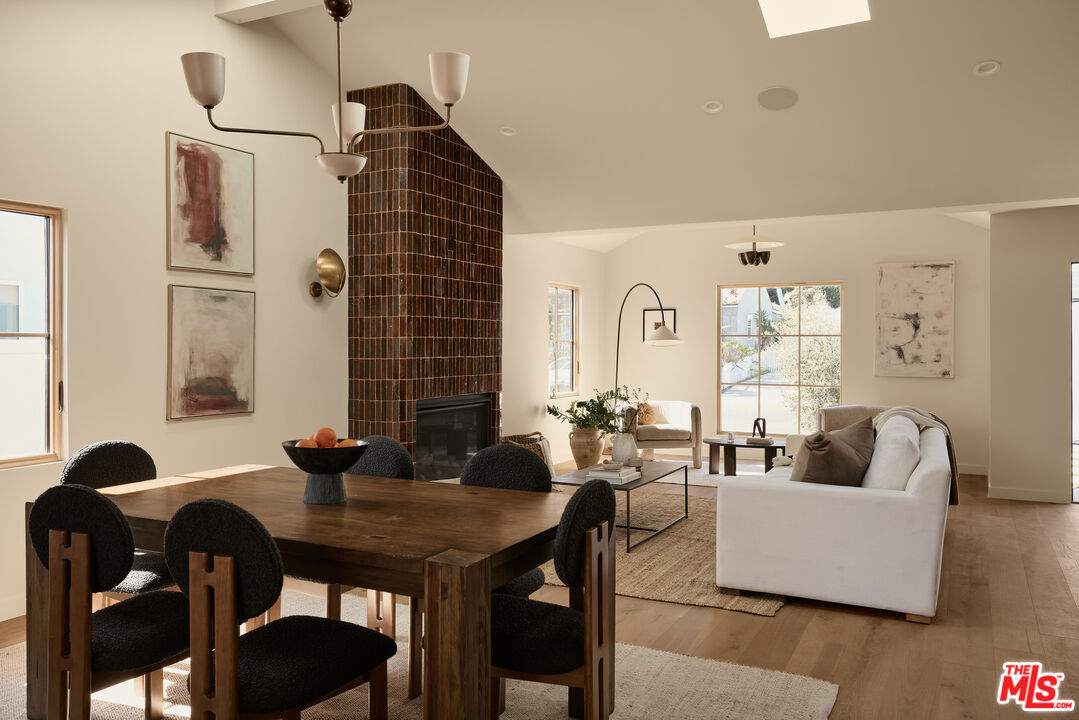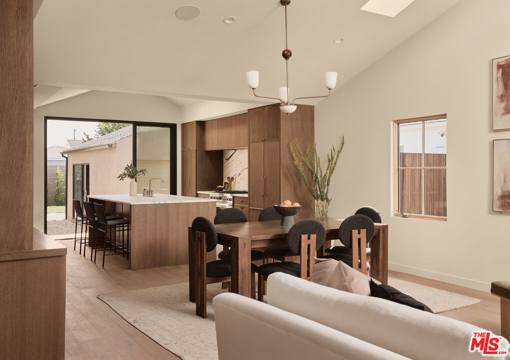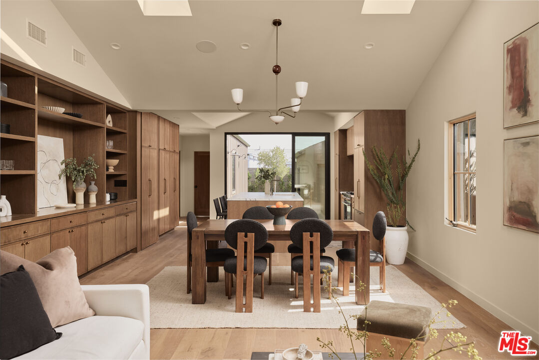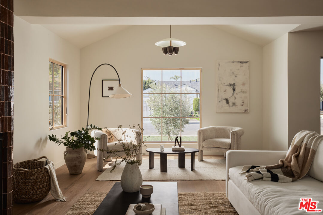 Step into a true designer showpiece, where every element has been thoughtfully hand-crafted and flawlessly executed. Warm plank oak floors set an inviting foundation, complemented by dark walnut stained custom oak millwork throughout, creating a sense of effortless, understated luxury that feels both refined and welcoming. Zia tile adds character and artistry, featured along the bar backsplash, and dramatically framing the fireplace in the great room. In the kitchen, a seamless oak facade conceals the Fisher & Paykel refrigerator, while an enclosed stove hood allows the cabinetry to flow cohesively. Throughout the home, all countertops are crafted from natural stone. The kitchen island stands out with a smooth-honed, Italian-style marble showcasing bold, one-of-a-kind veining. Tucked discreetly behind a hidden doorway is a bonus "secret" kitchen, perfect for additional appliances, messier prep, and expansive pantry storage. The primary suite features pitched ceiling and oversized sliders that open directly to the back garden. The spa-like bath offers an open tub and shower concept, accented by thoughtfully placed Phylrich fixtures and in-wall plumbing designed to enhance comfort. Two additional generously sized bedrooms are complemented by beautifully designed bathrooms. The powder room adds a dramatic touch, showcasing a solid Calacatta Viola marble sink with a fluted profile that elevates the space. A flexible office at the front of the home includes built-in shelving and a closet, allowing it to also be a guest bedroom, cinema room, or music studio. Throughout the residence, designer sconces and striking light fixtures are carefully curated and intentionally placed, while in-wall speakers provide seamless in-home audio. The backyard offers a range of possibilities, from alfresco dining to a cozy fire pit retreat. Rounding out the property is a fully drywalled garage, presenting an ideal opportunity for conversion into an ADU, yoga studio, or home gym just to name a few!