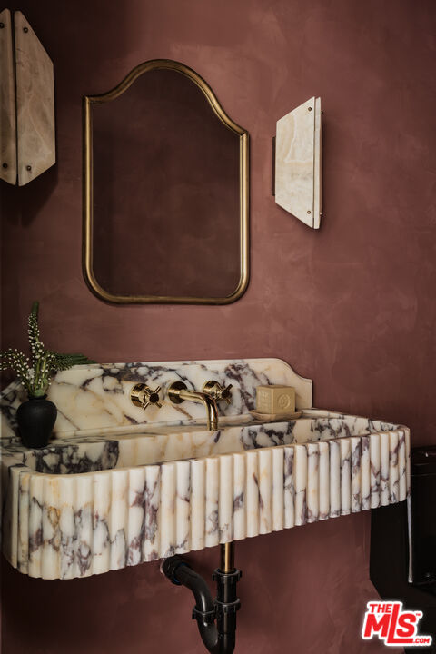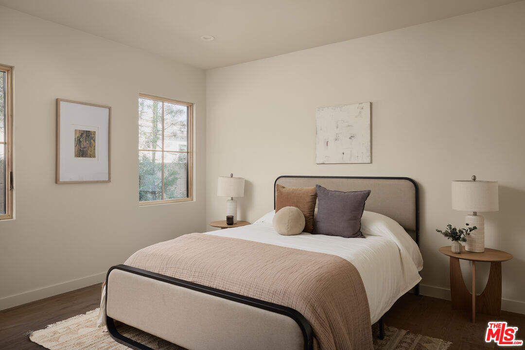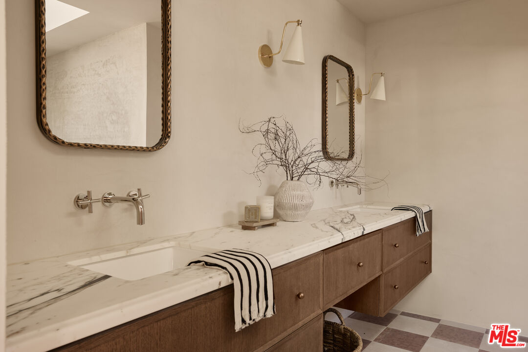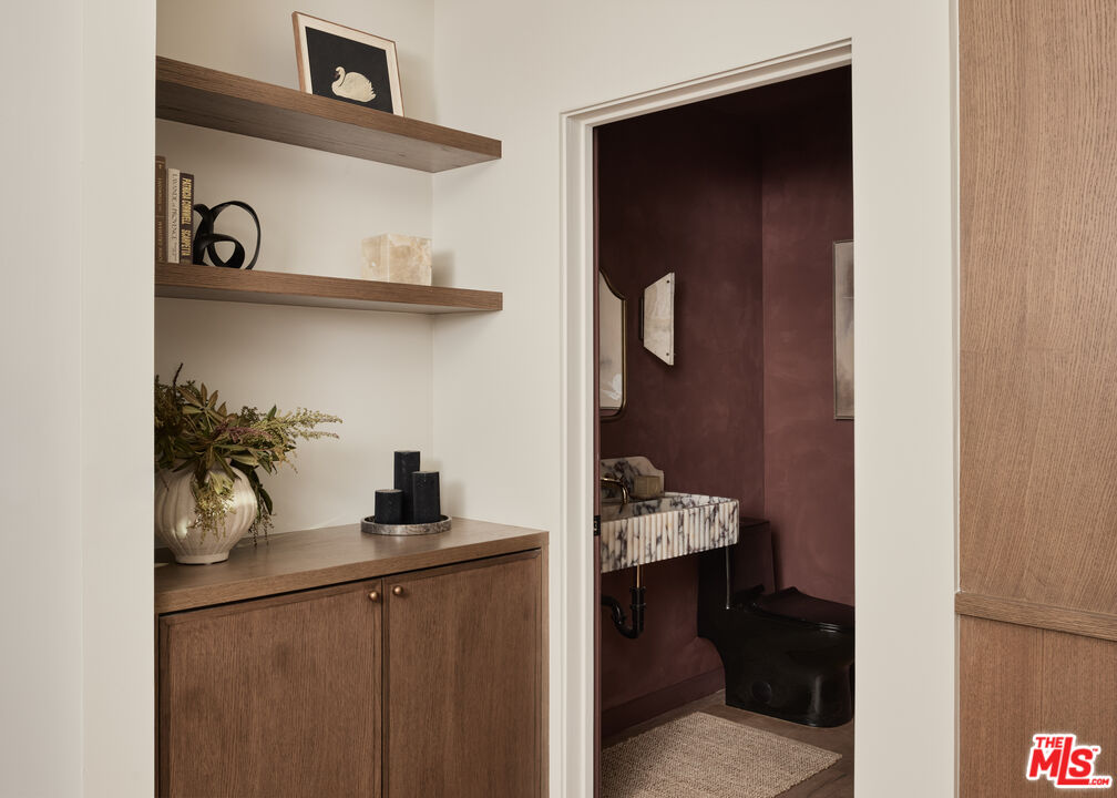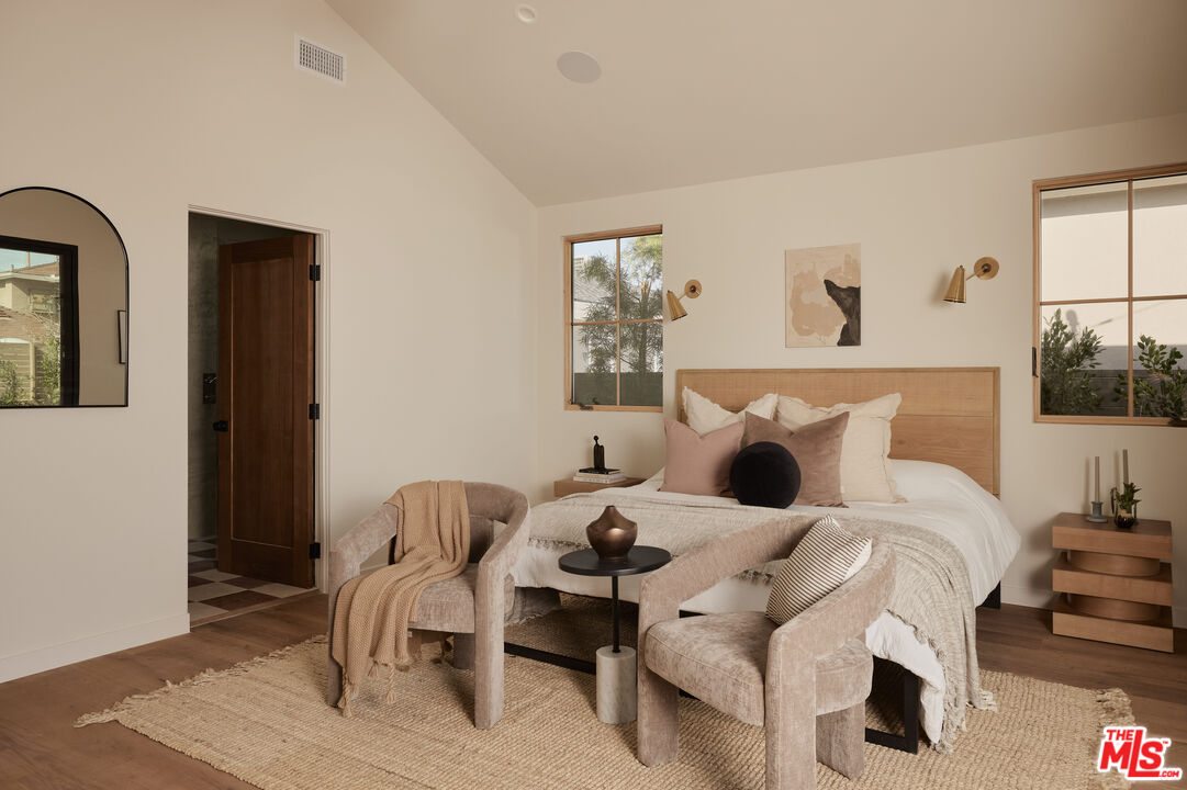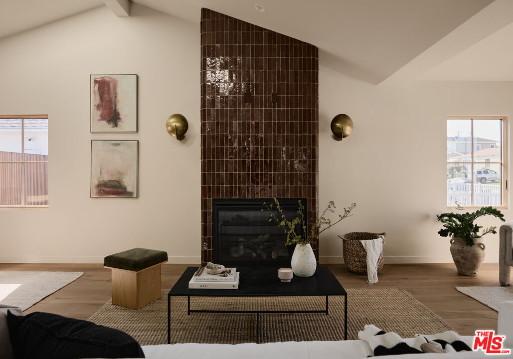 Step into a true designer showpiece, where every element has been thoughtfully hand-crafted and flawlessly executed. Warm plank oak floors set an inviting foundation, complemented by dark walnut stained custom oak millwork throughout, creating a sense of effortless, understated luxury that feels both refined and welcoming. Zia tile adds character and artistry, featured along the bar backsplash, and dramatically framing the fireplace in the great room. In the kitchen, a seamless oak facade conceals the Fisher & Paykel refrigerator, while an enclosed stove hood allows the cabinetry to flow cohesively. Throughout the home, all countertops are crafted from natural stone. The kitchen island stands out with a smooth-honed, Italian-style marble showcasing bold, one-of-a-kind veining. Tucked discreetly behind a hidden doorway is a bonus "secret" kitchen, perfect for additional appliances, messier prep, and expansive pantry storage. The primary suite features pitched ceiling and oversized sliders that open directly to the back garden. The spa-like bath offers an open tub and shower concept, accented by thoughtfully placed Phylrich fixtures and in-wall plumbing designed to enhance comfort. Two additional generously sized bedrooms are complemented by beautifully designed bathrooms. The powder room adds a dramatic touch, showcasing a solid Calacatta Viola marble sink with a fluted profile that elevates the space. A flexible office at the front of the home includes built-in shelving and a closet, allowing it to also be a guest bedroom, cinema room, or music studio. Throughout the residence, designer sconces and striking light fixtures are carefully curated and intentionally placed, while in-wall speakers provide seamless in-home audio. The backyard offers a range of possibilities, from alfresco dining to a cozy fire pit retreat. Rounding out the property is a fully drywalled garage, presenting an ideal opportunity for conversion into an ADU, yoga studio, or home gym just to name a few!