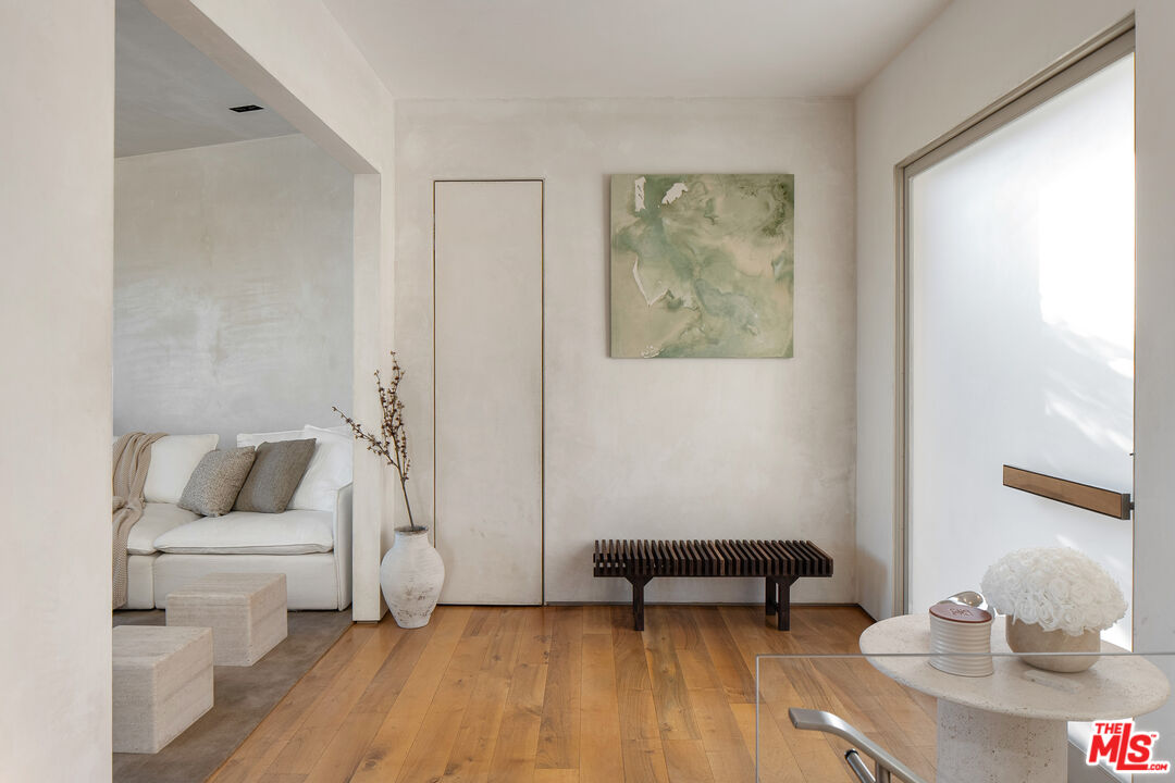 This privately-gated and former celebrity-owned contemporary hideaway sits above it all, with jetliner views stretching from Downtown LA to Century City and out to the ocean. Framed by a dramatic pivot door, the designer-done home opens to soaring ceilings, smooth Venetian plaster, hardwood floors, and sun-drenched interiors that exude a sophisticated and organic feel. The main level showcases a spacious formal living room that flows seamlessly into the dining area and chef's kitchen, designed for both effortless entertaining and everyday living. The relaxing primary suite offers a travertine-cladded spa-like bathroom with walk-in shower and separate soaking tub, a picture window framing endless panoramic vistas, and an oversized walk-in closet. Two additional guest bedrooms are replete with en-suite baths and private balconies, with an additional flexible space that can serve as a screening room, office, or fourth bedroom. Outdoors, this estate takes entertaining to the next level with a newly added outdoor kitchen/BBQ, in-ground spa, sauna, outdoor shower, and dramatic outdoor fireplace with built-in seating providing the perfect stage for al-fresco dining, sunset gatherings, or simply unwinding above the city lights. With a prestigious history, unmatched style, and coveted location just moments from the Sunset Strip and West Hollywood, this residence is truly a private retreat set against one of the most breathtaking backdrops in Los Angeles.