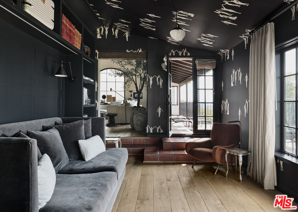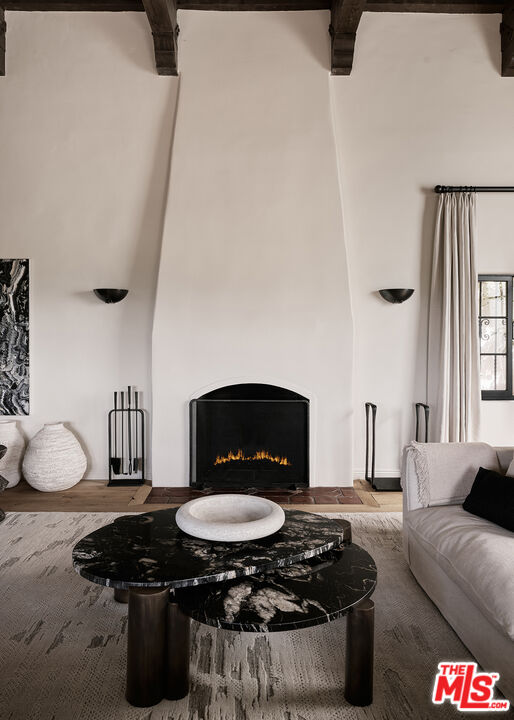Behind wooden gates in the Hollywood Hills, a reimagined 1920s Spanish residence unfolds with remarkable privacy, architectural integrity, and a city panorama that stretches endlessly beyond its walls. Thoughtfully remodeled by designer Hilary Madigan, the home honors its original character while introducing a level of finish and technology rarely found in historic properties. At the heart of the main level, a dramatic living room is framed by a double-height vaulted ceiling and exposed beams, anchored by a wood-burning fireplace. Arched plaster openings and original tile underfoot guide the natural flow into a formal dining room where French doors open to uninterrupted city views, offering a moment that feels both expansive and intimate.The kitchen is a study in quiet luxury, centered around a La Cornue range and Waterworks fixtures, with integrated Meile appliances and warm, reclaimed wood flooring grounding the space. Throughout the home, the lighting and AV systems have been fully upgraded, with a complete Savant integration for home automation, audio, and visual controlspaired with Lutron Homeworks lighting and a nine-camera security system via Verkada, delivering seamless control and peace of mind. Every bathroom has been redesigned with intention and restraint, outfitted with Waterworks fittings and Toto toilets, continuing the home's throughline of elevated functionality.A sweeping staircase leads to the home's lower level where all three bedrooms are thoughtfully placed. The primary suite, with dual Juliet balconies, includes a custom walk-in closet and dressing area that opens into a tranquil, spa-inspired bath. Two additional bedrooms each offer en-suite baths and bespoke storage. The former basement has been converted into a refined flex spaceideal for a gym, home office, or studio. Designed for effortless indoor-outdoor living, the property invites connection to the surrounding landscape from both levels, while modern systems such as a new HVAC, tankless boiler, and EV-charging-equipped garage ensure contemporary comfort throughout. Offered optionally furnished, and reflecting over $2 million in renovations, this is a home that captures the essence of Old Hollywood while delivering a lifestyle firmly rooted in the present.