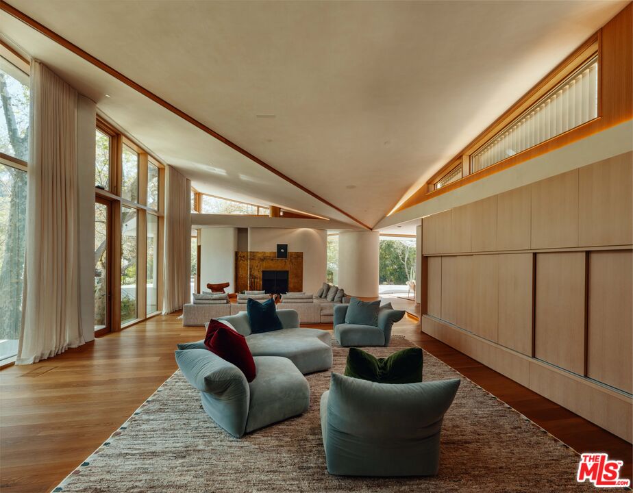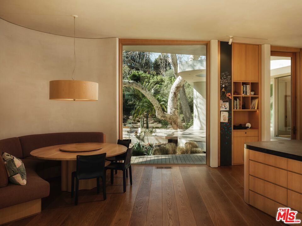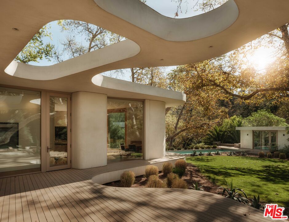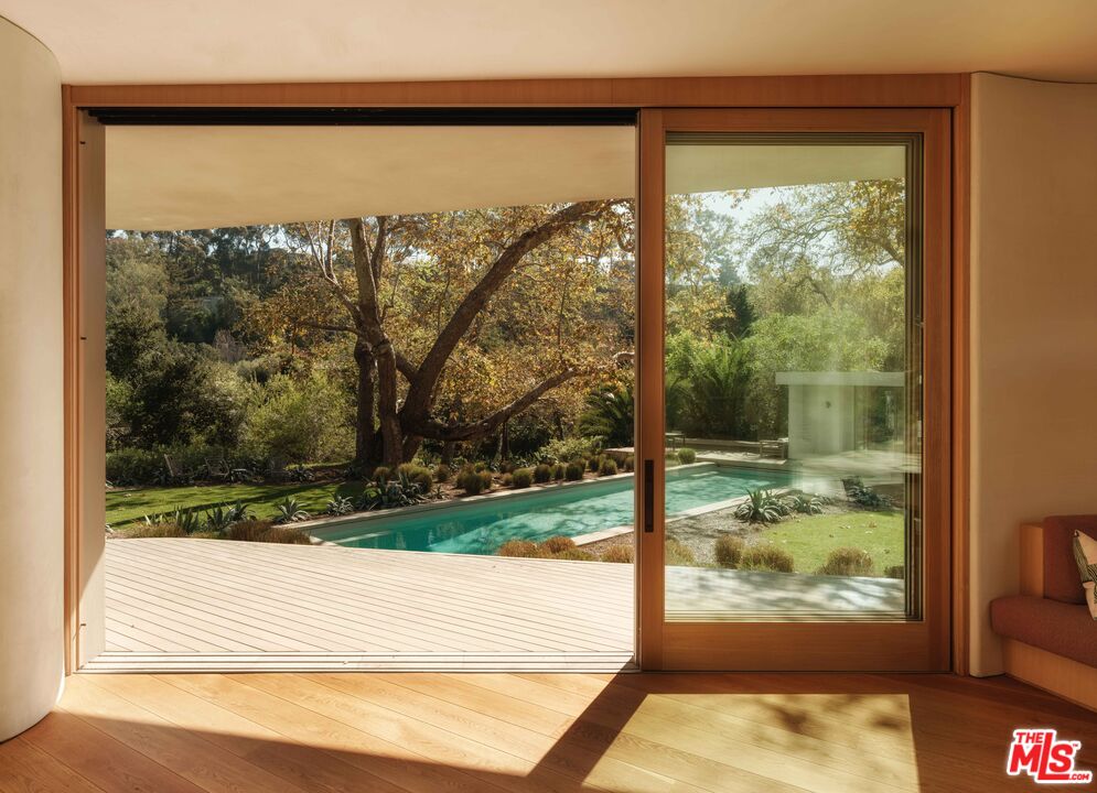 Where architecture becomes atmosphere, 800 Brooktree Road is a rare sanctuary shaped by nature, light, and intention. Conceived by acclaimed architect Bill Neburka, this custom-built estate spans more than an acre in Rustic Canyon, its sculptural curves and soft, modern lines flowing effortlessly with the surrounding landscape. Encompassing 9,708 square feet across two levels, the eight-bedroom, six-and-a-half-bath residence is a masterclass in thoughtful scale, organic materiality, and quiet luxury. Floor-to-ceiling windows framed in natural wood create living portraits of the outdoors, revealing stands of mature native sycamores and coastal oaks, with more than 20 trees shading the meticulously maintained grounds. Two nearby creeks provide a year-round soundtrack of flowing waterjoined in summer by a gentle chorus of frogs enhancing the home's serene, retreat-like setting. The entrance offers an artful first impression with hand-fired tile and a striking abstract sycamore installation by artist Sofia Londono, setting the tone for the home's nature-driven ambiance. Interiors by Jeff Guga feature soaring ceilings, wide-plank white oak floors, and soft-hued walls finished in hand-troweled Clayworks plaster. A refined palette of wood, clay, and brass was meticulously selected for warmth, durability, and timeless appeal. No detail has been overlooked. Highlights include handcrafted California-made floor tiles by Heath Ceramics, brass plumbing fixtures by Vola, custom lighting with LED skylights, and Reveal lift-and-slide doors forming seamless walls of wood-framed glass. The chef's kitchen, music room, and living room each crowned by 15-foot ceilings open to a stunning grove of sycamores, while the primary suite enjoys tranquil views of coastal oaks. Expansive Alaskan cedar decks extend the living spaces outdoors, overlooking landscape design by Jay Griffith. A 60-foot saline lap pool and a standalone pool house with an additional bedroom and full bath complete the resort-caliber grounds. Built in 2022 by world-class craftsmen, this architectural statement embodies a refined minimalist ethos, moving in harmony with the land's natural contours. Ultra-private yet remarkably convenient, the property is less than five minutes from the beach, Palisades Park, the boutiques and cafes of Montana Avenue, and the vibrant offerings of Downtown Santa Monica.