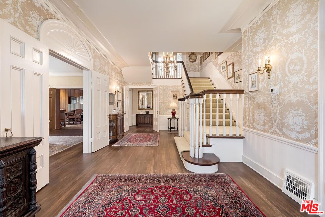 Trust Sale - 1st time available in 50 years. This stately center-hall 2sty East Coast Colonial exhibits total charm and character while sitting on a tremendous lot with 100 feet of frontage at the 50-yard line of one of the Beverly Hills' Westend Flats most prestigious 800 blocks. Spacious rooms featuring wood floors, mouldings, high ceilings, and abundant natural light. Grand deep entry foyer with dramatic staircase leads to enormous and gracious living and dining rooms. Living room opens to a huge Great Room with bar and fireplace flowing to the massive grounds with extensive patio space, BBQ center, endless lawns and mature foliage. 4 generous bedrooms (3BD + convertible library) and a quaint sunlit office upstairs with maid's quarters downstairs. The mammoth primary suite includes a sitting area, fireplace, and a big dressing room. Large chef's kitchen and breakfast area. A central 'mud room' is downstairs and opens to the grounds. A sizeable guest house of 571 sq ft sits atop the garage and storage room with 2 possible bedrooms, kitchen, and bathroom. This is truly a rare generational opportunity to acquire a 'trophy property' with a plethora of potential. Sold in strictly "as is, where is" condition.