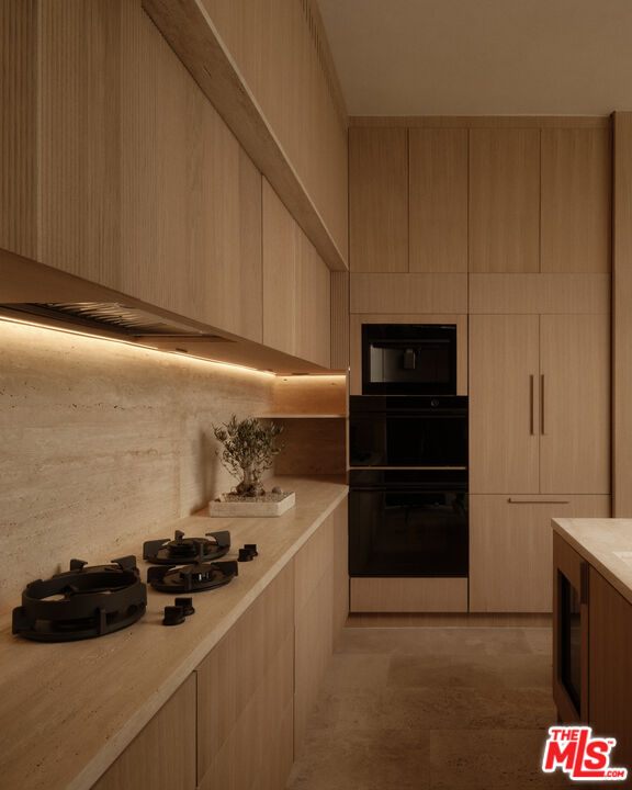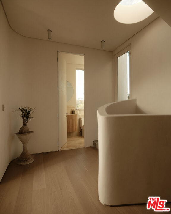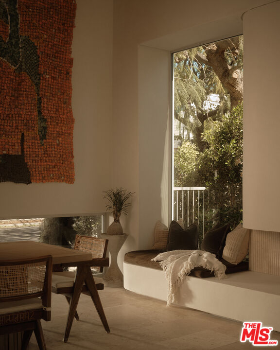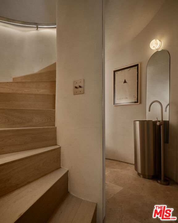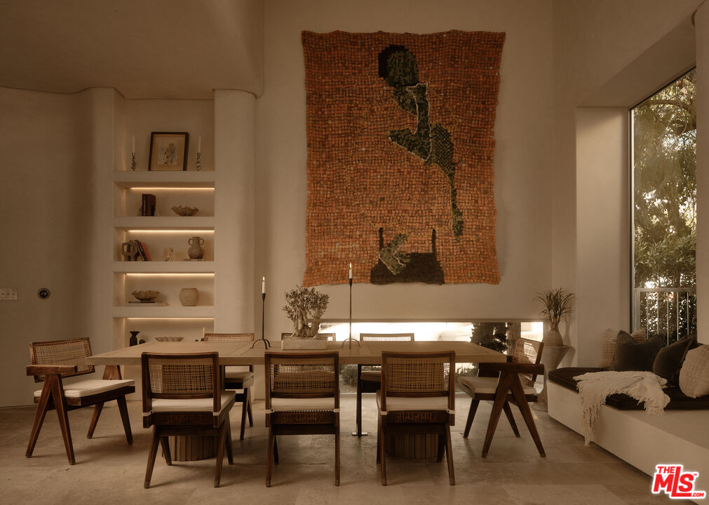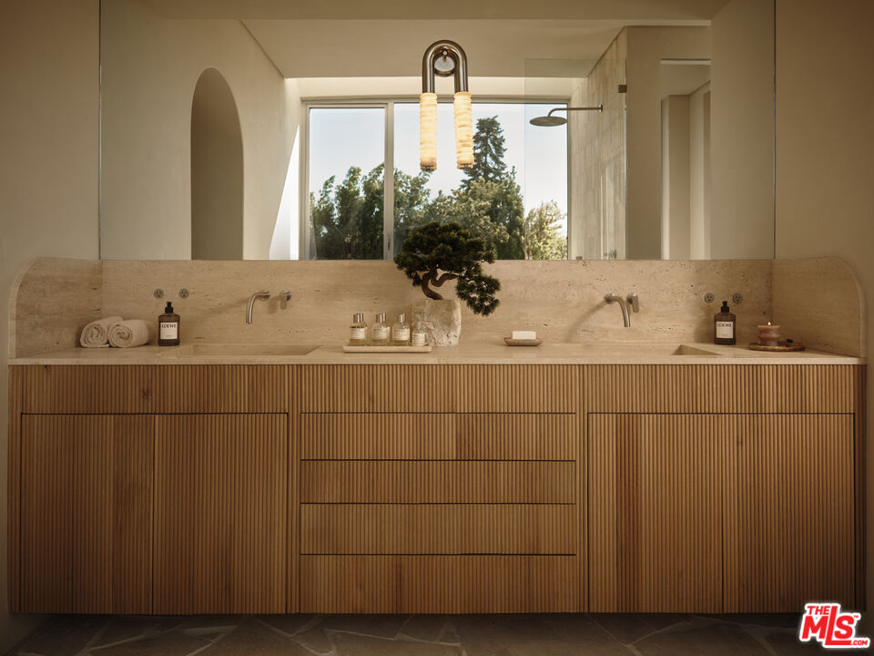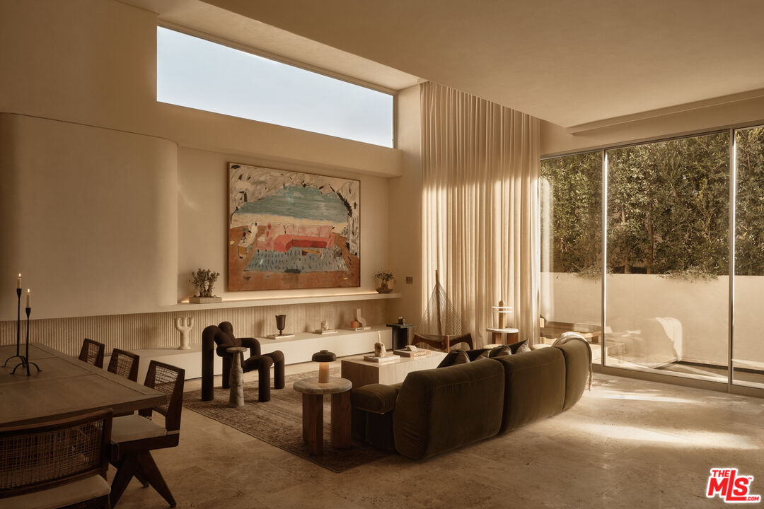 An architectural home defined by craftsmanship, materiality, and atmosphere in a highly coveted West Hollywood enclave. This 3 bedroom, 3.5 bath home balances flowing curves with luxurious interiors and a highly refined material palette. Travertine floors and surfaces, custom white oak cabinetry, and hand-applied plaster walls create depth and continuity throughout, while natural light moves seamlessly across the interiors, emphasizing texture, curvature, and proportion. Every element is intentional, prioritizing quality, restraint, and livability. The private rear yard is anchored by a 35-foot travertine-clad lap pool surrounded by greenery, offering a quiet retreat while also seamlessly integrating with the interior. Above, an expansive rooftop deck captures sweeping hills views; idyllic for entertaining and indoor/outdoor living. A rare architectural offering defined by atmosphere and enduring modernity.
