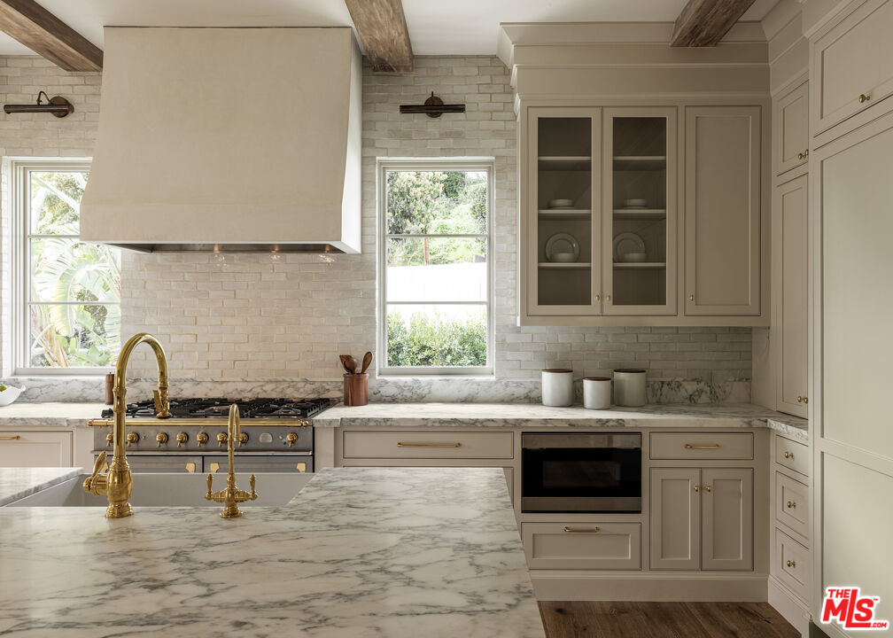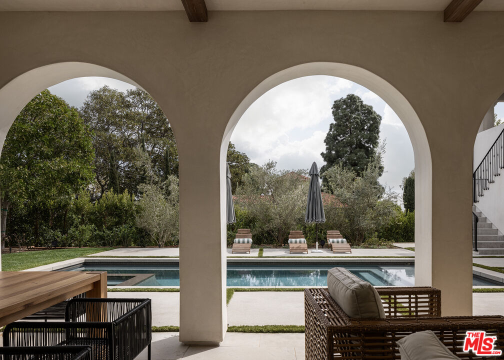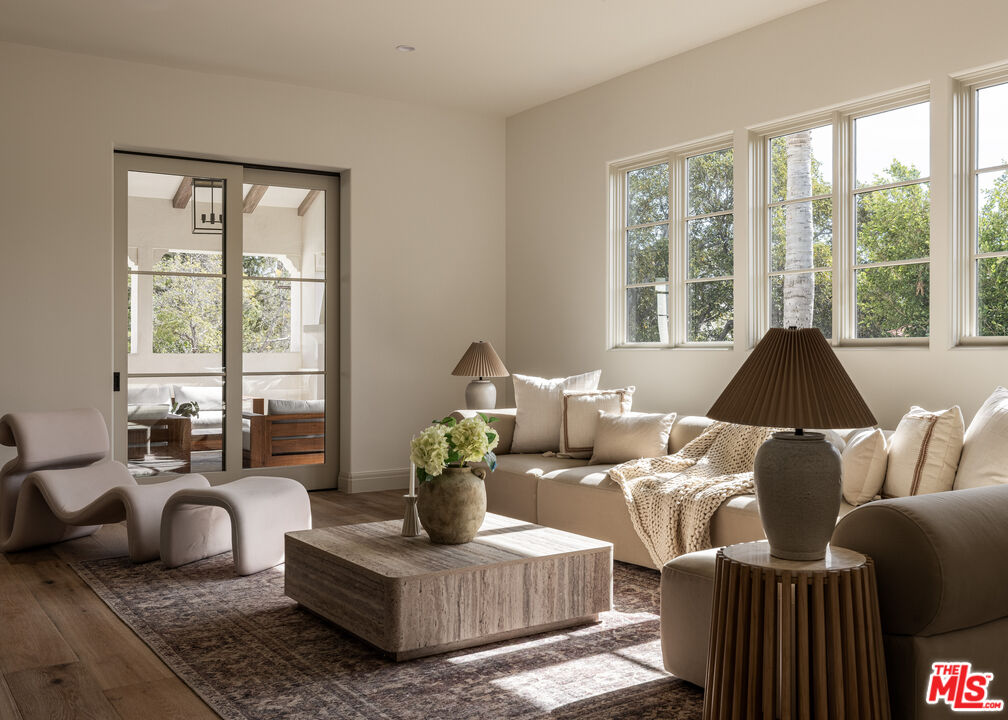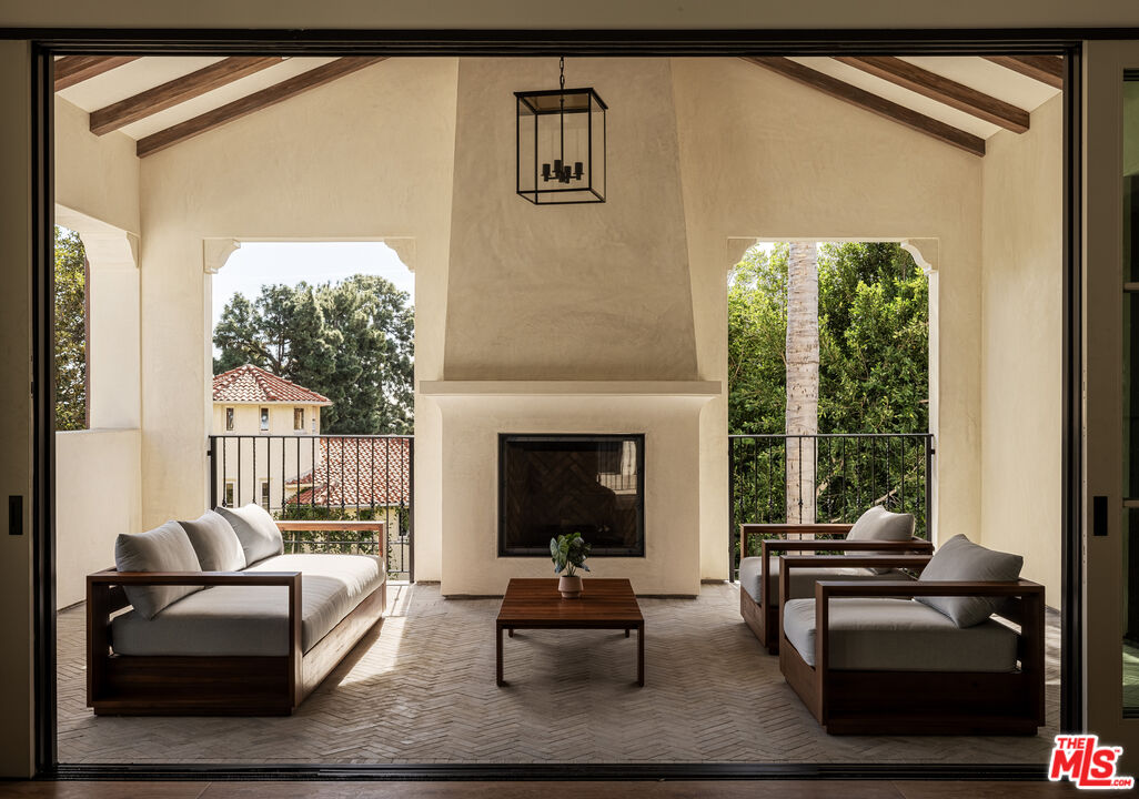 A stunning new contemporary Mediterranean estate perfectly situated in the Hollywood Hills, just moments from Sunset Boulevard and the famed Chateau Marmont. Encompassing approximately 5,800 square feet, this five bedroom, seven-bath residence blends timeless sophistication with modern luxury, highlighted by vaulted wood-beam ceilings, curated natural finishes and expansive walls of glass. The interiors flow effortlessly from elegant living spaces to serene outdoor retreats, including a covered terrace with fireplace framing lush canyon views. A gourmet kitchen featuring a La Cornue French range, Aresbescato marble countertops, and hand-worked bronze Waterworks fixtures flows into a bright breakfast nook with serene tree lined views. Each en-suite bedroom opens to a private terrace garden surrounded by lush grounds leading to a dramatic pool and spacious covered cabana. A sweeping motor court of hand-laid stone sets a dramatic tone from the moment you arrive, combining generous parking with the grandeur of a true estate approach. The detached ADU offers a private retreat with lush greenbelt views, complete with custom cabinetry, tailored finishes and abundant natural light - ideal for guests, extended stays, or creative use. Additional highlights of the main residence include a graceful spiral staircase descending to a distinctive lower-level landing area, a private home office with bespoke wood shelving, and a luxury screening room designed for an immersive cinematic experience.