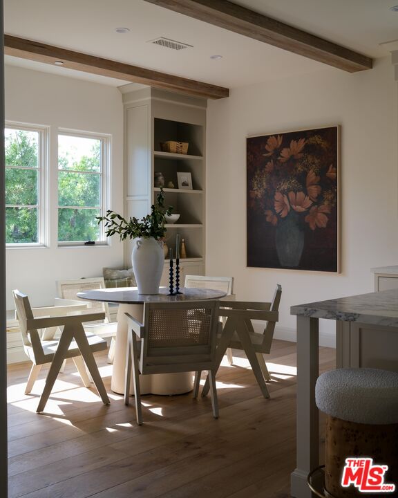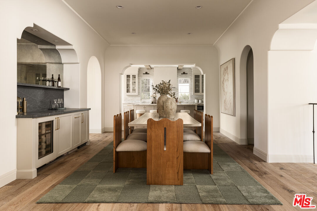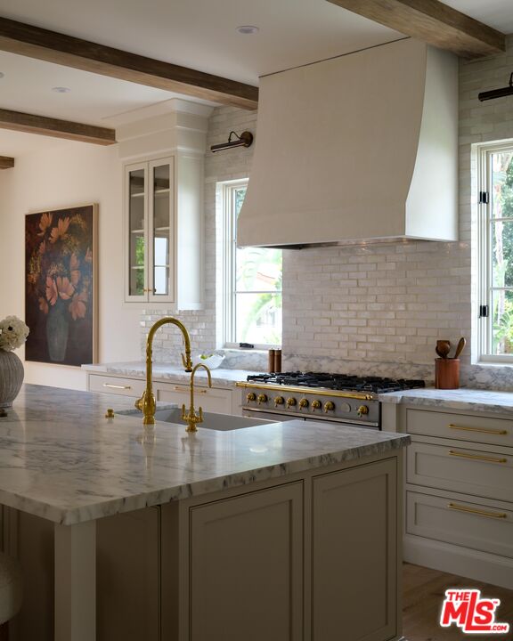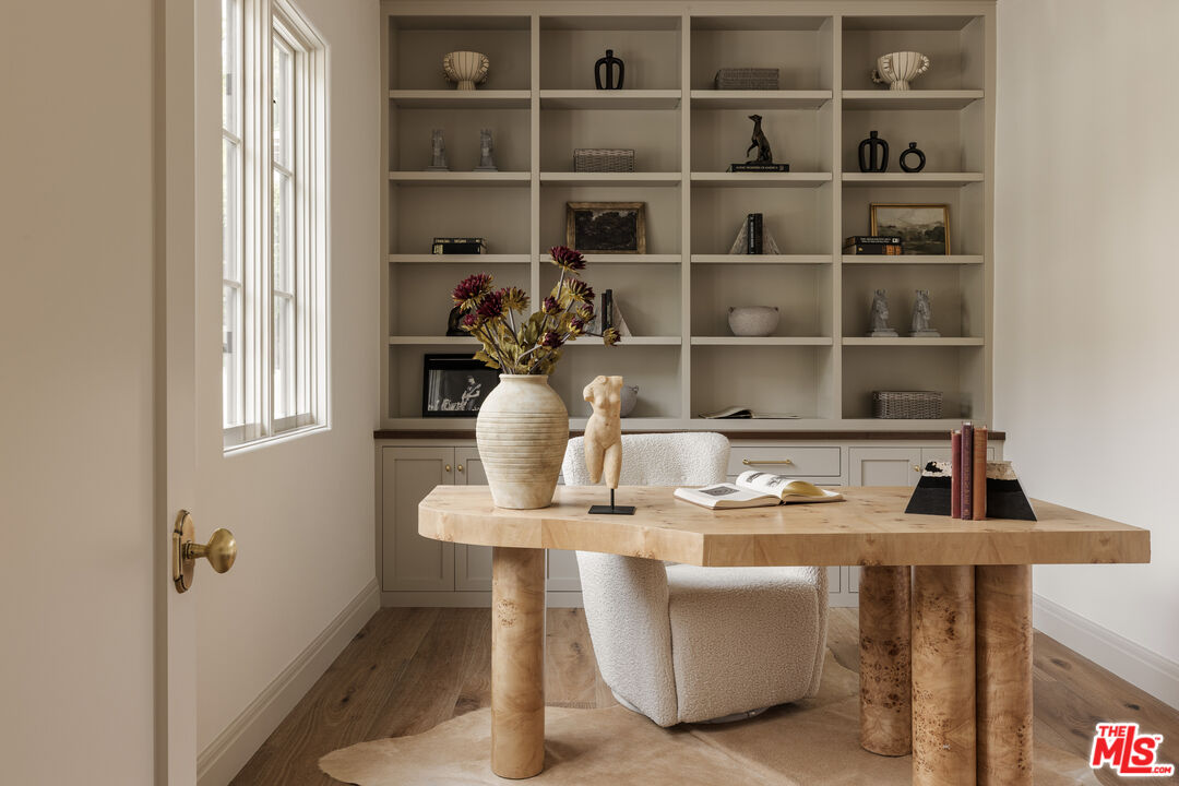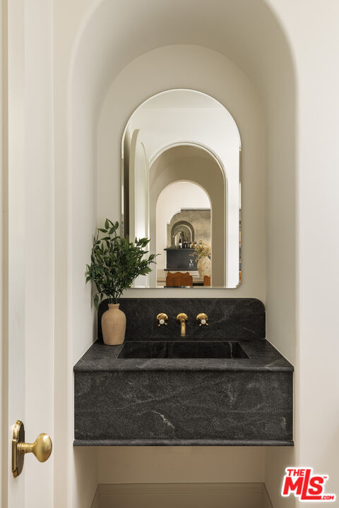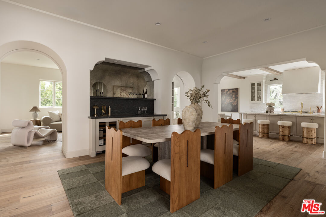 A stunning new contemporary Mediterranean estate perfectly situated in the Hollywood Hills, just moments from Sunset Boulevard and the famed Chateau Marmont. Encompassing approximately 5,800 square feet, this five bedroom, seven-bath residence blends timeless sophistication with modern luxury, highlighted by vaulted wood-beam ceilings, curated natural finishes and expansive walls of glass. The interiors flow effortlessly from elegant living spaces to serene outdoor retreats, including a covered terrace with fireplace framing lush canyon views. A gourmet kitchen featuring a La Cornue French range, Aresbescato marble countertops, and hand-worked bronze Waterworks fixtures flows into a bright breakfast nook with serene tree lined views. Each en-suite bedroom opens to a private terrace garden surrounded by lush grounds leading to a dramatic pool and spacious covered cabana. A sweeping motor court of hand-laid stone sets a dramatic tone from the moment you arrive, combining generous parking with the grandeur of a true estate approach. The detached ADU offers a private retreat with lush greenbelt views, complete with custom cabinetry, tailored finishes and abundant natural light - ideal for guests, extended stays, or creative use. Additional highlights of the main residence include a graceful spiral staircase descending to a distinctive lower-level landing area, a private home office with bespoke wood shelving, and a luxury screening room designed for an immersive cinematic experience.