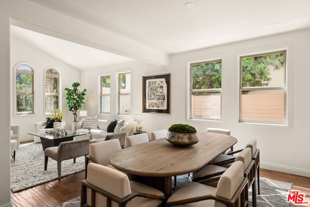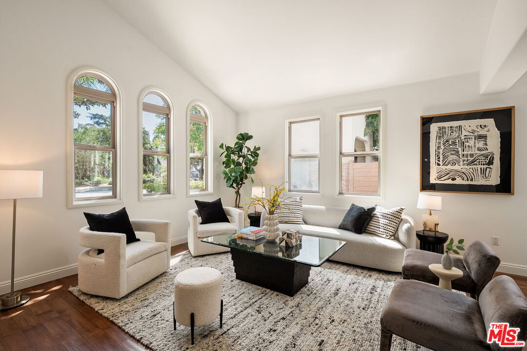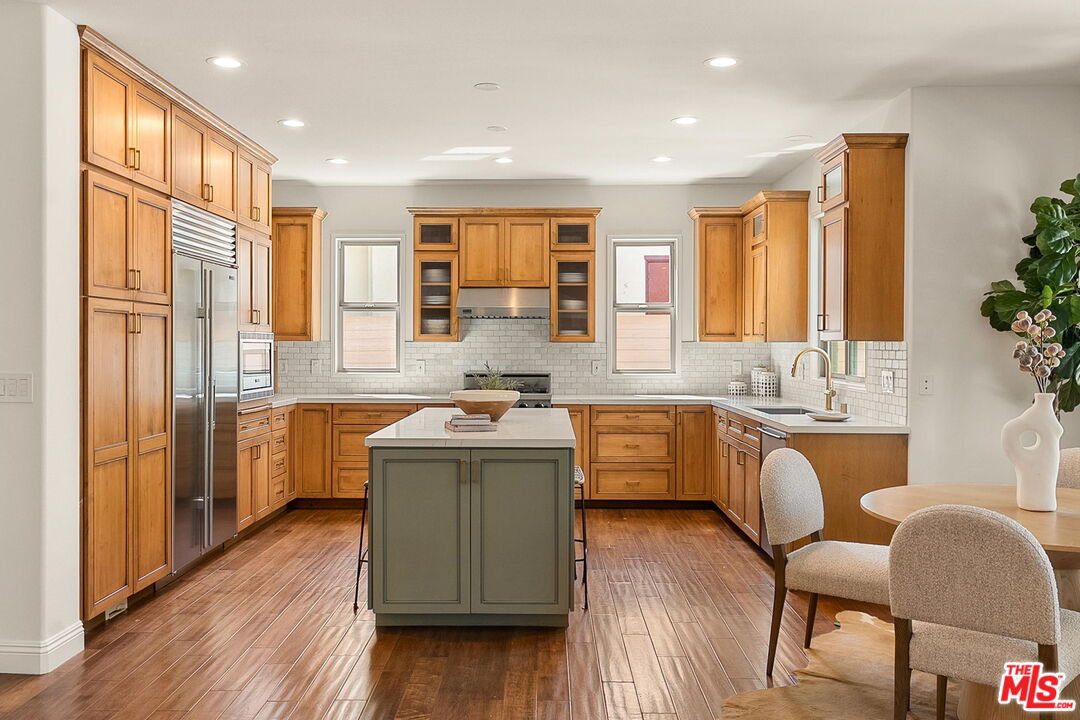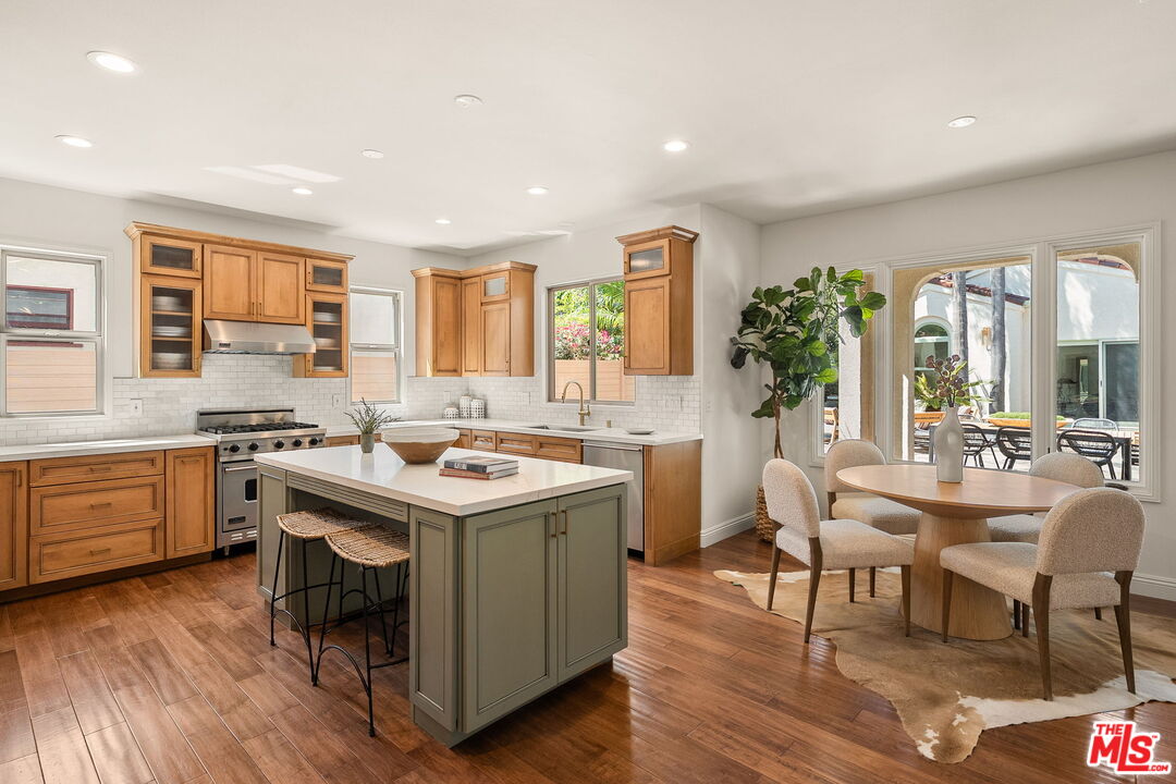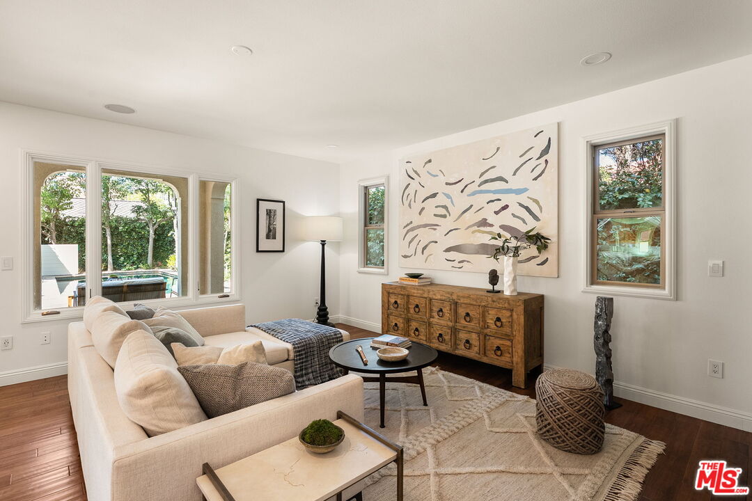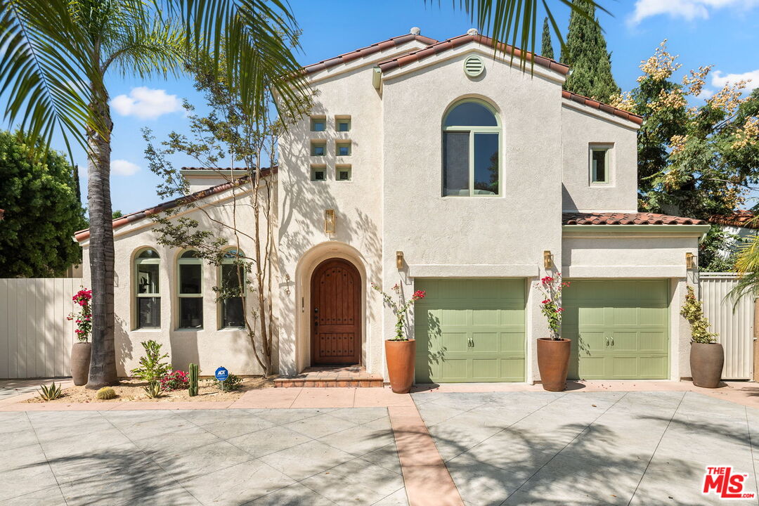 Ideally located on a tree-lined street in Miracle Mile, this two-story residence offers generous living spaces, graceful style, and a seamless indoor-outdoor flow. Built in 2005, this home combines the timeless elegance of Spanish architecture with the comfort and convenience of modern design. The front of the home is framed by lush palms and fresh landscaping, with a circular driveway offering a grand arrival. Inside, the entry foyer opens to a formal living room and dining room at the front of the home, showcasing soaring ceilings, arched windows, and rich hardwood floors. At the back, the heart of the home unfolds with a chef's kitchen, sunny breakfast nook, and expansive family room. The kitchen features an oversized island, stainless steel appliances, custom cabinetry, and abundant storage, while the breakfast area enjoys views of the resort-style backyard. The family room is anchored by a fireplace with custom built-ins, and French doors extend to a covered colonnade patio, perfect for al fresco dining and year-round entertaining. Upstairs, the primary suite serves as a private retreat, complete with its own sitting area overlooking the backyard and a built-in office featuring dual desks with custom wood cabinetry. The spacious primary bathroom offers dual vanities, a separate soaking tub, a stand-up shower, a dedicated vanity area, and a walk-in closet. Every room upstairs is light and bright, filled with windows. One of the secondary bedrooms enjoys its own private bathroom, while two additional bedrooms share a large bath, with one having direct en suite access.The backyard is a true showpiece, featuring a gorgeous deep-blue pool surrounded by lush landscaping that provides both privacy and serenity. Tall palms and mature greenery frame multiple seating and dining areas, making the space ideal for entertaining or quiet relaxation. A covered colonnade patio seamlessly connects indoor and outdoor living, while the expansive open patio provides room for lounging, dining, and gatherings under the sun. Completing the outdoor experience is a pool/guest house of approximately 488 sq ft, with its own bathroom, soaring ceilings, and sliding doors that open directly to the back patio. Whether used as a guest retreat, office, gym, or creative studio, it offers exceptional flexibility and is a perfect complement to the main residence. Additional highlights include a thoughtfully designed laundry room with custom cabinetry and a dedicated refrigerator, dual direct-access entrances to the attached two-car garage for ease and flexibility, and a long gated driveway that provides both privacy and plentiful parking for residents and guests alike. Centrally located near LA's cultural corridor of museums, shopping, and dining, this home delivers the warmth of Spanish style with the ease of modern living in one of the city's most desirable neighborhoods.