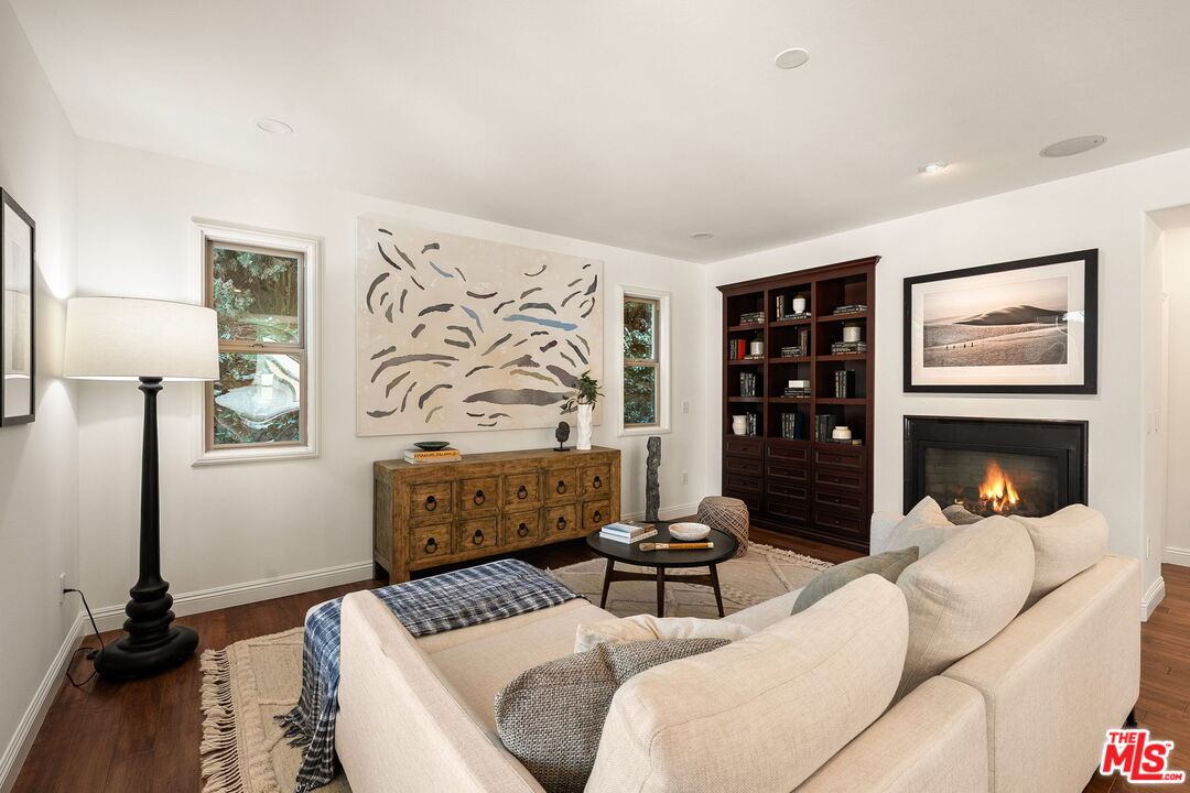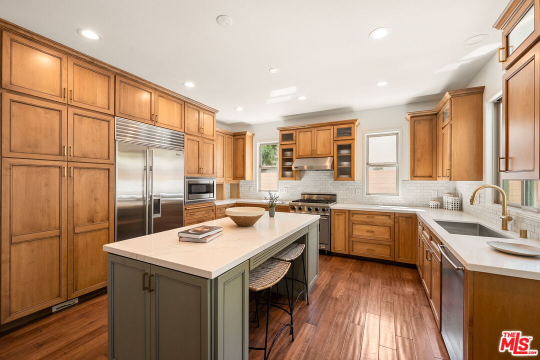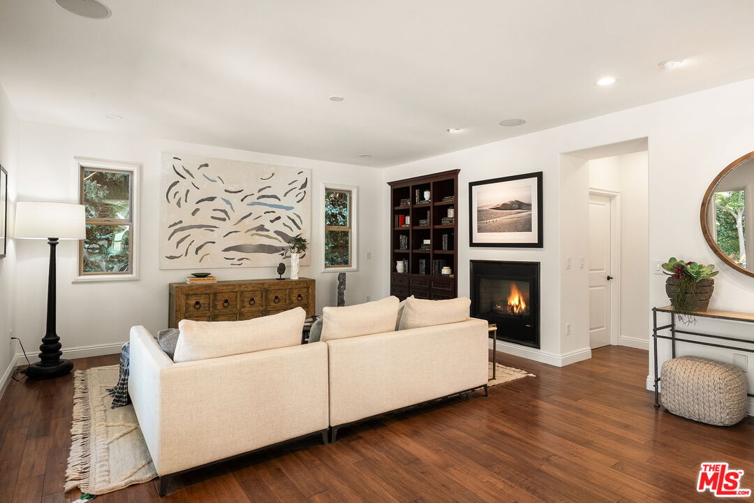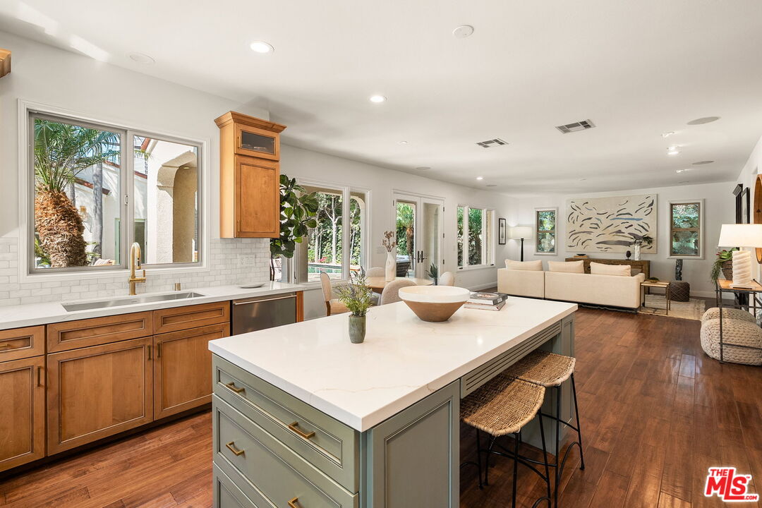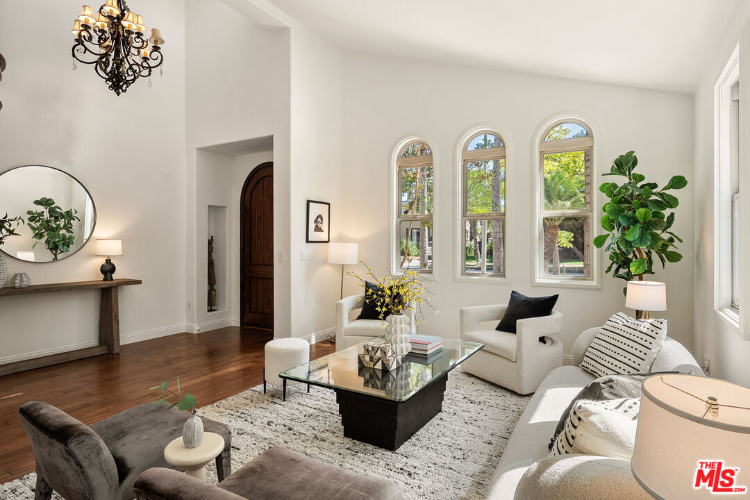 Ideally located on a tree-lined street in Miracle Mile, this two-story residence offers generous living spaces, graceful style, and a seamless indoor-outdoor flow. Built in 2005, this home combines the timeless elegance of Spanish architecture with the comfort and convenience of modern design. The front of the home is framed by lush palms and fresh landscaping, with a circular driveway offering a grand arrival. Inside, the entry foyer opens to a formal living room and dining room at the front of the home, showcasing soaring ceilings, arched windows, and rich hardwood floors. At the back, the heart of the home unfolds with a chef's kitchen, sunny breakfast nook, and expansive family room. The kitchen features an oversized island, stainless steel appliances, custom cabinetry, and abundant storage, while the breakfast area enjoys views of the resort-style backyard. The family room is anchored by a fireplace with custom built-ins, and French doors extend to a covered colonnade patio, perfect for al fresco dining and year-round entertaining. Upstairs, the primary suite serves as a private retreat, complete with its own sitting area overlooking the backyard and a built-in office featuring dual desks with custom wood cabinetry. The spacious primary bathroom offers dual vanities, a separate soaking tub, a stand-up shower, a dedicated vanity area, and a walk-in closet. Every room upstairs is light and bright, filled with windows. One of the secondary bedrooms enjoys its own private bathroom, while two additional bedrooms share a large bath, with one having direct en suite access.The backyard is a true showpiece, featuring a gorgeous deep-blue pool surrounded by lush landscaping that provides both privacy and serenity. Tall palms and mature greenery frame multiple seating and dining areas, making the space ideal for entertaining or quiet relaxation. A covered colonnade patio seamlessly connects indoor and outdoor living, while the expansive open patio provides room for lounging, dining, and gatherings under the sun. Completing the outdoor experience is a pool/guest house of approximately 488 sq ft, with its own bathroom, soaring ceilings, and sliding doors that open directly to the back patio. Whether used as a guest retreat, office, gym, or creative studio, it offers exceptional flexibility and is a perfect complement to the main residence. Additional highlights include a thoughtfully designed laundry room with custom cabinetry and a dedicated refrigerator, dual direct-access entrances to the attached two-car garage for ease and flexibility, and a long gated driveway that provides both privacy and plentiful parking for residents and guests alike. Centrally located near LA's cultural corridor of museums, shopping, and dining, this home delivers the warmth of Spanish style with the ease of modern living in one of the city's most desirable neighborhoods.