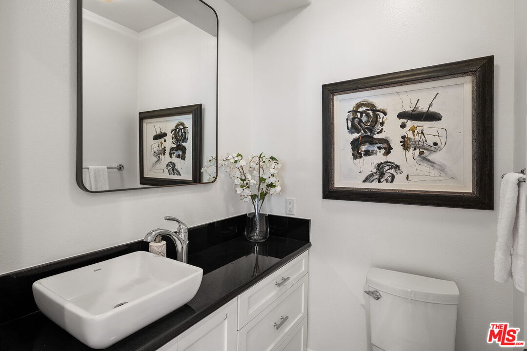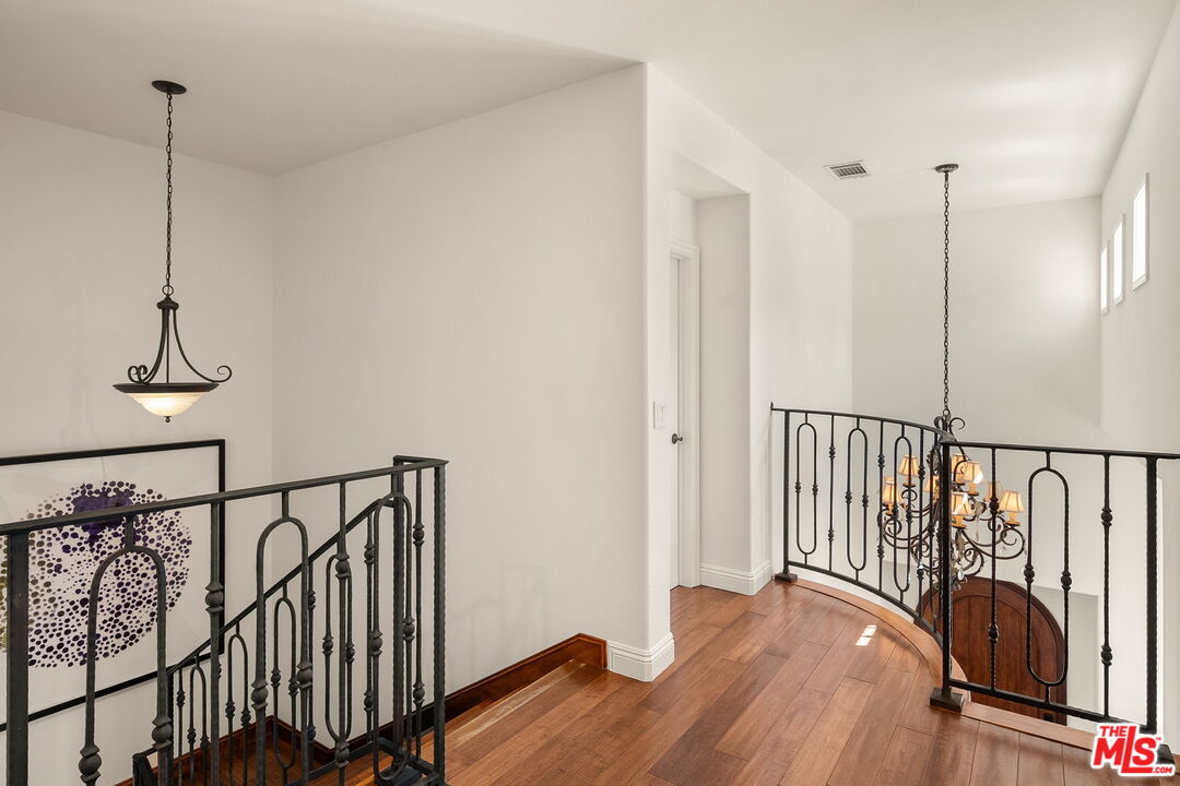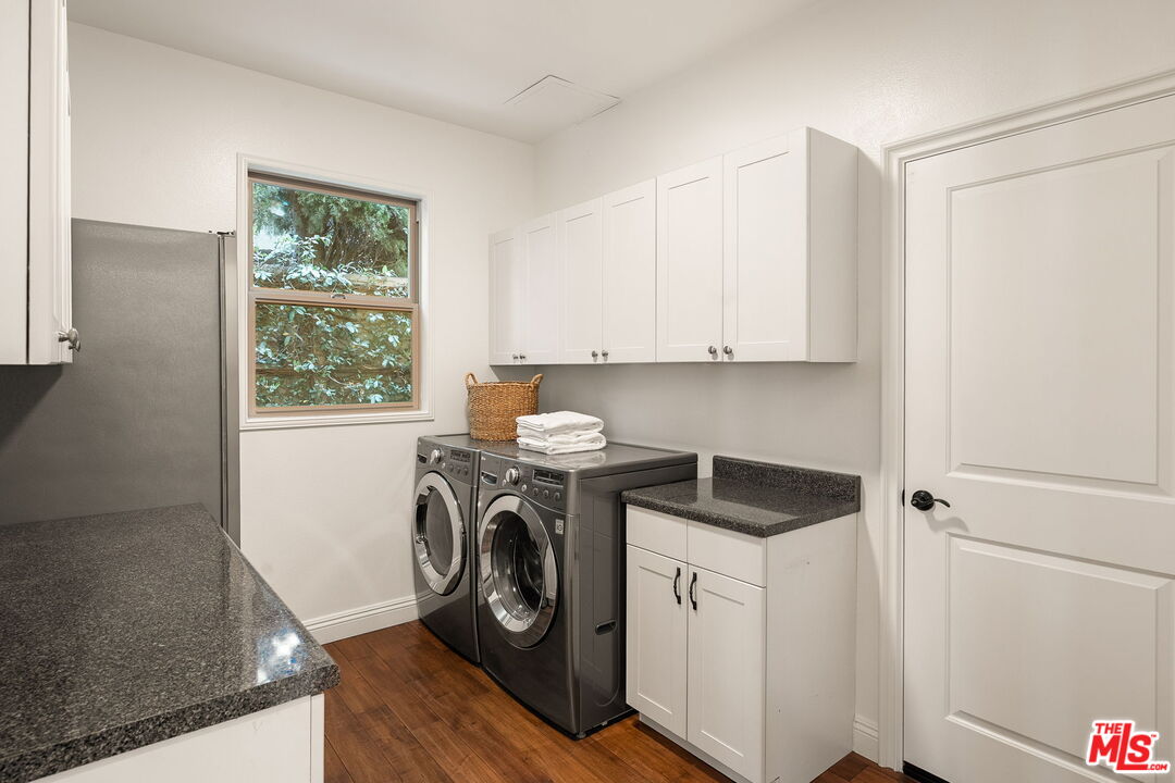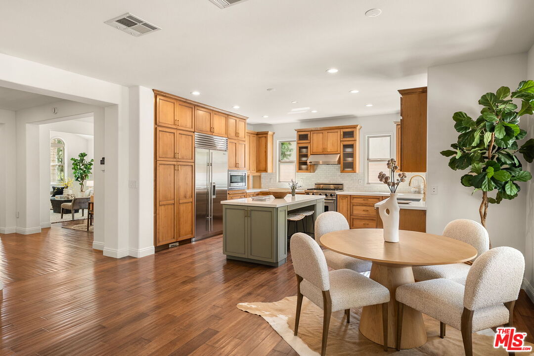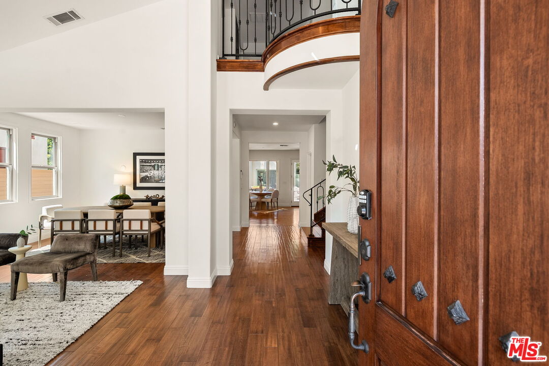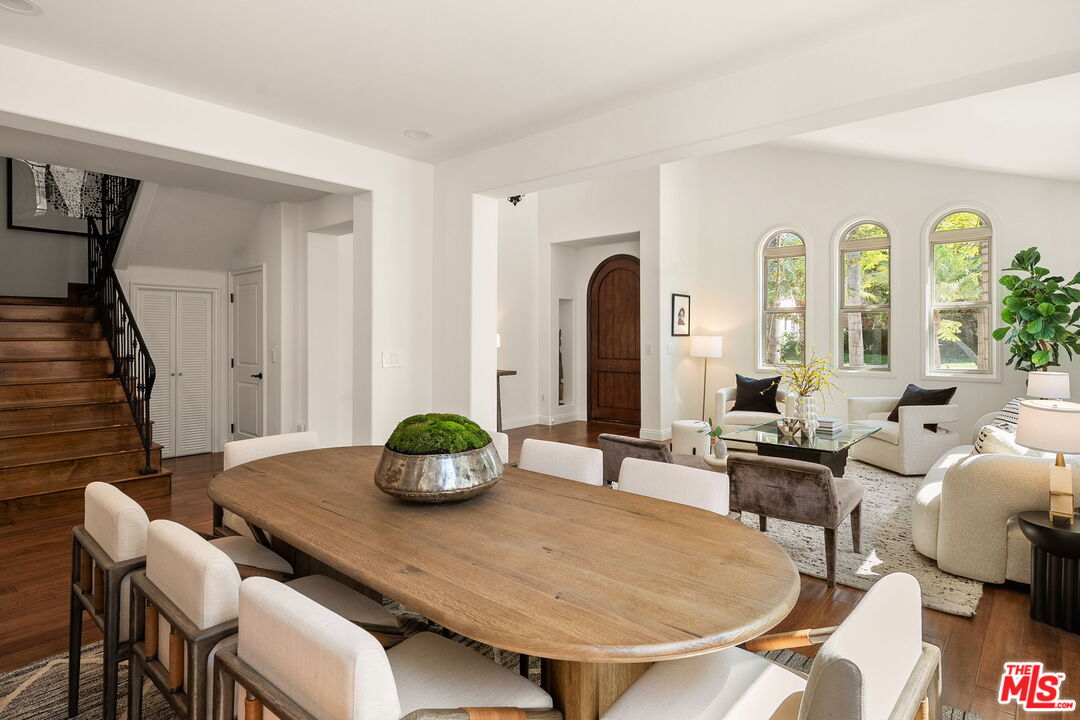 Ideally located on a tree-lined street in Miracle Mile, this two-story residence offers generous living spaces, graceful style, and a seamless indoor-outdoor flow. Built in 2005, this home combines the timeless elegance of Spanish architecture with the comfort and convenience of modern design. The front of the home is framed by lush palms and fresh landscaping, with a circular driveway offering a grand arrival. Inside, the entry foyer opens to a formal living room and dining room at the front of the home, showcasing soaring ceilings, arched windows, and rich hardwood floors. At the back, the heart of the home unfolds with a chef's kitchen, sunny breakfast nook, and expansive family room. The kitchen features an oversized island, stainless steel appliances, custom cabinetry, and abundant storage, while the breakfast area enjoys views of the resort-style backyard. The family room is anchored by a fireplace with custom built-ins, and French doors extend to a covered colonnade patio, perfect for al fresco dining and year-round entertaining. Upstairs, the primary suite serves as a private retreat, complete with its own sitting area overlooking the backyard and a built-in office featuring dual desks with custom wood cabinetry. The spacious primary bathroom offers dual vanities, a separate soaking tub, a stand-up shower, a dedicated vanity area, and a walk-in closet. Every room upstairs is light and bright, filled with windows. One of the secondary bedrooms enjoys its own private bathroom, while two additional bedrooms share a large bath, with one having direct en suite access.The backyard is a true showpiece, featuring a gorgeous deep-blue pool surrounded by lush landscaping that provides both privacy and serenity. Tall palms and mature greenery frame multiple seating and dining areas, making the space ideal for entertaining or quiet relaxation. A covered colonnade patio seamlessly connects indoor and outdoor living, while the expansive open patio provides room for lounging, dining, and gatherings under the sun. Completing the outdoor experience is a pool/guest house of approximately 488 sq ft, with its own bathroom, soaring ceilings, and sliding doors that open directly to the back patio. Whether used as a guest retreat, office, gym, or creative studio, it offers exceptional flexibility and is a perfect complement to the main residence. Additional highlights include a thoughtfully designed laundry room with custom cabinetry and a dedicated refrigerator, dual direct-access entrances to the attached two-car garage for ease and flexibility, and a long gated driveway that provides both privacy and plentiful parking for residents and guests alike. Centrally located near LA's cultural corridor of museums, shopping, and dining, this home delivers the warmth of Spanish style with the ease of modern living in one of the city's most desirable neighborhoods.