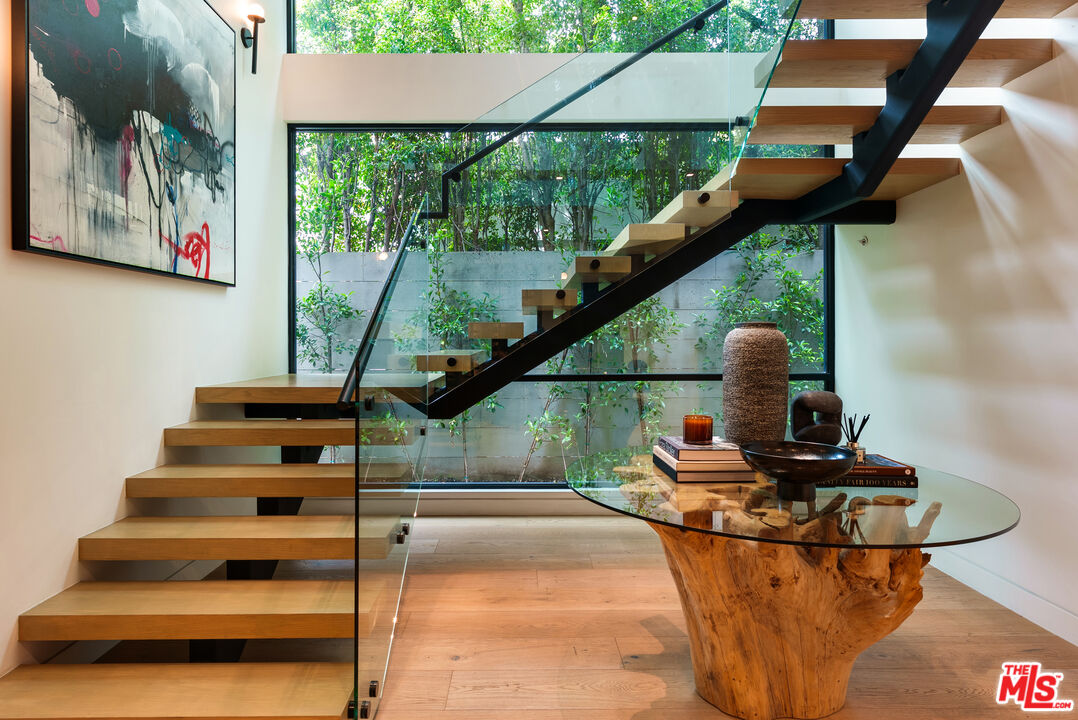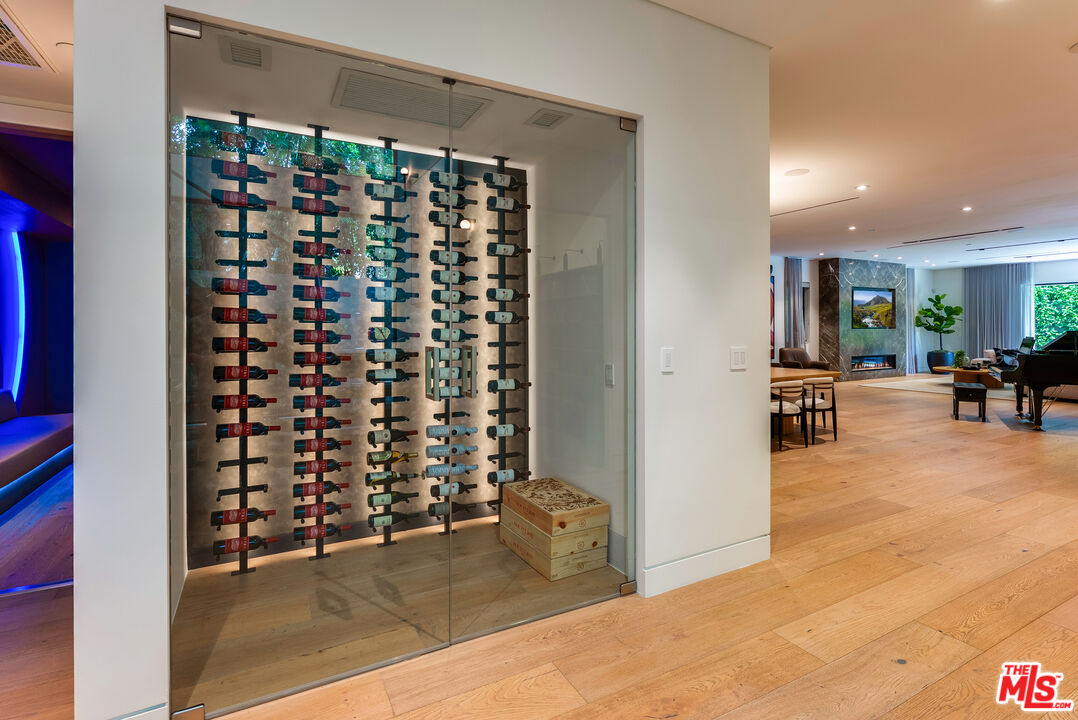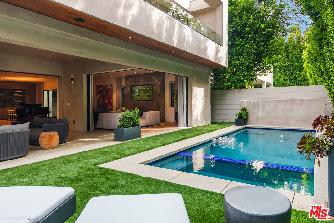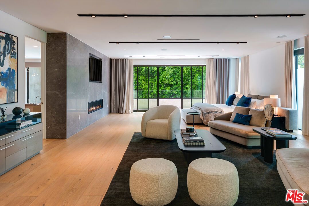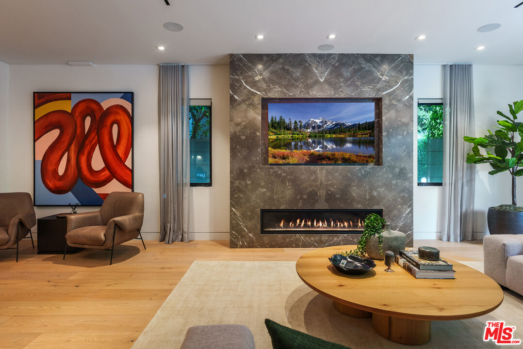 A standout offering in one of LA's most coveted neighborhoods, this exceptional residence showcases elevated craftsmanship, striking architectural detail, and an expansive rooftop retreat with sweeping 360-degree city views. Designed to rival the area's finest new builds, the home opens with a dramatic walnut pivot entry into a light-filled floor plan tailored for seamless indoor-outdoor living. The main level is thoughtfully curated for both everyday living and entertaining, featuring a temperature-controlled wine room, a bonus room (theater/exercise/recording studio), formal dining space with wet bar, and a custom Italian kitchen outfitted with premium finishes. Designer stone and tile, European oak floors, Fleetwood walls of glass, and multiple fireplaces all frame views of the illuminated pool, creating a true resort-style ambiance. A sculptural floating staircase leads to four generous en-suite bedrooms, including a sophisticated primary suite with a lounge area, dual custom LED-lit walk-in closets, a private terrace, and a striking stone fireplace. Additional highlights include a gated circular motor court, advanced smart home integration with top-tier media and security systems, and dual-zone climate control. The rooftop level, complete with its own powder room, is designed for elevated entertaining against a panoramic city backdrop. Originally designed by internationally acclaimed Chimera Interiors and set on a celebrity-favored block, this home offers a rare blend of privacy, scale, and design in the heart of Beverly Grove.