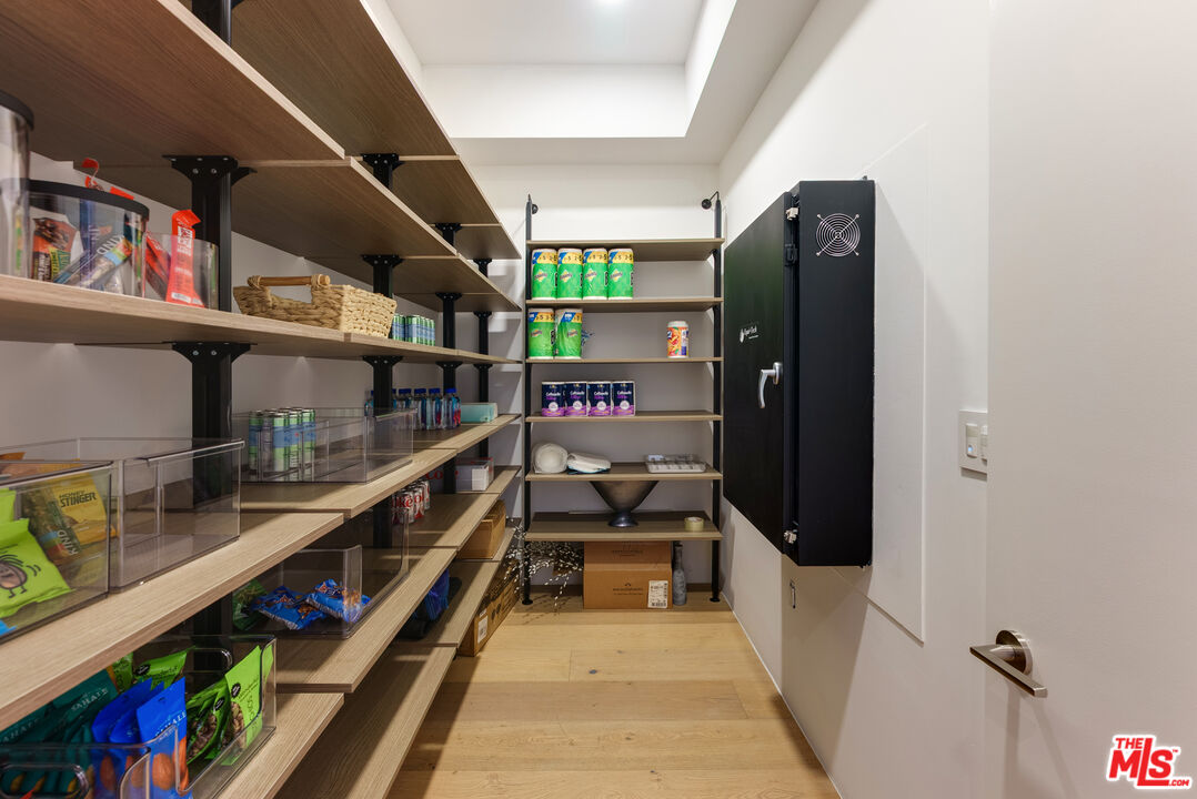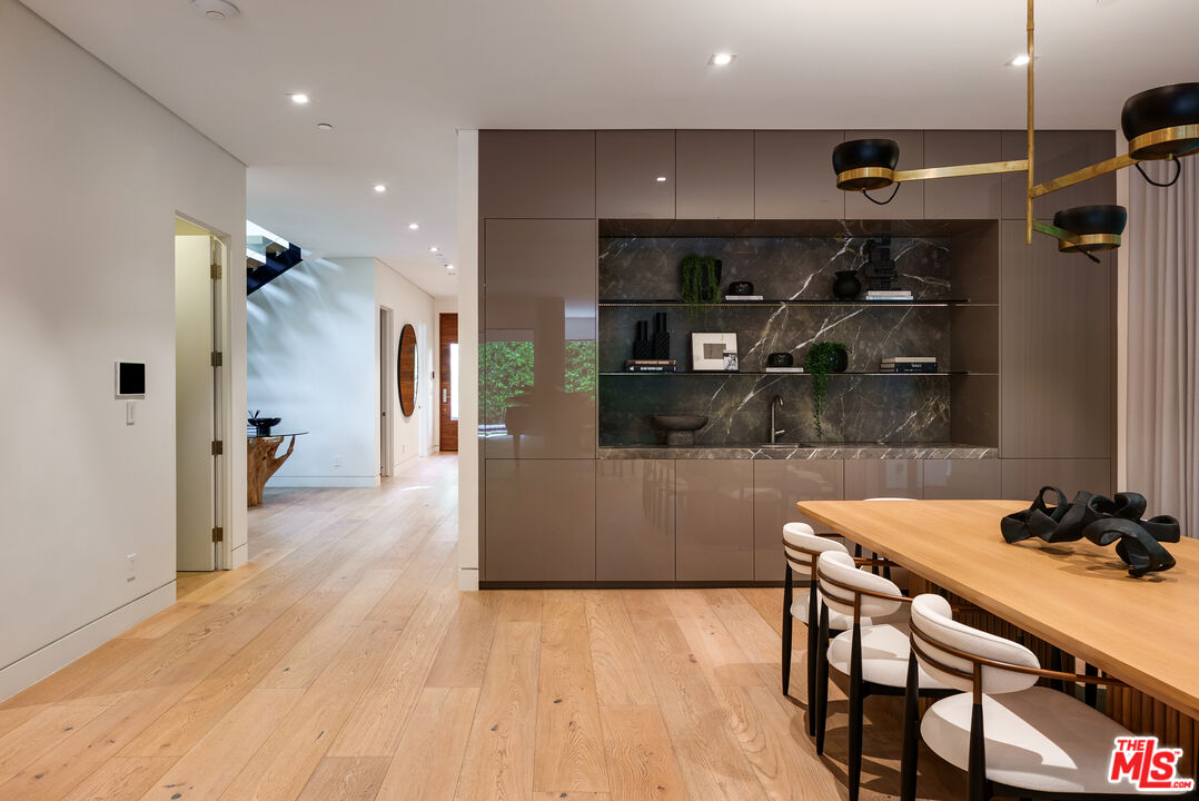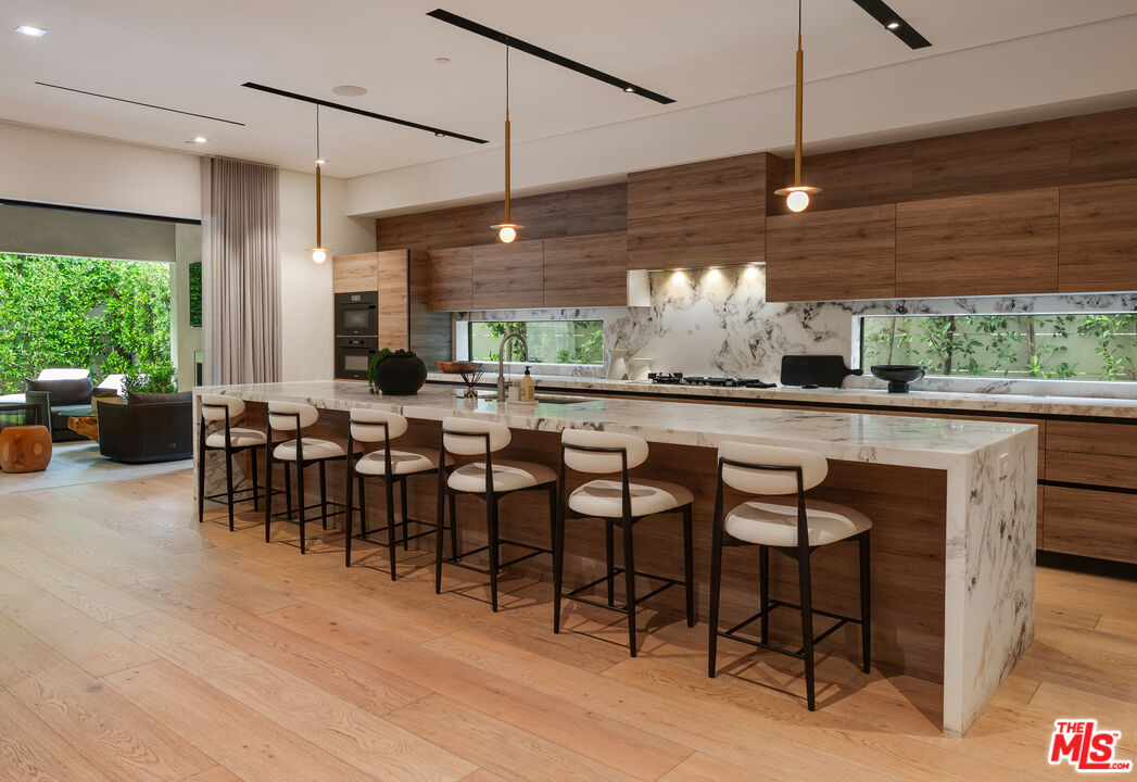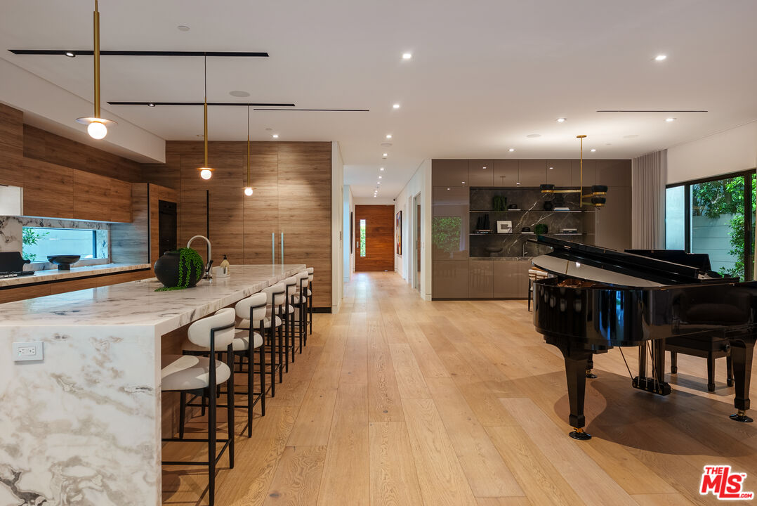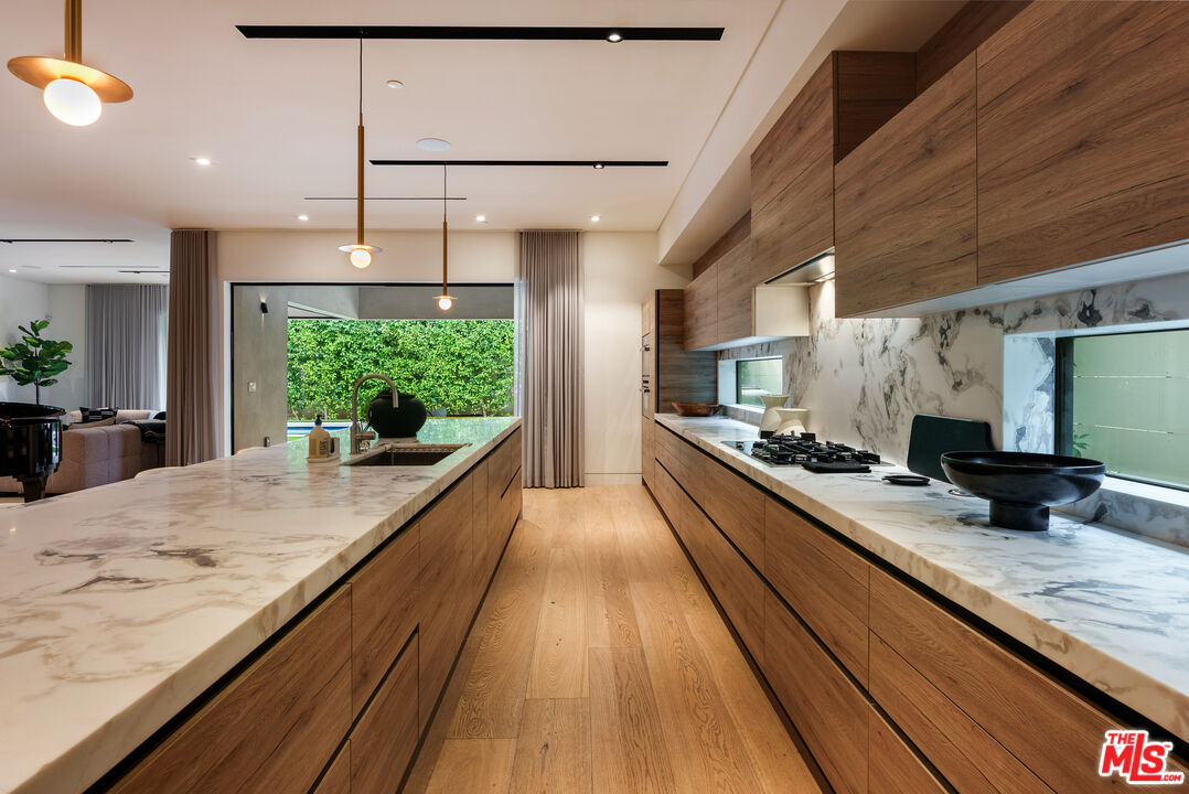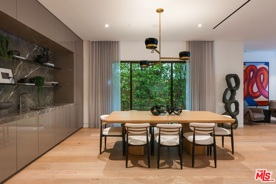 A standout offering in one of LA's most coveted neighborhoods, this exceptional residence showcases elevated craftsmanship, striking architectural detail, and an expansive rooftop retreat with sweeping 360-degree city views. Designed to rival the area's finest new builds, the home opens with a dramatic walnut pivot entry into a light-filled floor plan tailored for seamless indoor-outdoor living. The main level is thoughtfully curated for both everyday living and entertaining, featuring a temperature-controlled wine room, a bonus room (theater/exercise/recording studio), formal dining space with wet bar, and a custom Italian kitchen outfitted with premium finishes. Designer stone and tile, European oak floors, Fleetwood walls of glass, and multiple fireplaces all frame views of the illuminated pool, creating a true resort-style ambiance. A sculptural floating staircase leads to four generous en-suite bedrooms, including a sophisticated primary suite with a lounge area, dual custom LED-lit walk-in closets, a private terrace, and a striking stone fireplace. Additional highlights include a gated circular motor court, advanced smart home integration with top-tier media and security systems, and dual-zone climate control. The rooftop level, complete with its own powder room, is designed for elevated entertaining against a panoramic city backdrop. Originally designed by internationally acclaimed Chimera Interiors and set on a celebrity-favored block, this home offers a rare blend of privacy, scale, and design in the heart of Beverly Grove.