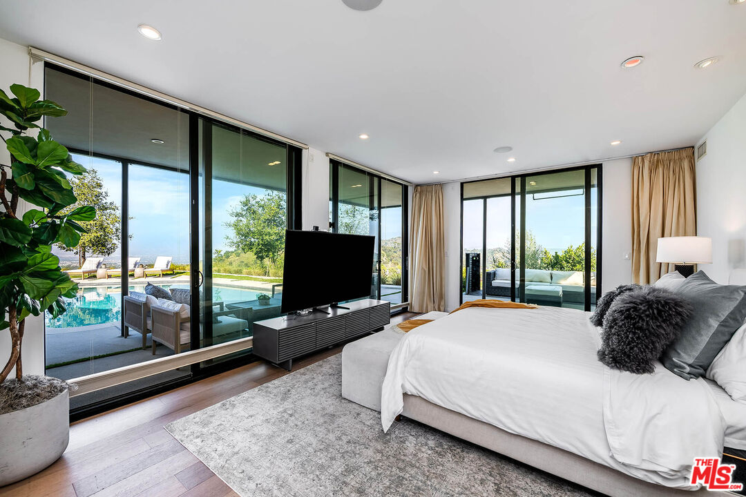 ELEVATED LUXURY WITH SWEEPING PANORAMIC VIEWS. Upon entry, the residence reveals a breathtaking skyline stretching from downtown Los Angeles across the San Fernando Valley to the distant mountains beyond. Walls of Fleetwood glass invite an abundance of natural light, guiding the eye toward vistas that define each living space. The interiors transition with ease and intention. In the great room, the city unfolds as a living backdrop. Just beyond, the pool terrace offers a serene escape, ideal for sunlit mornings or evenings illuminated by the shimmer of city lights. The kitchen serves as both a striking centerpiece and a natural gathering place. European cabinetry, beveled Dekton Rem surfaces, and a full suite of Miele appliances create an environment equally suited for entertaining or everyday living. Every element has been thoughtfully curated. Two primary suites provide a true five-star experience, each opening to a private terrace for quiet sunrise or sunset moments. Spa-inspired baths by Porcelanosa feature glass-enclosed showers, soaking tubs, and expansive walk-in closets, completing the sense of refined retreat. A private theater and integrated smart home system enhance both comfort and convenience. Set on a promontory at the end of a tranquil cul-de-sac, the property offers exceptional privacy while remaining just minutes from Beverly Hills, the Valley, and downtown Los Angeles. Here, each day begins and concludes with extraordinary views and an effortless, elevated lifestyle.