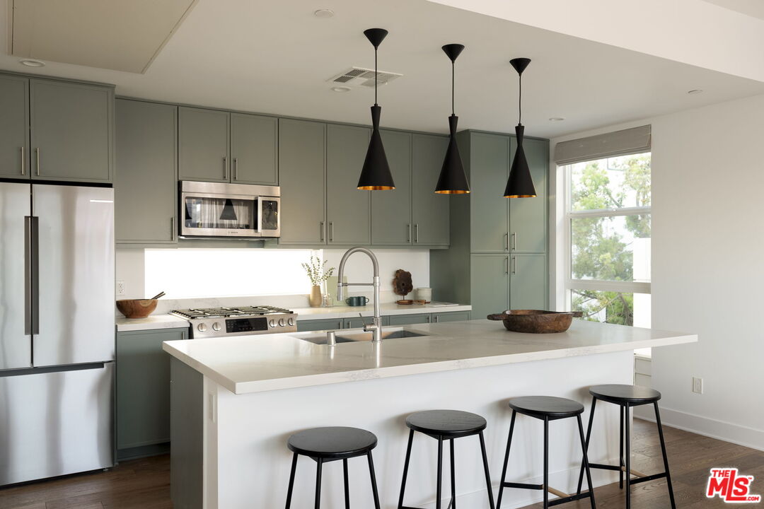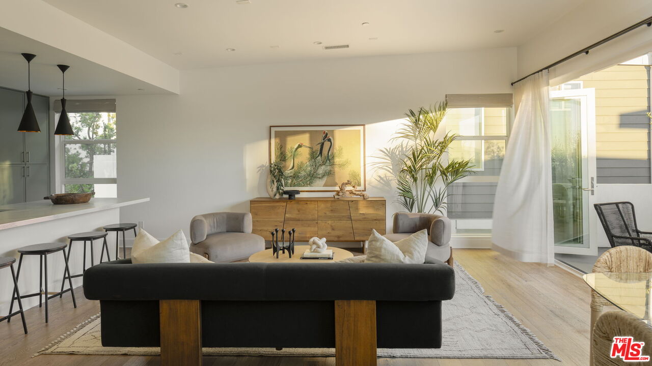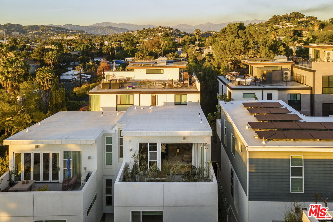 Architecturally striking and bathed in natural light, this 3-bedroom, 3.5-bath single-family home (built in 2019) delivers the very best of Silver Lake living. Enter through a welcoming foyer or directly from the two-car garage complete with EV charger. The first level offers a spacious guest suite with en-suite bath, ideal as a home office or private retreat for visitors. On the second floor, the primary suite impresses with dual walk-in closets featuring custom built-ins and a spa-like bath. A third bedroom also enjoys its own en-suite bath and walk-in closet. A laundry room with a sink is situated perfectly between the bedrooms. The crown jewel of the homes is its top-floor great room, where the kitchen, dining, and living areas open onto a sweeping south- and west-facing deck through an accordion glass wall framing breathtaking sunset views over the Hollywood Hills and city skyline. Designed with a sleek modern aesthetic, smart home technology, and high-end sustainable finishes throughout, this home suits an entertainer or a quiet work from home lifestyle. Natural light floods each floor of the home while preserving a sense of privacy and serenity. Ideally located in the Hyperion Silver Lake community of 8 homes, you are just steps from Sunset Junction and close to area highlights like Erewhon, Courage Bagels, Pine & Crane and La Colombe. Enjoy the best boutiques, bars, and cafes that make Silver Lake one of LA's most celebrated neighborhoods.