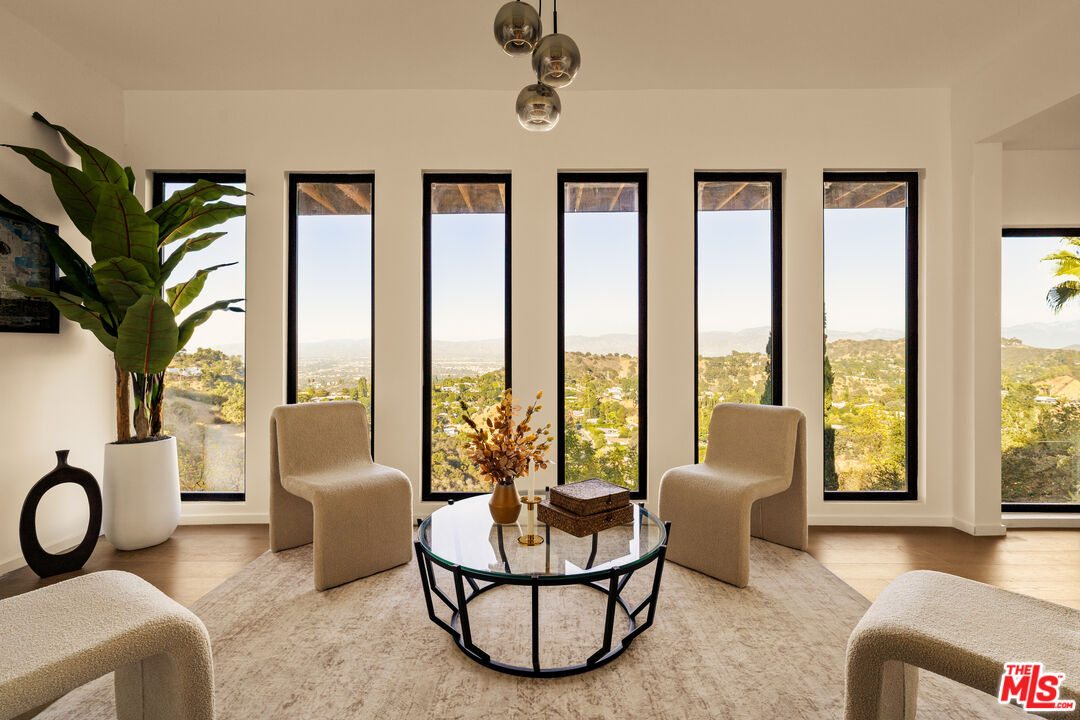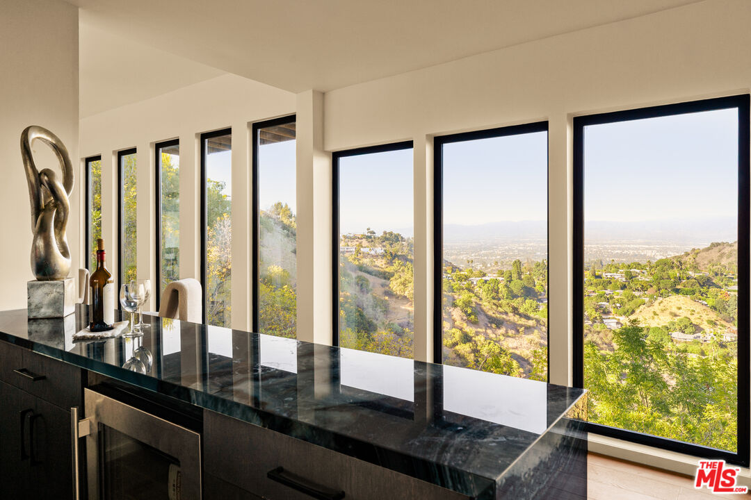 High above Laurel Canyon, the Skyline Residence is a private retreat where sweeping city and mountain views frame every moment. Expansive decks and a heated pool create an unmatched vibe--perfect for sun-soaked days, unforgettable nights, and effortless entertaining. From the moment you arrive, the home makes a striking impression. A sculptural curved plaster staircase rises beneath soaring ceilings, setting the stage for a space designed for both sophistication and comfort. The main level flows effortlessly from a statement-making living room to a dining area and into a chef's kitchen appointed with custom oak cabinetry, quartzite counters, and top-of-the-line appliances. Walls of glass slide away, extending the living space onto the deck in a seamless expression of indoor-outdoor living--the very essence of the California lifestyle. The upper deck boasts a heated pool with panoramic city views and space for dining or lounging. Below, a covered terrace invites yoga sessions, cocktails, or shaded afternoons, while a private staircase winds down to a landscaped garden retreat. Upstairs, the primary suite is a true sanctuary. Wake up to walls of glass framing the skyline, then escape to a spa-like bath with a freestanding tub, stone-clad shower, custom vanity, and skylight that bathes the space in natural light. A boutique-style walk-in closet completes the suite. Two additional bedrooms and a sleek full bath offer flexibility for family or guests. The lower level is pure indulgence--an entertainer's playground with multiple lounge areas, a striking custom bar, and even a hidden room tucked behind a bookshelf. The possibilities are endless: office, screening room, recording studio, wine cellar, or wellness lounge. Smart home features include a Lutron lighting system, integrated speakers, and a two-car garage. Situated on a quiet street in Laurel Canyon within the coveted Wonderland School district, you'll enjoy unmatched privacy just minutes from the energy of West Hollywood, Beverly Hills, and Studio City. The Skyline Residence isn't just a home it's a lifestyle, a statement, and a masterpiece of design.