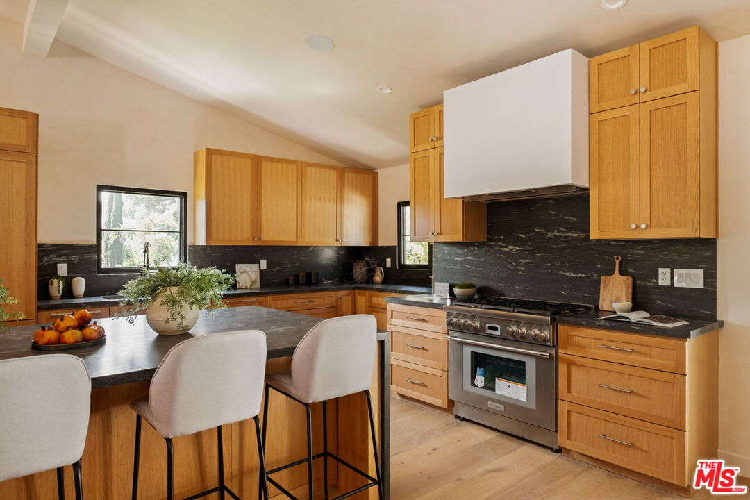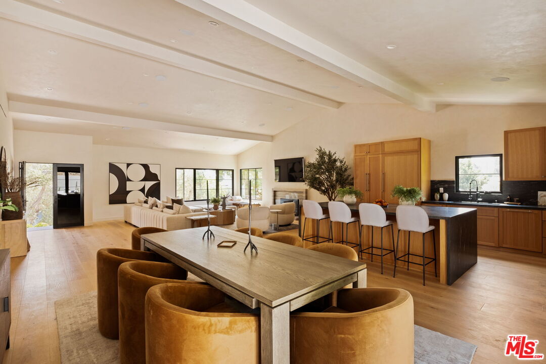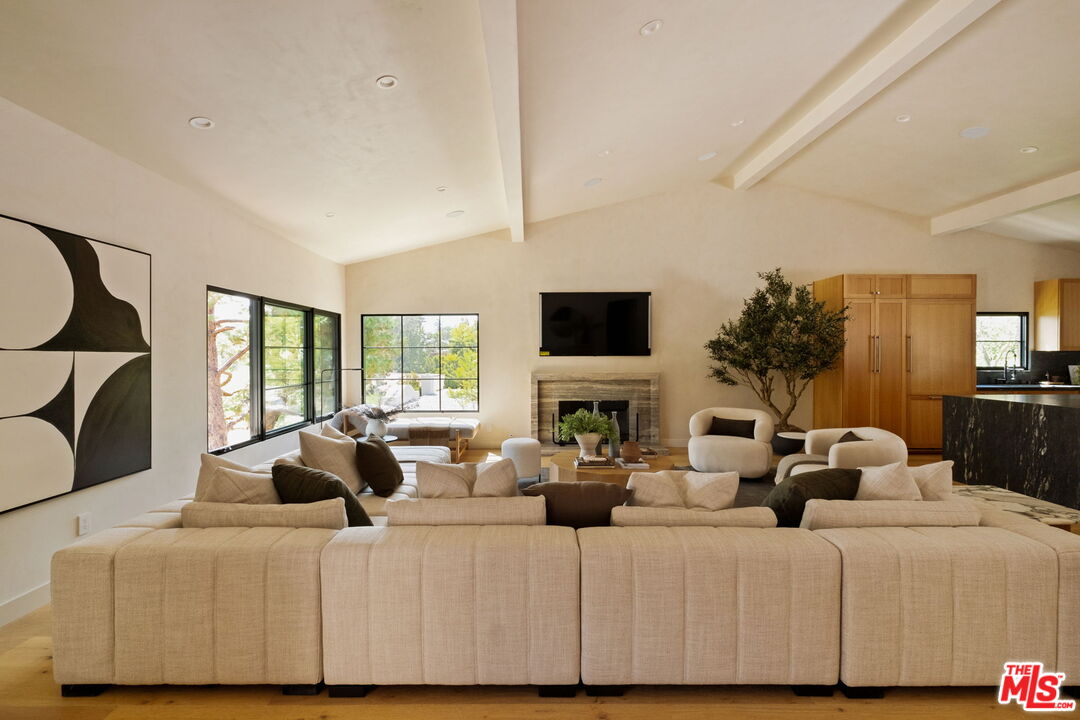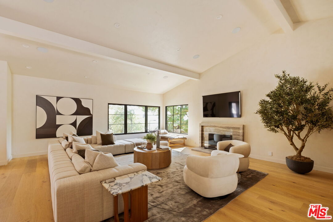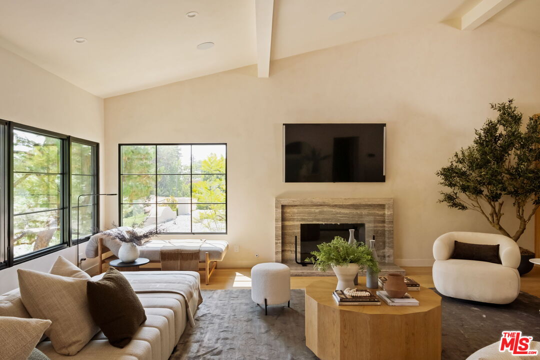 Just Reduced $400K! Nestled in the prestigious Laurel Hills neighborhood of the Hollywood Hills, this modern-style home channels a refined Soho Treehouse aesthetic with canyon views and timeless design. The open-concept layout blends spacious living areas with vaulted ceilings, creating an ideal flow for both entertaining and everyday living. Featuring three serene bedrooms and three luxurious bathrooms, the home showcases natural stone finishes, Portola lime wash walls, and custom built-ins throughout. European white oak floors, large picture windows, and thoughtfully curated high-end finishes add warmth, light, and sophistication to every room. The smooth stucco exterior with sleek brass gutters contrasts beautifully with the home's neutral palette and modern architectural lines. Surrounded by lush landscaping and mature olive trees, the grounds include expansive decks, a grassy yard, a sparkling pool, and panoramic city views. Additional features include Control 4 Home automation, Lutron lighting, a tankless water heater, new plumbing and electrical, two-car garage with EV charging, and driveway parking for two more vehicles. This private oasis perfectly balances modern luxury and European-inspired charman exceptional retreat not to be missed.