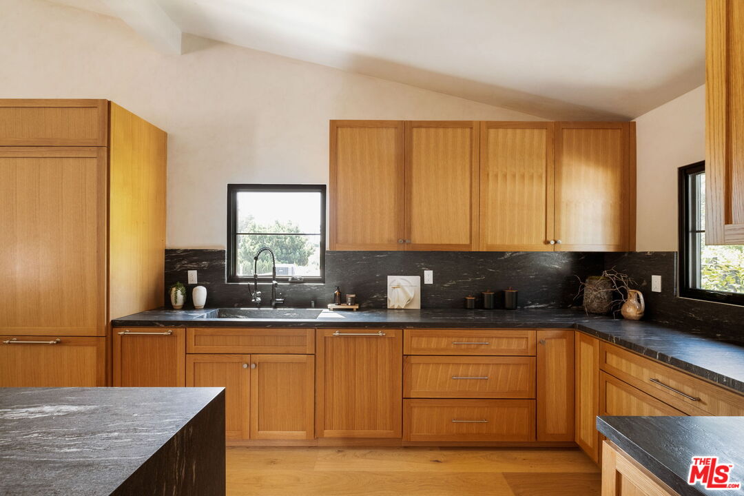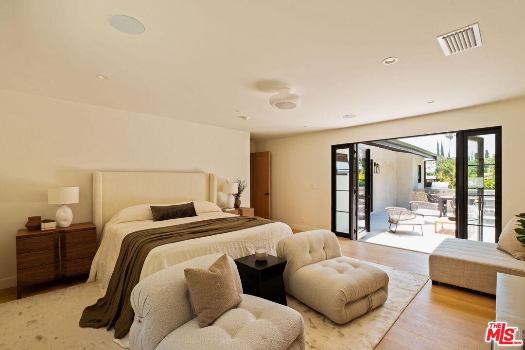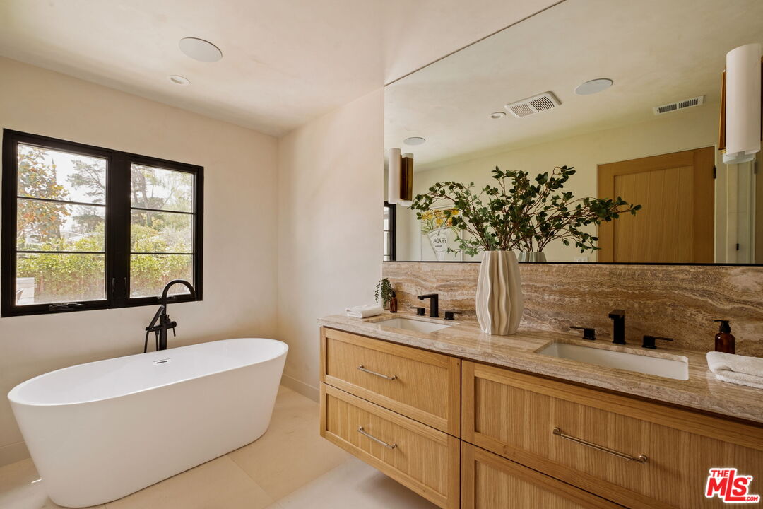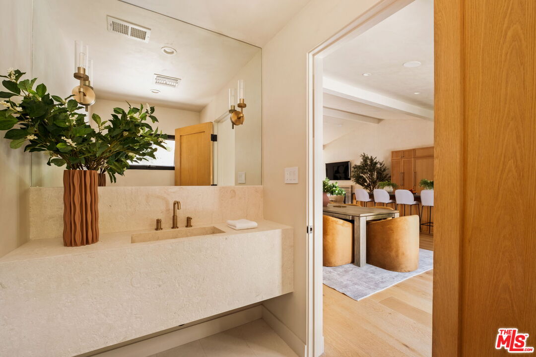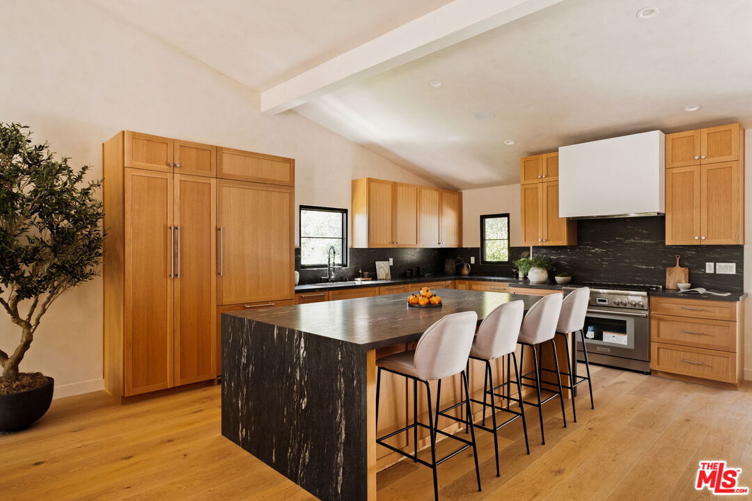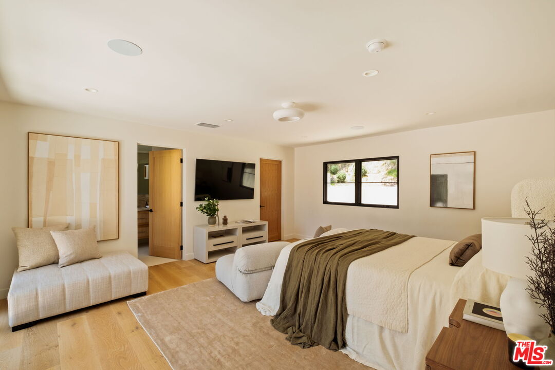 Just Reduced $400K! Nestled in the prestigious Laurel Hills neighborhood of the Hollywood Hills, this modern-style home channels a refined Soho Treehouse aesthetic with canyon views and timeless design. The open-concept layout blends spacious living areas with vaulted ceilings, creating an ideal flow for both entertaining and everyday living. Featuring three serene bedrooms and three luxurious bathrooms, the home showcases natural stone finishes, Portola lime wash walls, and custom built-ins throughout. European white oak floors, large picture windows, and thoughtfully curated high-end finishes add warmth, light, and sophistication to every room. The smooth stucco exterior with sleek brass gutters contrasts beautifully with the home's neutral palette and modern architectural lines. Surrounded by lush landscaping and mature olive trees, the grounds include expansive decks, a grassy yard, a sparkling pool, and panoramic city views. Additional features include Control 4 Home automation, Lutron lighting, a tankless water heater, new plumbing and electrical, two-car garage with EV charging, and driveway parking for two more vehicles. This private oasis perfectly balances modern luxury and European-inspired charman exceptional retreat not to be missed.