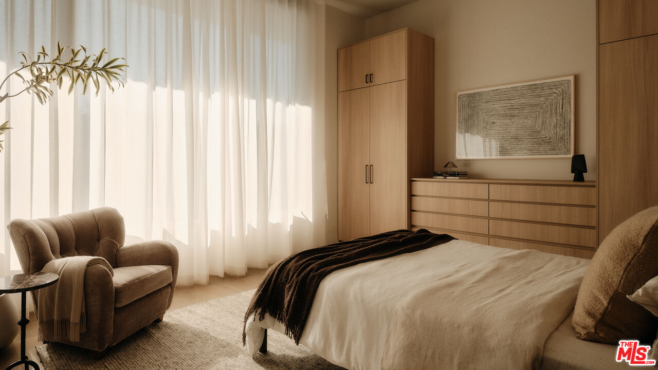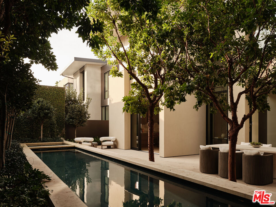 Stone House by Olson Kundig at 8899 Beverly is a singular architectural residence offering a rare combination of privacy, scale, and full-service luxury in the heart of West Hollywood. One of only eight signature homes within this acclaimed development, and the largest of the collection, Stone House is the only one of its kind. The four-bedroom, four-and-a-half-bath home spans over 3,600 square feet and is defined by a refined interplay of light champagne steel and substantial limestone that carries from the exterior through a formal sequence of interior spaces.A distinctive axial layout creates a natural flow throughout the home, centered on a dramatic double-height entry and living space. A sculptural, double-sided fireplace anchors the central living area, opening to both the front garden and the interior. A bespoke custom stair with exposed structural steel is paired with a glass guard, leading to an interior steel bridge above the central living area. Fleetwood operable sliding doors extend the living spaces and kitchen to a private backyard retreat with a plunge pool and spa. Interior finishes are warm and cohesive, with wood flooring throughout and plain-sawn oak cabinetry carried consistently across the home. The kitchen is fully integrated with custom-paneled cabinetry and a premium suite of Gaggenau and Miele appliances. The primary bedroom is a true sanctuary, featuring a fireplace, dual walk-in closets, and a spa-like bathroom finished in Crema Ella marble with a freestanding soaking tub. All four bedrooms feature custom closets and built-ins. As part of the Olson Kundigdesigned 8899 Beverly development, homeowners enjoy access to 24-hour concierge and property management services, a state-of-the-art fitness center, and a landscaped amenity deck with resort-style pool and spa and a custom outdoor kitchen. One of only four remaining homes in the development, Stone House offers a rare opportunity to own a fully private, architecturally significant residence with the services and amenities of a world-class enclave.