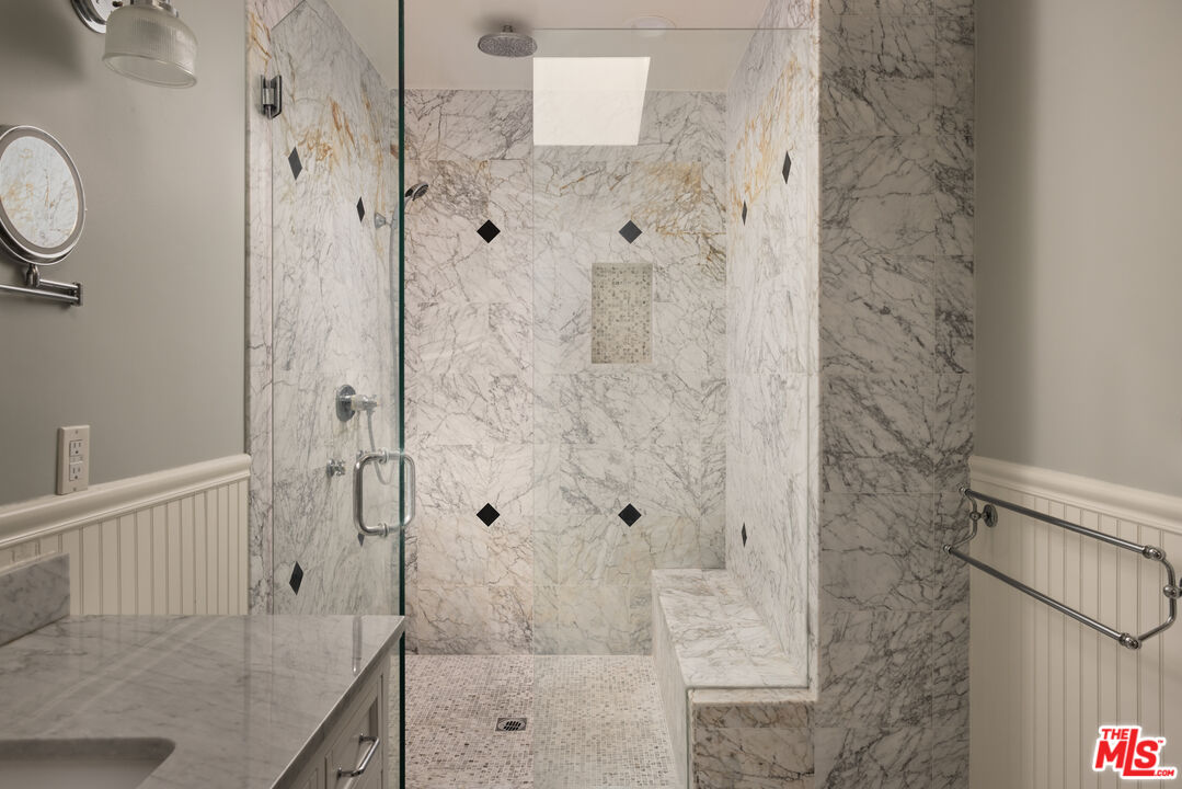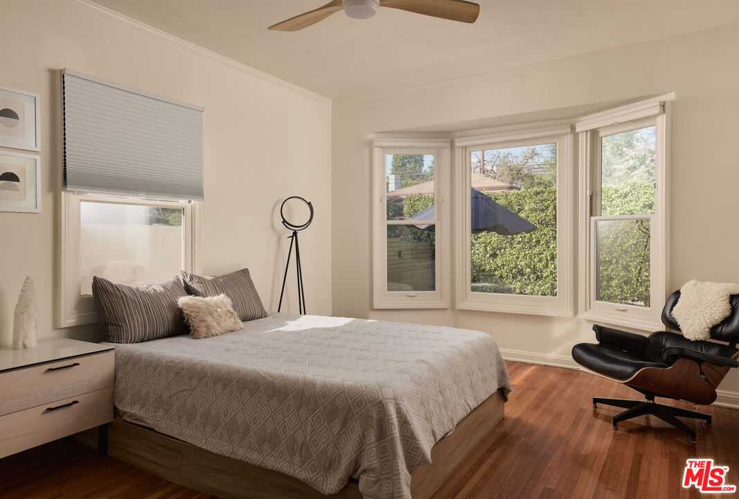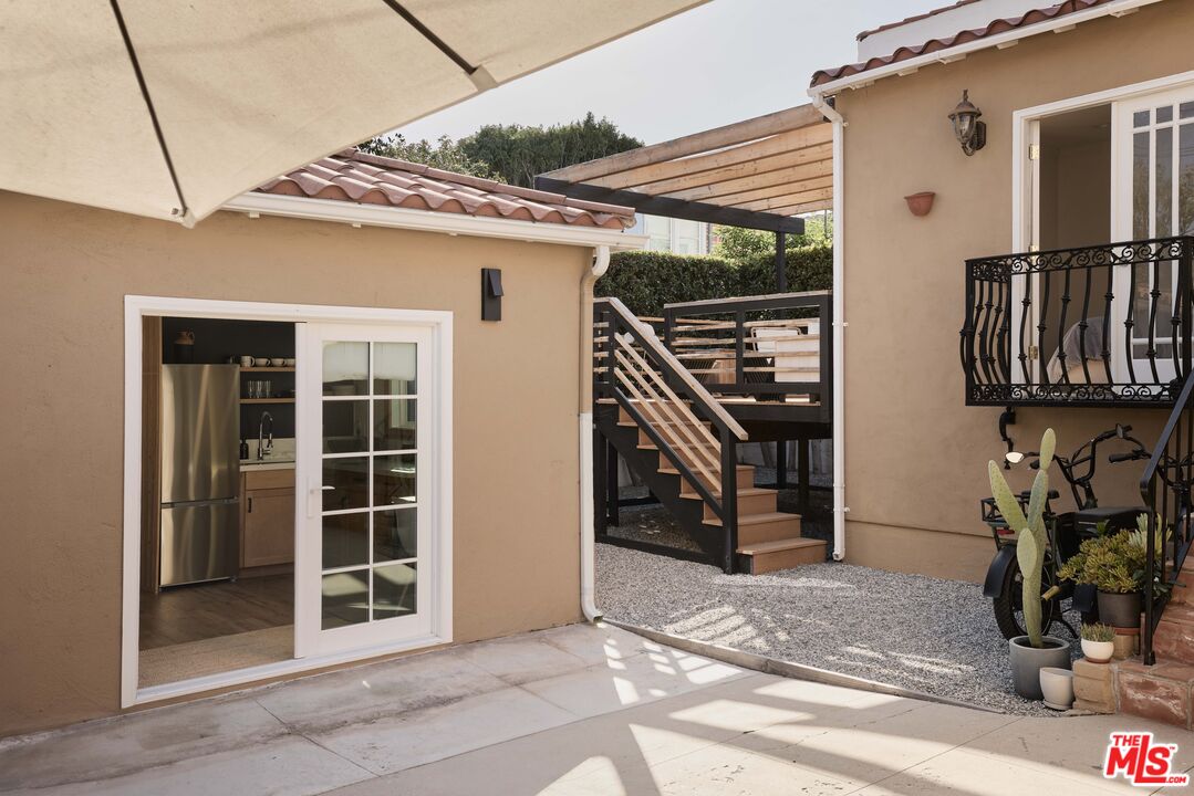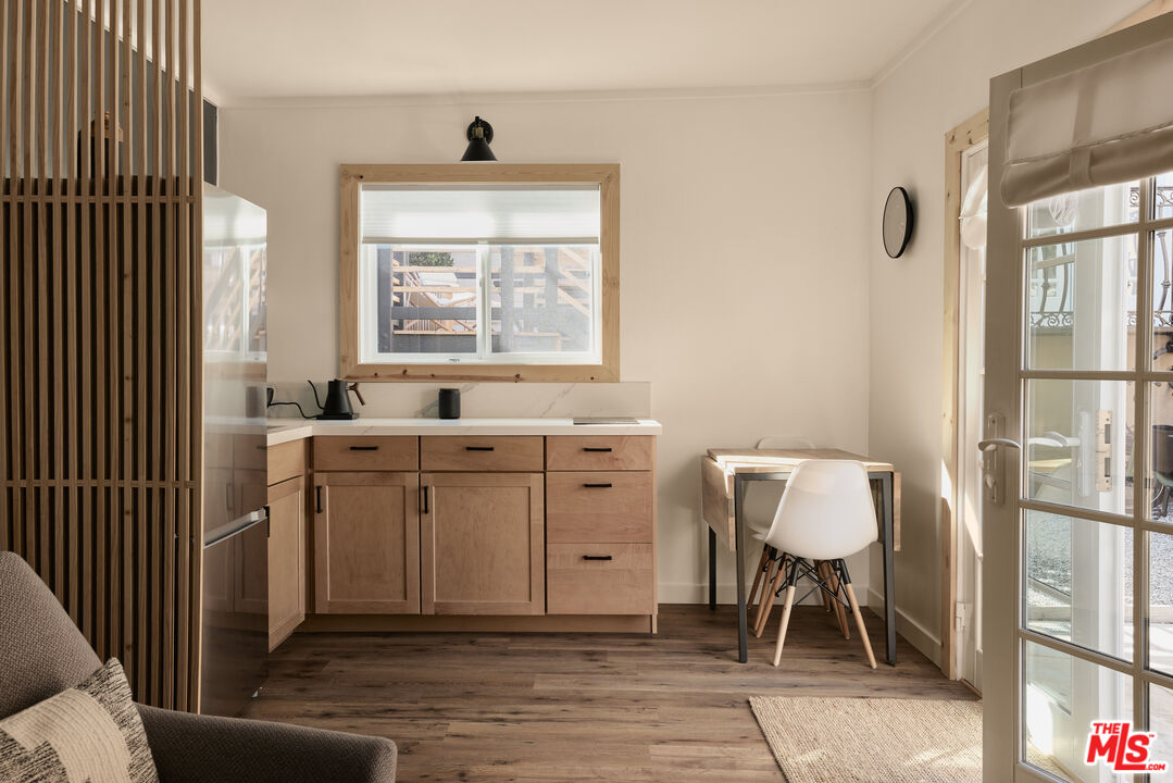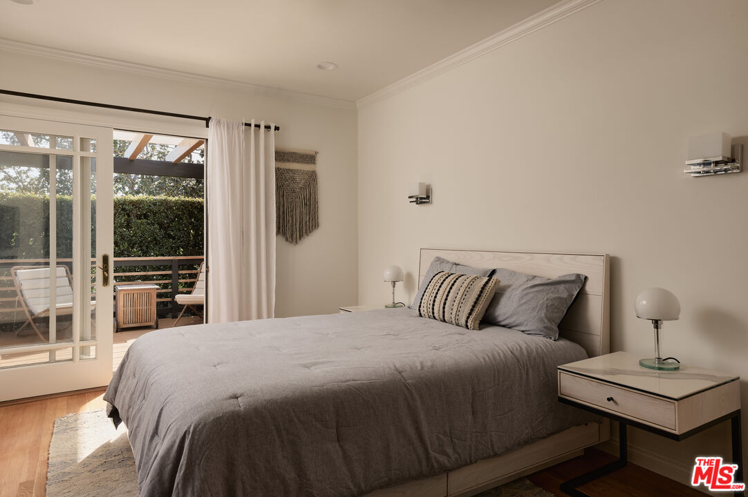 A serene and tranquil traditional residence set in the highly desirable Norma Triangle, where West Hollywood meets Beverly Hills. Hedged and gated for privacy, this thoughtfully designed property features a 2-bedroom, 2-bath main residence along with a converted garage guesthouse complete with kitchenette and bathroom, offering a flexible 3-bedroom, 3-bath layout overall. The living room showcases timeless details including a stately fireplace, crown molding, and original hardwood floors, complemented by a large picture window overlooking the front yard framed by tall, leafy privacy hedges. The large dining room features French doors that open to a private deck outfitted with slatted shutters, enhancing both privacy and charm. The fully renovated kitchen is equipped with extensive cabinetry and ample counter space and opens to the deck, which functions as a true extension of the home an outdoor living room! The primary suite also enjoys access to the brand-new deck and features a marble-clad bathroom with skylight, oversized shower, and dual walk-in closets. Additional highlights include off-street parking for two cars and a location just moments from premier dining, shopping, nightlife, and cultural attractions. Main residence approx. 1,535 sq ft | Guest suite approx. 330 sq ft.