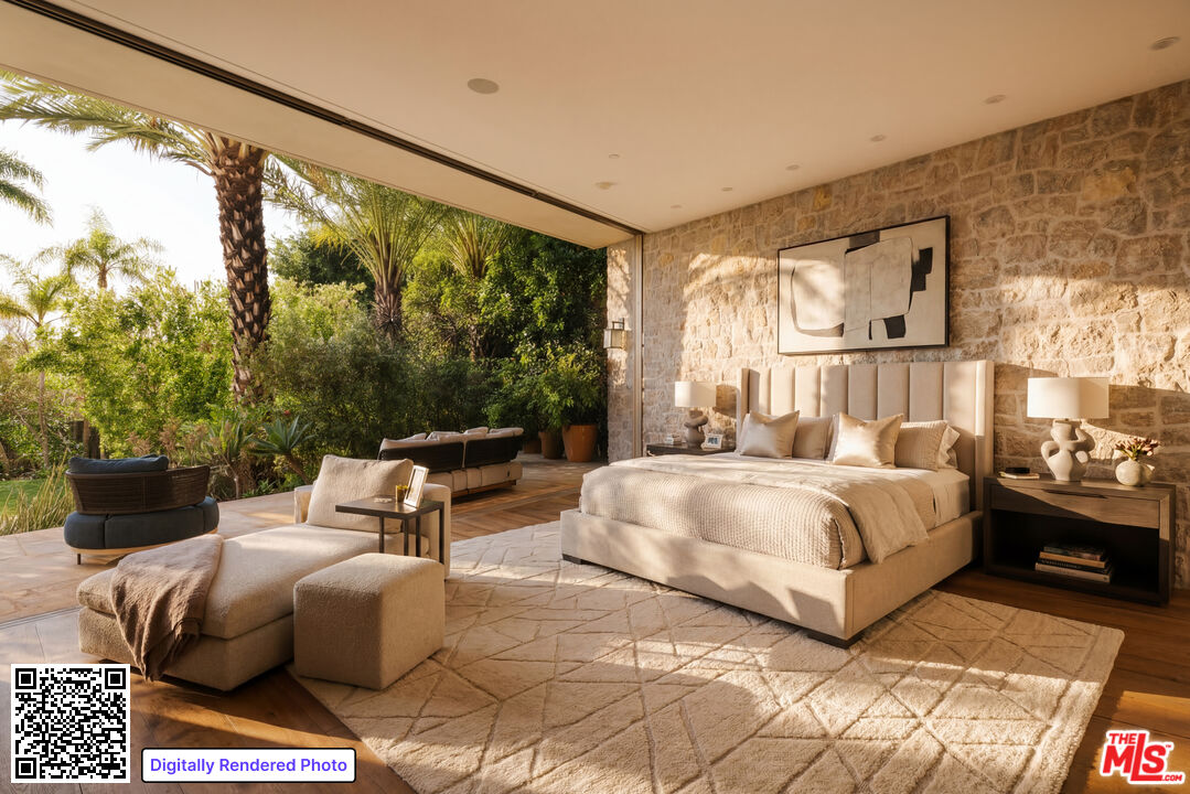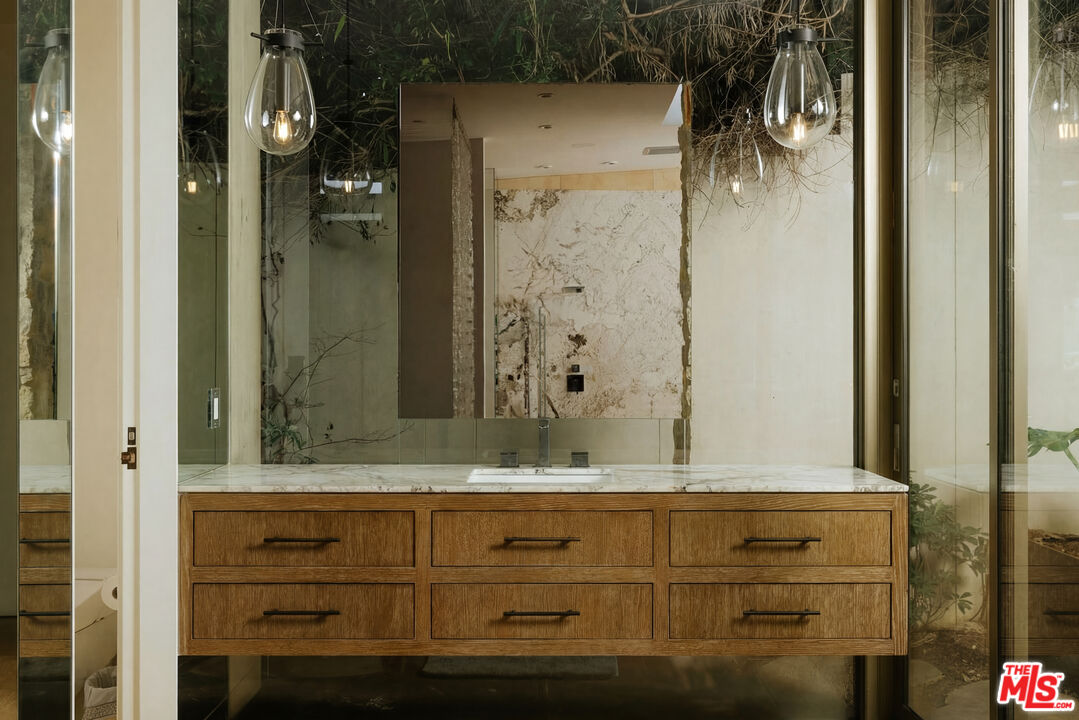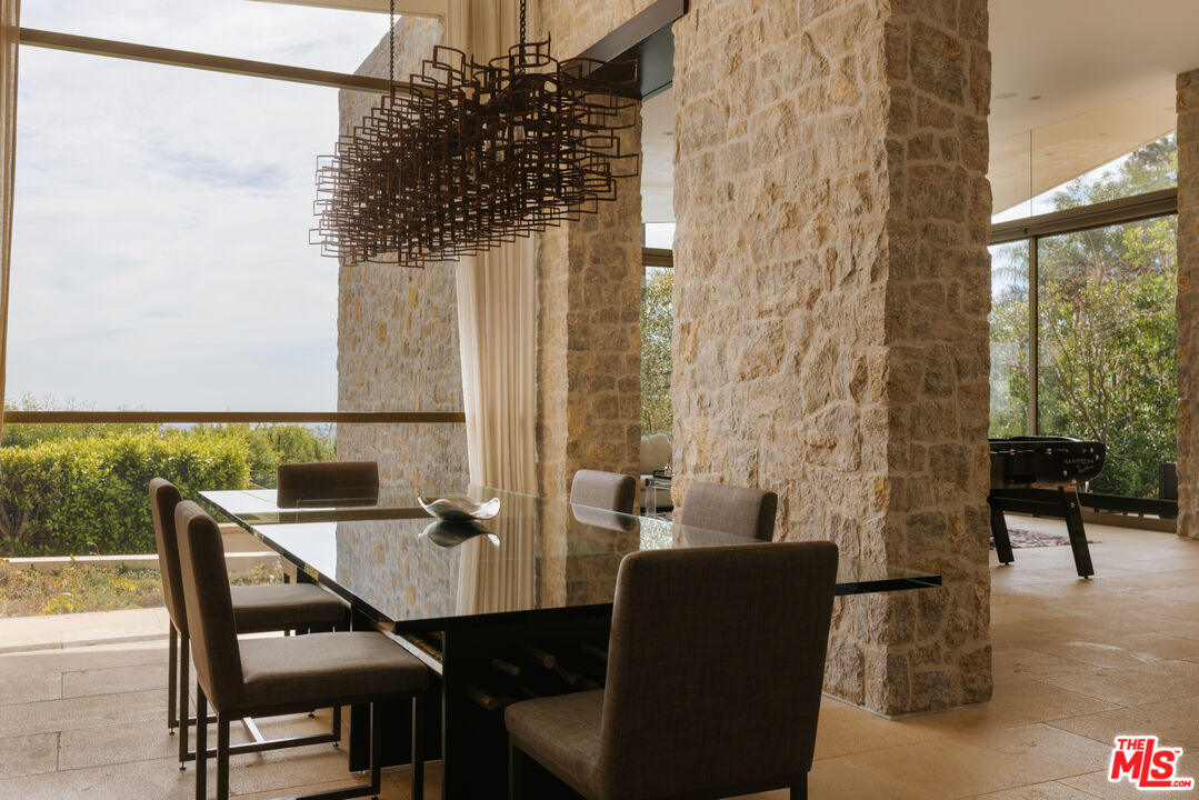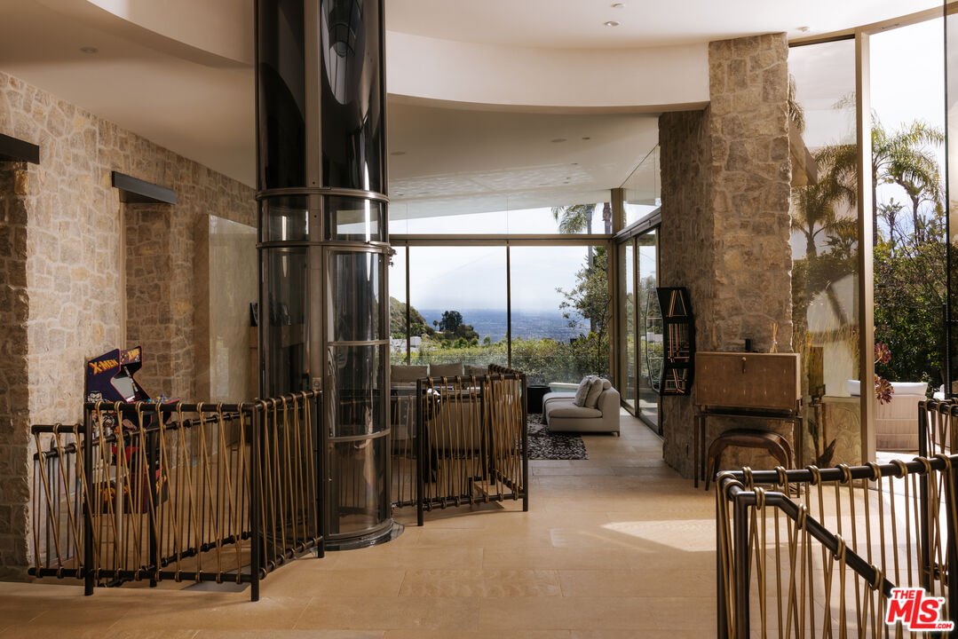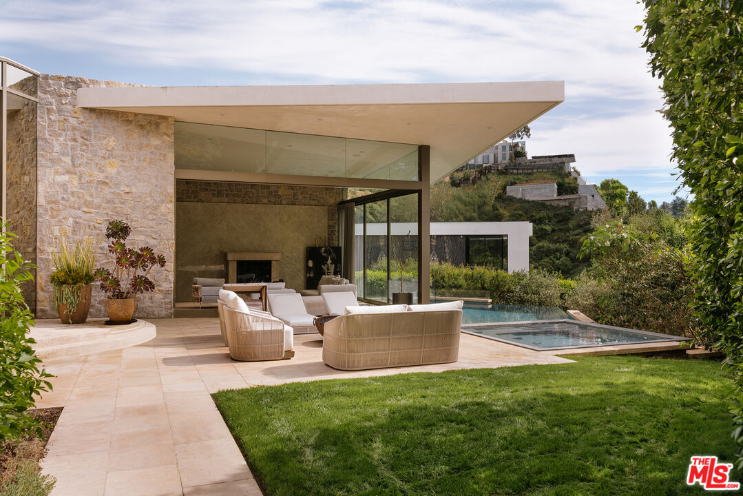 Defined by its striking use of stone and glass, juxtaposed against the dramatic backdrop of the city, The Bayou House, located in the famed Bird Streets, is a thoughtfully executed modern retreat by multidisciplinary designer Bradley Bayou. Completed in 2015, the home provides an unparalleled approach to craftsmanship, security, and functionality. Set behind a gated entry with mature hedges, feel welcomed home to a sense of privacy and effortless peace. A striking round entry with a glass ceiling, complete with a unique suction elevator, flows seamlessly to the formal living room. With floor to ceiling retractable glass walls on either side, the room beautifully showcases the home's infinity pool and manicured grounds. Back through the distinctive foyer sits the kitchen, complete with Miele appliances, its adjoining family room, featuring a two-sided gas fireplace and access to an additional courtyard, and the dining room. The wood and stone accents continue throughout the interior, as the sanctuary unfolds into the primary retreat. A serene ambiance is set by an additional fireplace, continued retractable glass walls, dual walk-in closets, and a spa-like bathroom. Two additional guest suites and a powder room sit on the main level. Descend down the grand, arched stairway to a lounge and bar area, a private theater room, the remaining two guest suites, a laundry room, and access to the subterranean 4-car garage. The home is complete with a Savant smart-home automation system, a gated driveway, and gated street entry. All of this, nestled in an iconic location just above the Sunset Strip in the prestigious Doheny Estates neighborhood.