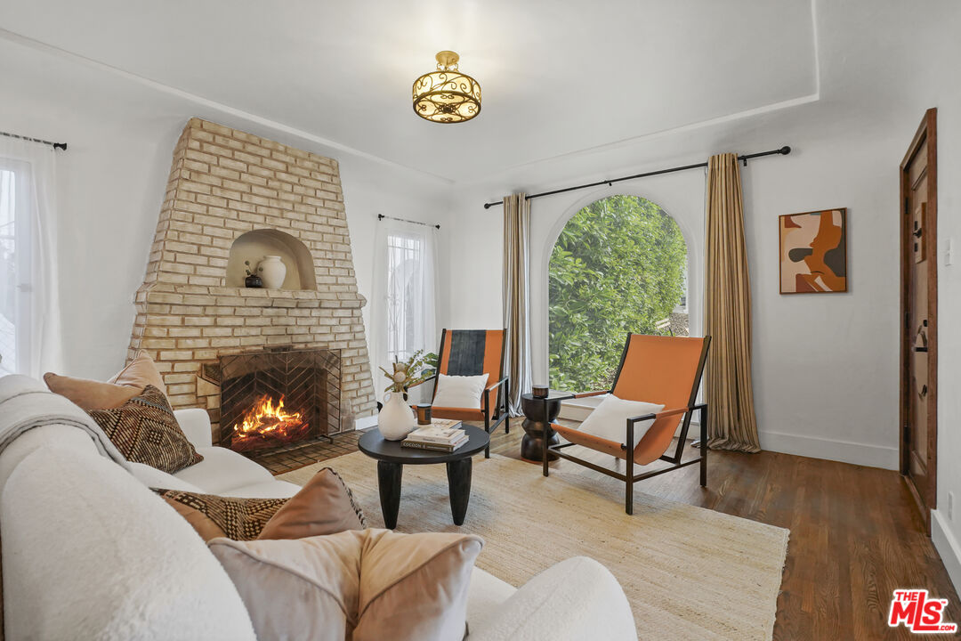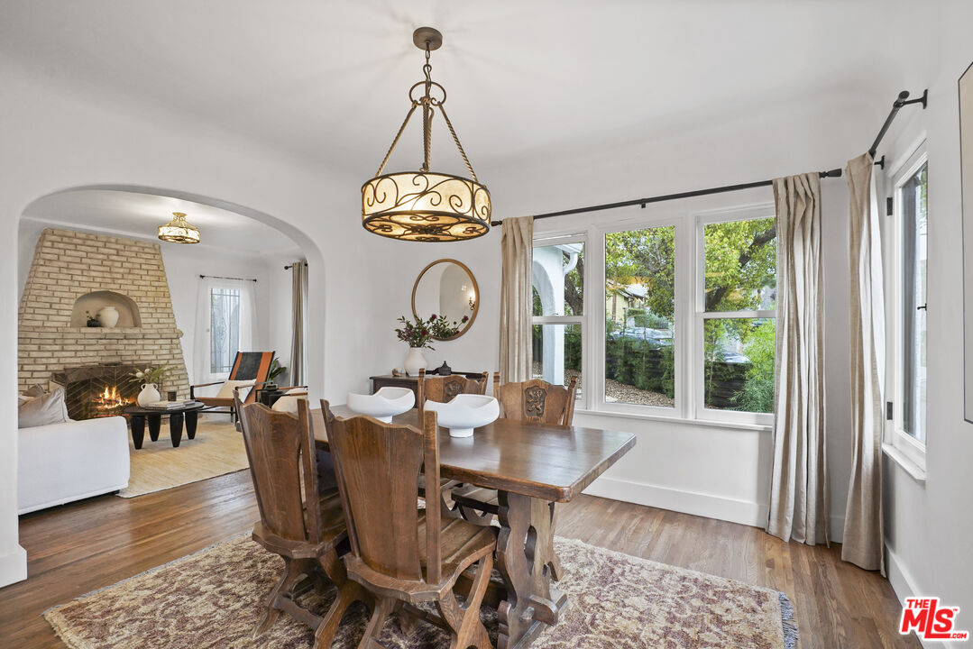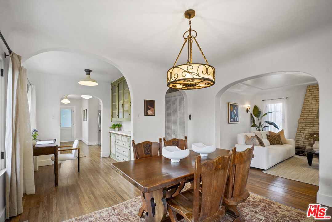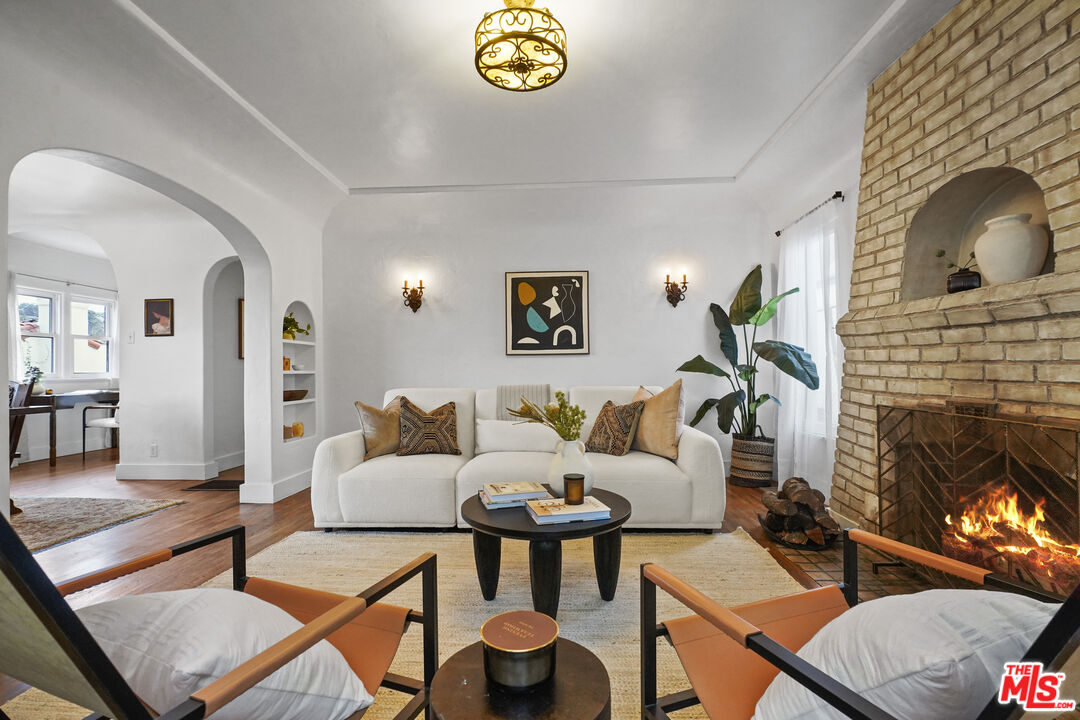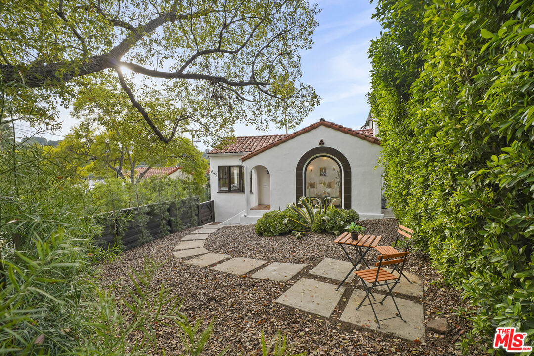 Behind its white stucco facade and red clay tile roof, 949 North Avenue 49 reflects the enduring appeal of Spanish architecture. Full of character, the home consists of a series of arches, hand-troweled plaster walls, and original hardwood floors which define the interior, while a large, fully fenced front yard sets the home back from the street and creates privacy along Avenue 49. The living room is anchored by a striking brick fireplace with an arched niche and working hearth. A large picture window draws in natural light, and curved openings lead to the dining room, preserving the home's original flow. The dining space sits beneath an iron fixture and connects directly to built-in cabinetry that adds storage without sacrificing character. In the breakfast room, glass-front built-ins and open shelving nod to the home's era. In the kitchen, updated appliances and clean-lined countertops sit comfortably within the existing architecture. Two bedrooms sit off the main hall. The primary includes a recently added half bath, large walk-in closet which is unusual for homes of this era and opens directly to the backyard. The full bath maintains detailing consistent with the home's architecture. The backyard has been landscaped with decomposed granite paths, garden boxes, wooden decks, and mature plantings. The layout separates areas for dining, gardening, and outdoor seating. A covered patio with red tile detail and a grill anchors the outdoor setting. The detached garage, finished with smooth walls, recessed lighting, two windows that look out onto the yard and can function as a studio, gym, or workspace. Located in the hills mere blocks from York Blvd. and its many charming shops and cafes in Highland Park, this two-bedroom, 1 1/4 bath home spans 1,171 square feet and preserves its original architectural detailing, along with outdoor space that extends how the property lives day to day.