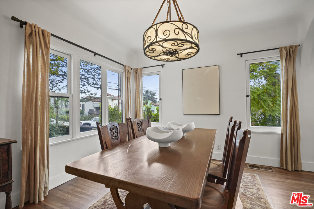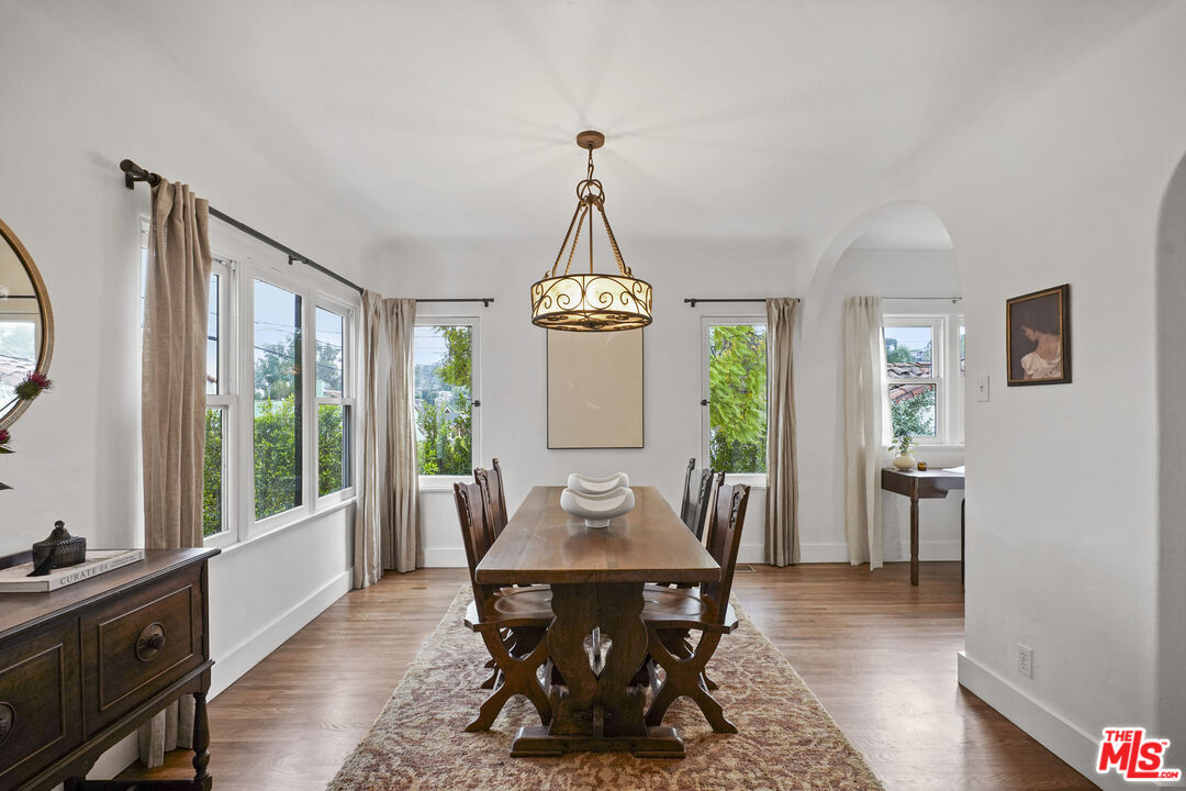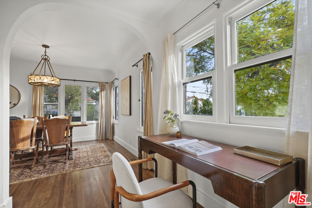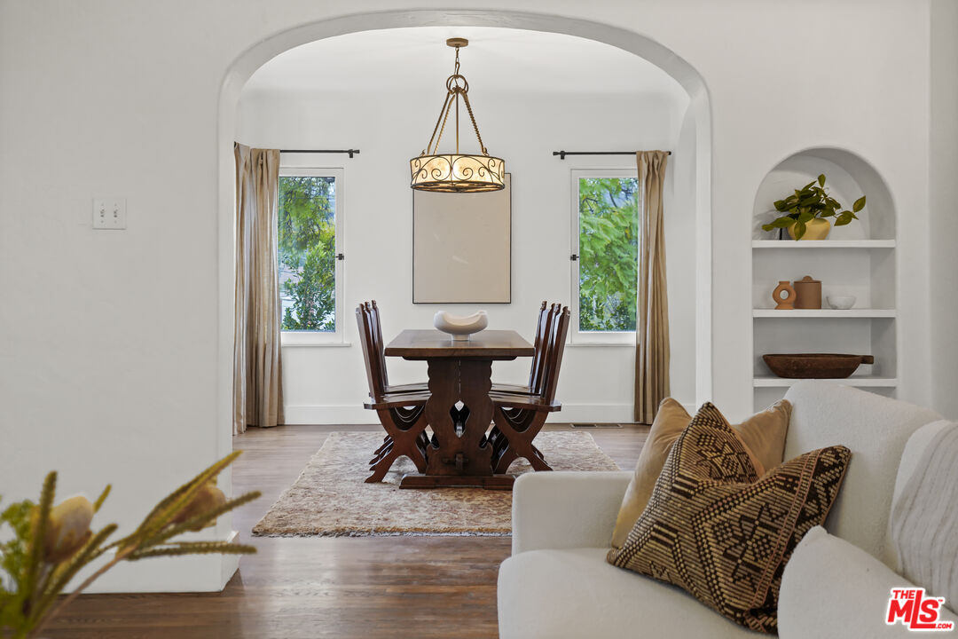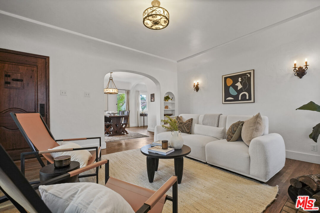 Behind its white stucco facade and red clay tile roof, 949 North Avenue 49 reflects the enduring appeal of Spanish architecture. Full of character, the home consists of a series of arches, hand-troweled plaster walls, and original hardwood floors which define the interior, while a large, fully fenced front yard sets the home back from the street and creates privacy along Avenue 49. The living room is anchored by a striking brick fireplace with an arched niche and working hearth. A large picture window draws in natural light, and curved openings lead to the dining room, preserving the home's original flow. The dining space sits beneath an iron fixture and connects directly to built-in cabinetry that adds storage without sacrificing character. In the breakfast room, glass-front built-ins and open shelving nod to the home's era. In the kitchen, updated appliances and clean-lined countertops sit comfortably within the existing architecture. Two bedrooms sit off the main hall. The primary includes a recently added half bath, large walk-in closet which is unusual for homes of this era and opens directly to the backyard. The full bath maintains detailing consistent with the home's architecture. The backyard has been landscaped with decomposed granite paths, garden boxes, wooden decks, and mature plantings. The layout separates areas for dining, gardening, and outdoor seating. A covered patio with red tile detail and a grill anchors the outdoor setting. The detached garage, finished with smooth walls, recessed lighting, two windows that look out onto the yard and can function as a studio, gym, or workspace. Located in the hills mere blocks from York Blvd. and its many charming shops and cafes in Highland Park, this two-bedroom, 1 1/4 bath home spans 1,171 square feet and preserves its original architectural detailing, along with outdoor space that extends how the property lives day to day.