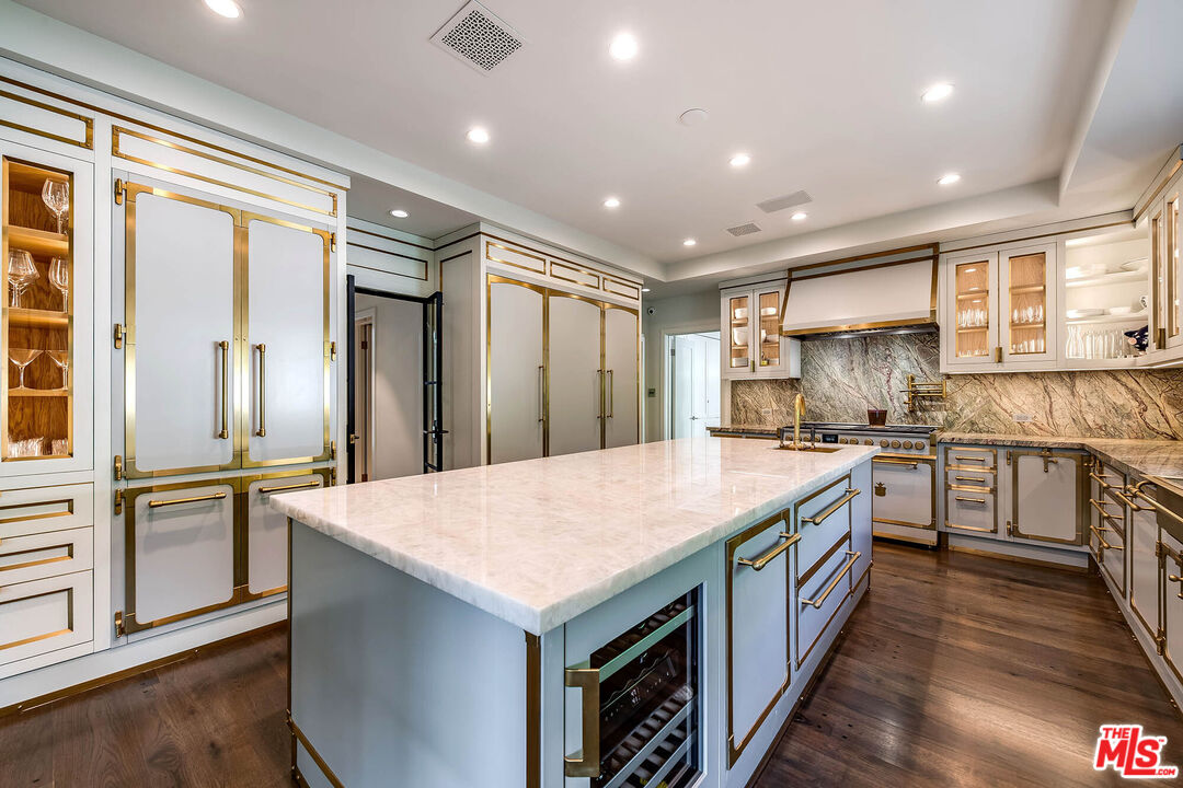 Situated within the prestigious guard-gated enclave of Hidden Valley Estates, surrounded by the homes of Hollywood's most notable residents, this stately East Coast-inspired traditional estate is a true jewel - thoughtfully reimagined to blend timeless architecture with refined modern comforts. Privately walled and gated, the residence offers exceptional seclusion and a pristine, elegant facade that sets a distinguished tone upon arrival. A gated driveway leads to a two-car garage, while a beautifully landscaped gated front courtyard creates a gracious and welcoming approach. The interiors reveal meticulous craftsmanship throughout, where imported stone, rich wood detailing, and contemporary lighting create a warm yet sophisticated atmosphere. A full-house Sonos sound system provides seamless audio throughout the residence, enhancing both everyday living and entertaining. The designer kitchen is a true culinary showpiece, appointed with burnished brass fixtures, striking forest-green marble, and a magnificent Officine Gullo cooking range as its centerpiece. The formal living room exudes character and refinement, featuring a dramatic stone fireplace, coffered wood ceilings, and custom steel-and-glass architectural accents. Expansive glass doors allow the family and dining rooms to flow seamlessly outdoors, creating effortless indoor-outdoor living. The grounds have recently undergone a complete redesign with newly refreshed landscaping, creating an immaculate outdoor setting. The backyard offers a sparkling pool and spa, generous lawn, al fresco dining areas, and a full outdoor kitchen complete with built-in barbecue, sink, and wine refrigerator, perfect for entertaining. One of the estate's most notable amenities is the recently renovated championship tennis court with lights, providing a beautifully upgraded setting for both daytime and evening play. Upstairs, the expansive primary suite serves as a tranquil retreat with a fireplace, lounge area, spa-inspired marble bath with soaking tub and shower, and an impressive dual closet and dressing room. Two additional bedrooms occupy the second level, while the third floor features a dedicated gym or additional bedroom suite. Additional amenities include intimate lounge and seating areas throughout and private access to the scenic hiking trails of nearby Franklin Canyon Park, offering a rare combination of privacy, elegance, and natural beauty in one of Los Angeles's most coveted communities.