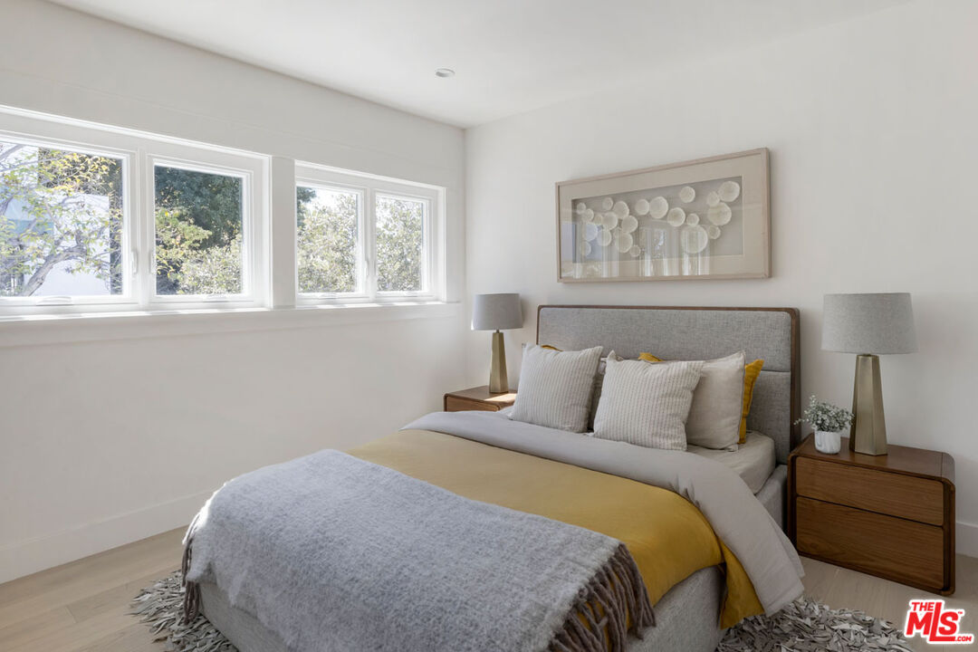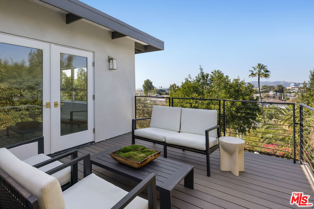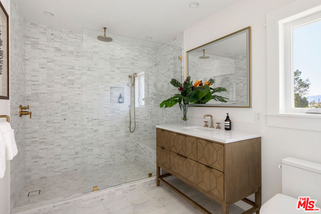 In Silver Lake, a newly renovated 1912 Craftsman bungalow with cinematic views of Griffith Park and the Hollywood Sign. The light-filled living space feels expansive, with French doors opening to decks with panoramic vistas; white oak floors, original built-ins, and a decorative brick fireplace add warmth and character. Entertaining is easy with a bright kitchen featuring Thor appliances, white cabinetry, and open flow to the spacious dining area. Three main-level bedrooms include a serene primary suite with a walk-in closet and access to the private deck. Head downstairs to find a fourth bedroom and full bath, plus a large flex space with exposed concrete walls and polished floors, perfect for creative work or a media lounge. The terraced yard is the consummate setting for gathering and relaxing, with multiple patios, a grassy play area, and lush plantings. Amenities include HVAC and driveway parking, all just moments from Erewhon, Sunset Junction, Sqirl, and Courage Bagels.