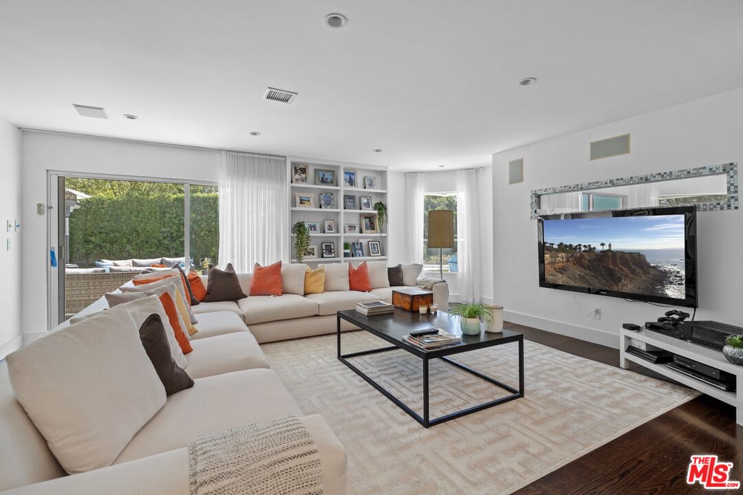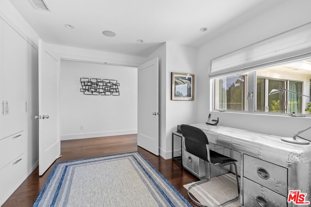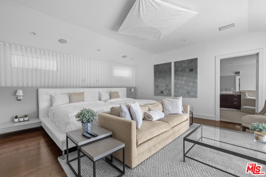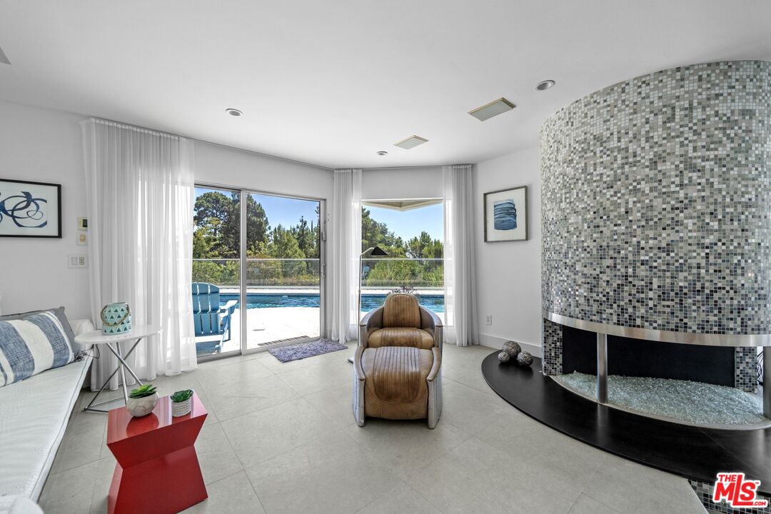 This elegant, single-level contemporary home, located minutes from Rodeo Drive, is gated and set back from the street, offering both privacy and security. The open floor plan effortlessly merges the living, dining, and family areas, creating a perfect space for both entertainment and quiet relaxation. Walls of glass open to a serene outdoor oasis, featuring a sparkling pool, spa, and picturesque views, seamlessly blending indoor and outdoor living. The chef's kitchen is equipped with state-of-the-art stainless-steel appliances and features a large center island, creating an ideal space for cooking and gathering. The primary suite offers a private retreat with its own office area, and a spacious spa-style bathroom complete with double sinks, a vanity, and a steam shower. The lower level features a gym and a two-car garage, while the gated driveway offers ample additional parking.