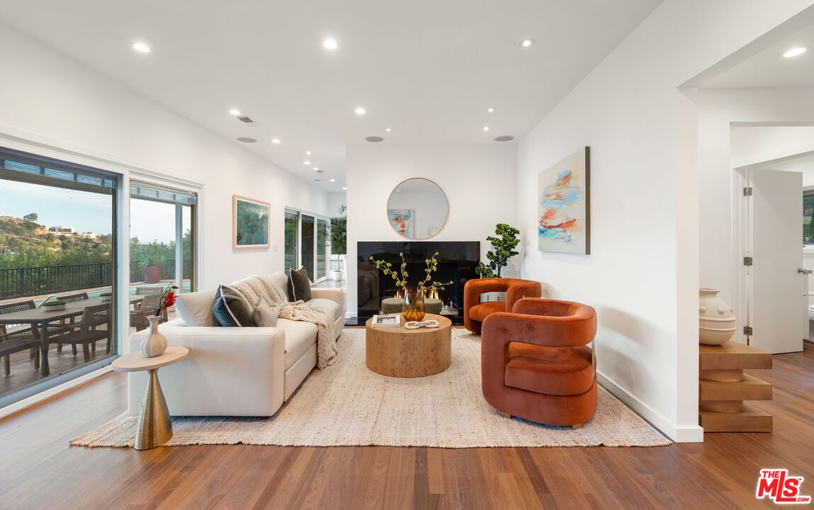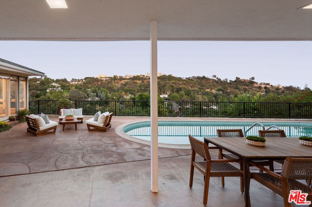 Tucked away in Brentwood Hills, this traditional single-story residence captures sweeping vistas of the surrounding canyons, the Getty Museum, and the city beyond. Designed for seamless indoor-outdoor living, sliding glass doors frame the rolling canyon vistas, creating the perfect blend of traditional comfort and contemporary lifestyle. Kenfield Avenue is one of the most desirable streets in the area as it sits on a cul-de-sac, making it safe for families and children, as well as private with no through traffic. A large family and living room welcomes you, framed by serene views of the pool and views through expansive glass doors. The living room is anchored by a cozy fireplace and opens effortlessly to the dining area, which also provides outdoor access. The dining area connects to the kitchen and includes bar seating, perfect for everyday living or entertaining guests. The kitchen features quartz countertops, a Sub-Zero refrigerator, stainless steel appliances, custom cabinetry, and convenient access to a separate laundry room with its own sink. A powder room is located nearby for guests. A separate spacious den, currently used as an office, adds versatility to the home and includes its own outdoor access. The primary suite is spacious, with vaulted ceilings and corner windows capturing some of the best views in the home of the surrounding hillsides. Sliding glass doors provide direct access from the primary suite to the outdoors. The primary spa-like bathroom features dual vanities, a soaking tub, a frameless glass shower, and generous storage including a walk-in closet and additional hallway closets. Two additional bedrooms, each with en suite bathrooms, complete the interior. Outside, panoramic views and ample patio space make for a serene setting to relax, unwind, or enjoy alfresco dining by the large kidney-shaped pool. The home also includes a large driveway, an attached two-car garage, secure side and backyard access, and built-in 5.1 surround sound speakers throughout. Just minutes from all that Brentwood and the Westside have to offer, turnkey homes with views like these are rare to find.