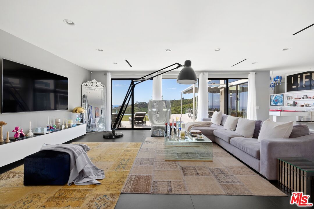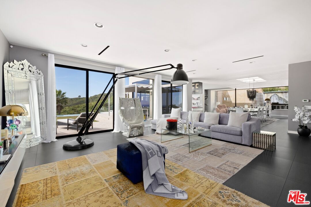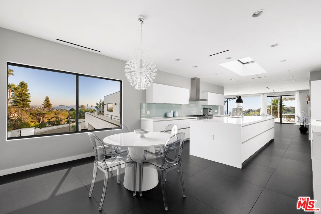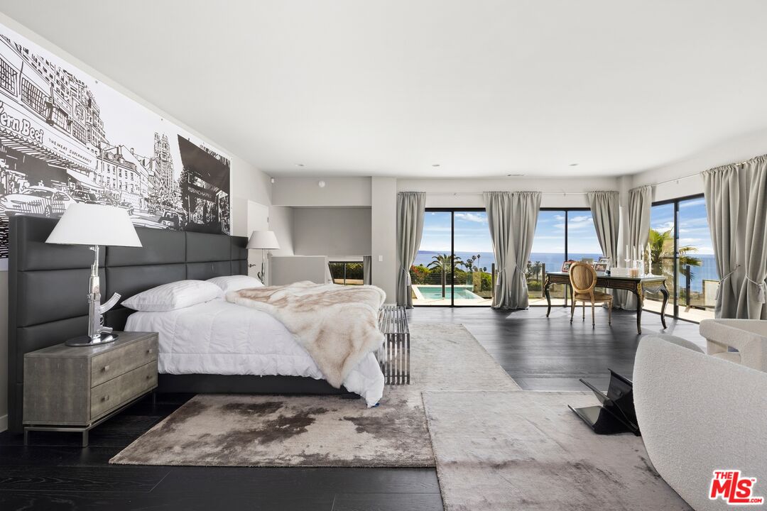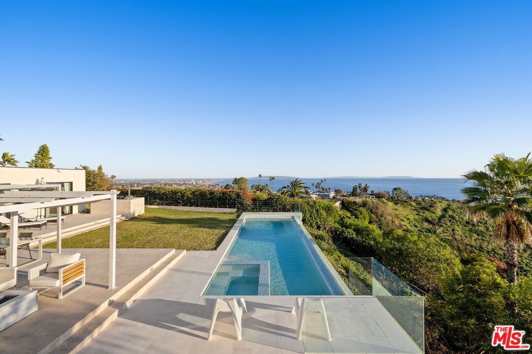 Breathtaking architectural estate with panoramic ocean views set at the end of a quiet cul-de-sac in Pacific Palisades. Capturing spectacular 180-degree views of the Pacific Ocean, coastline, Catalina Island, and sparkling city lights from nearly every room, this striking 5-bedroom, 6-bath residence spans approximately 7,631 square feet of refined contemporary living on an expansive 0.46-acre lot. Walls of glass frame the dramatic scenery while filling the interiors with natural light and creating seamless indoor-outdoor flow. Designed for both grand-scale entertaining and relaxed coastal living, the home features expansive open living spaces, soaring ceilings, and sophisticated modern finishes throughout. The spectacular outdoor setting showcases a resort-style infinity pool and spa, expansive terraces, lounge areas, and fire features perfectly positioned to capture breathtaking sunsets over the Pacific. Inside, the residence offers elegant entertaining spaces, including a dramatic great room with ocean views, a striking formal dining room illuminated by skylights, and a sleek chef's kitchen with oversized island and premium appliances. Additional highlights include a state-of-the-art home theater, dedicated fitness studio, spacious guest accommodations, and multiple indoor-outdoor entertaining areas designed for effortless luxury living. The impressive primary suite serves as a private ocean-view retreat, offering a serene atmosphere that embodies the best of the Southern California coastal lifestyle complete with soaking tub and steam room. Rarely does a property combine architectural design, panoramic ocean views, and cul-de-sac privacy in one of the most desirable locations in Pacific Palisades. An exceptional opportunity to own a spectacular view estate moments from world-class beaches, scenic hiking trails, and Palisades Village. The home is also equipped with a solar panel system that helps offset utility consumption, contributing to greater energy efficiency.