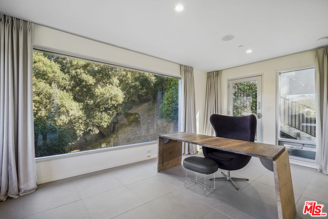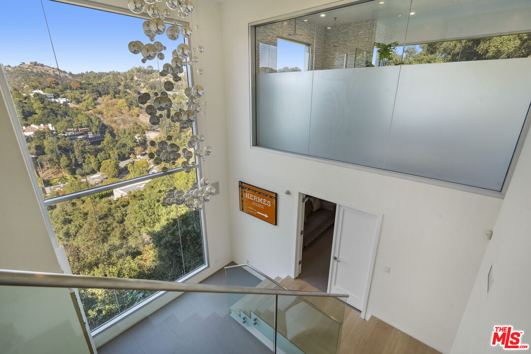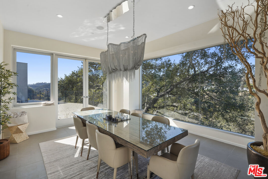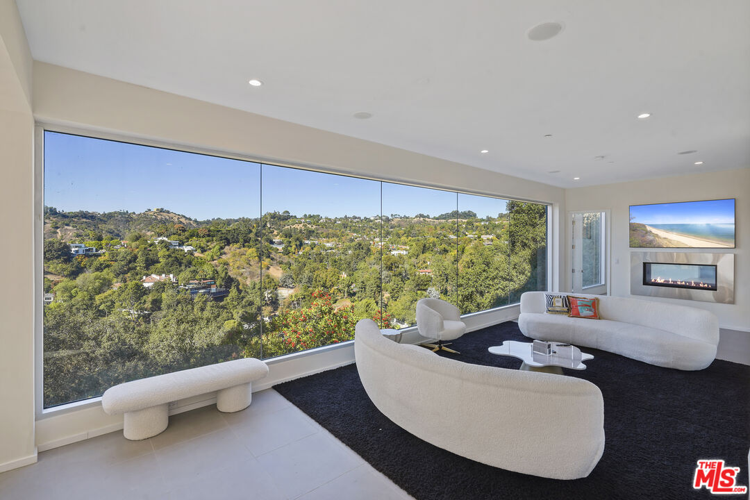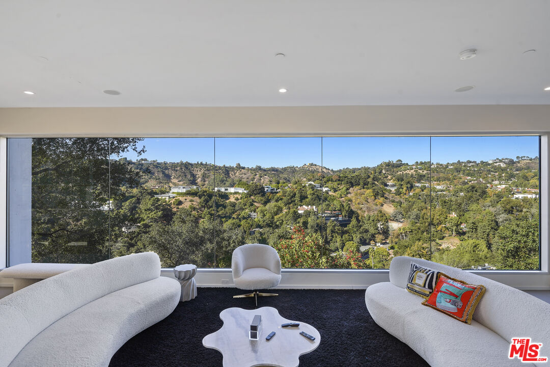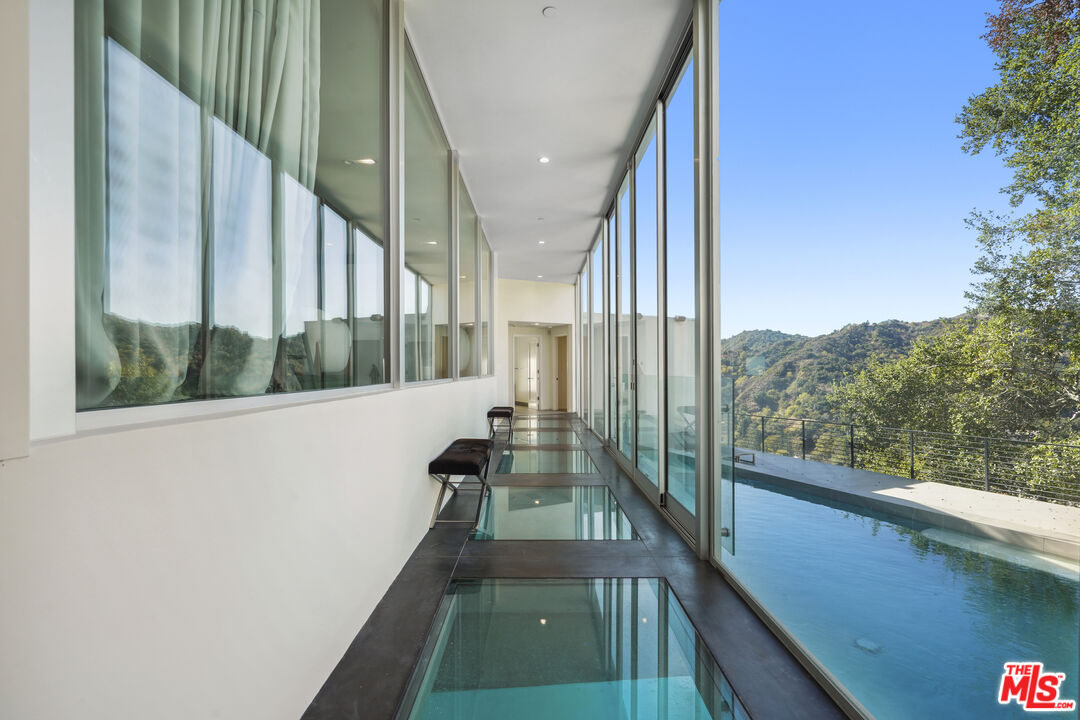 Suspended above the city within one of Beverly Hills' most exclusive, celebrity-favored gated enclaves, 9716 Oak Pass Road is a striking contemporary estate offering exceptional privacy, architectural distinction, and breathtaking panoramic views. The community is gated, and the residence itself is further secured behind its own private gate and drive, creating a rare and dramatic sense of arrival. Spanning approximately 6,244 square feet across three dramatic levels, this modern sanctuary is wrapped in walls of glass that capture canyon vistas from nearly every room, delivering a seamless indoor-outdoor lifestyle throughout. A signature architectural highlight is the glass-enclosed skybridge hallway suspended above the infinity-edge pool, serving as a sculptural centerpiece on the main level and elevating the home to true statement-level design. The residence offers a total of four bedrooms, including an expansive and private primary suite retreat with commanding views, oversized walk-in closets, and a spa-inspired bath. Three additional guest bedroom suites provide exceptional comfort and privacy. Designed for both refined daily living and elevated entertaining, the home features a gourmet chef's kitchen, sophisticated formal and informal living areas, a private executive office anchored by a dual-sided fireplace, and a dedicated private theatre/media room. Multiple view terraces and decks extend the living experience outdoors, while the floating infinity-edge pool appears to merge with the skyline, creating a resort-style setting high above Beverly Hills. Set among notable neighbors within an elite and discreet hillside enclave, this exceptional contemporary residence delivers a rare combination of privacy, prestige, and iconic architecture on one of Beverly Hills' most coveted streets.