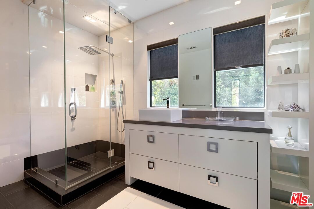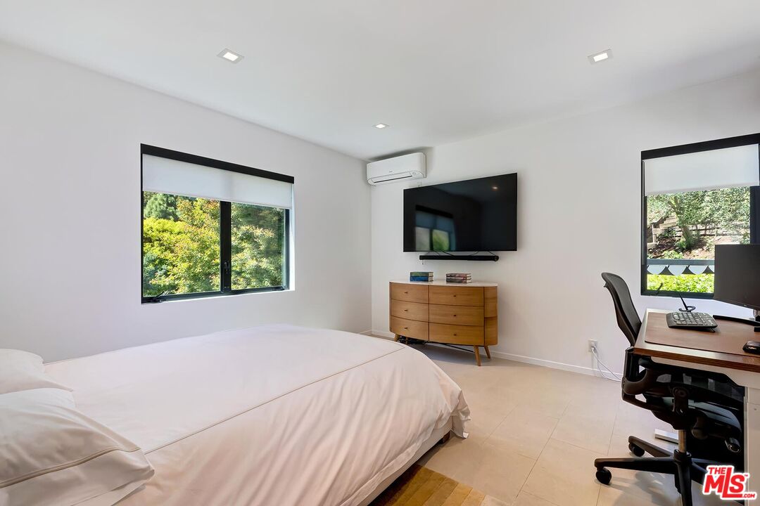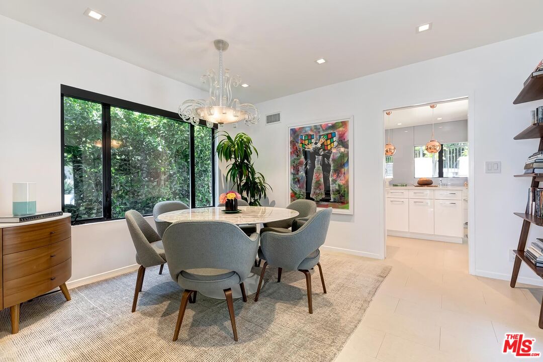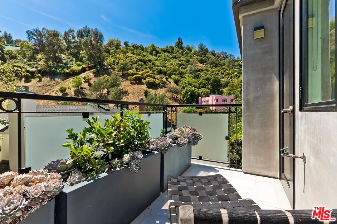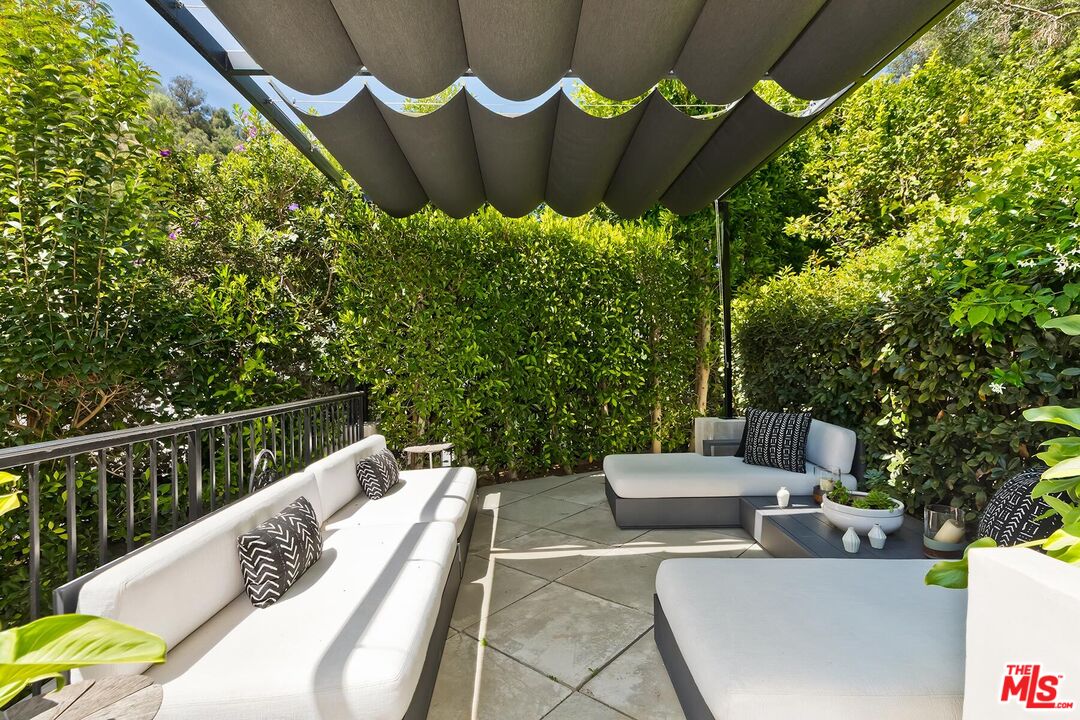 Experience refined contemporary living in this beautifully designed residence, ideally situated just minutes from the heart of Beverly Hills. Beautiful entry welcomes you with an elegant spiral staircase and exquisite travertine flooring, setting the tone for the home's sophisticated style. The light-filled living room features dramatic walls of glass that seamlessly open to serene patio spaces, perfect for effortless indoor-outdoor entertaining. A formal dining room offers an elegant setting for gatherings, while the chef's kitchen is appointed with top-of-the-line appliances and designed for both function and beauty. A stylish powder room completes the main level.The spectacular primary suite is a private retreat, boasting dual bathrooms, an expansive custom-fitted closet, and a versatile sitting room or office. Step out onto the private terrace and enjoy tranquil treetop views. A well-appointed second bedroom suite provides comfort and privacy for family or guests. Outdoors, professionally landscaped gardens create a lush, romantic setting, highlighted by a charming pergola ideal for al fresco dining or relaxation. 2-car garage. A rare opportunity to enjoy sophisticated living in one of the city's most coveted locations.